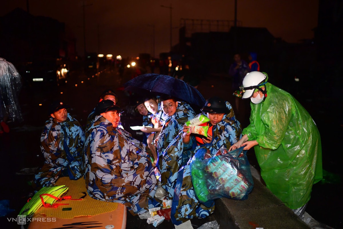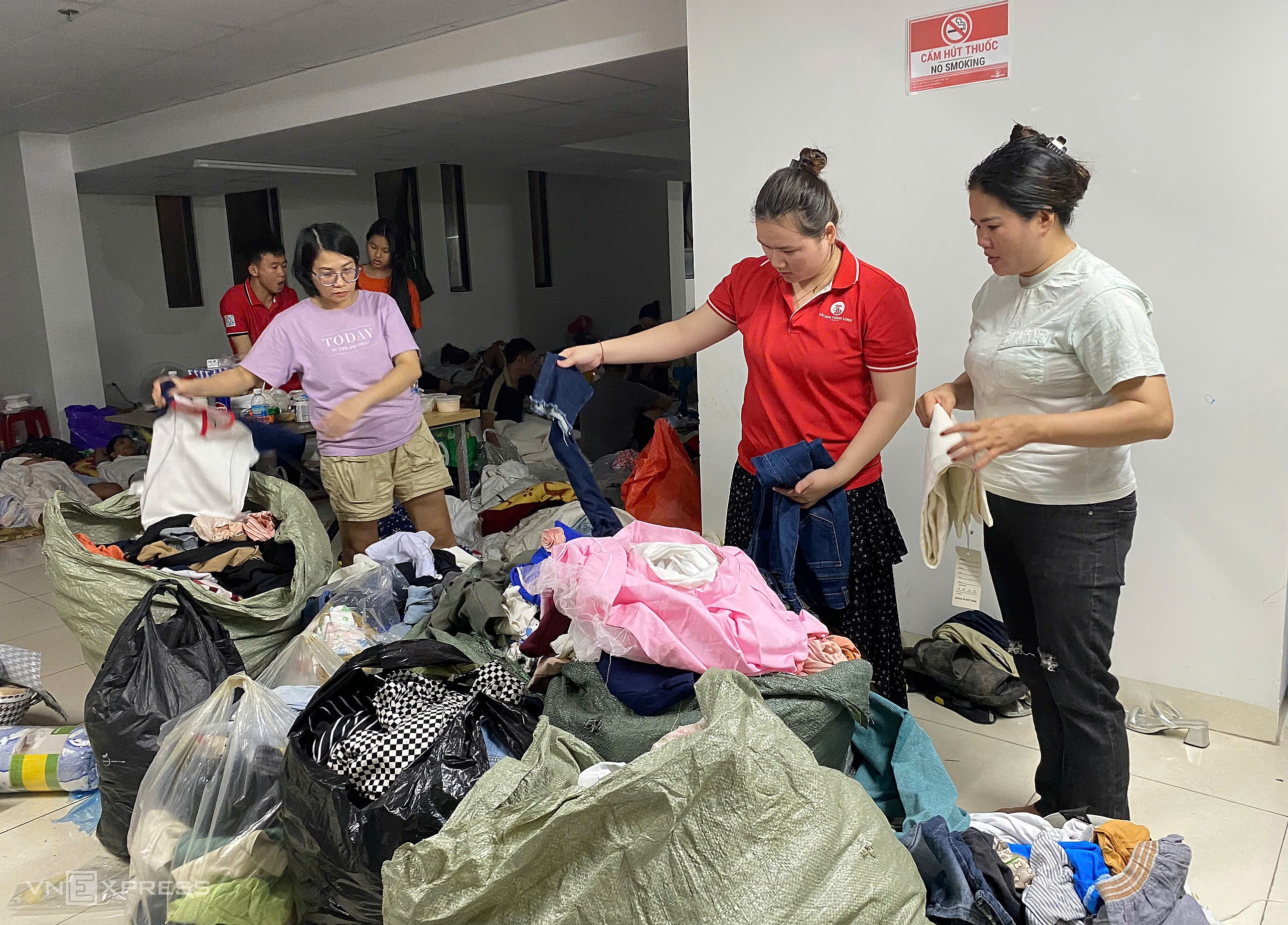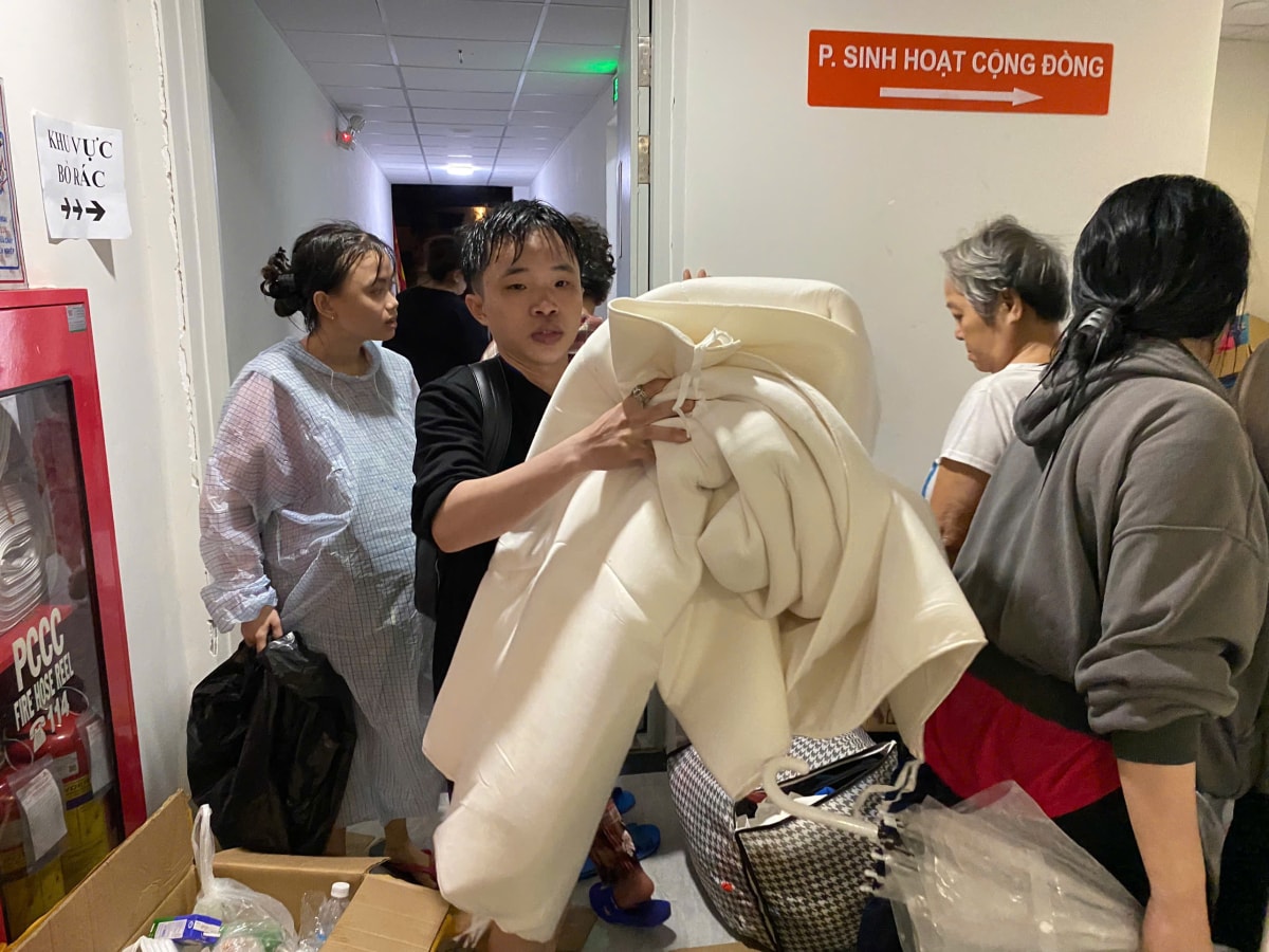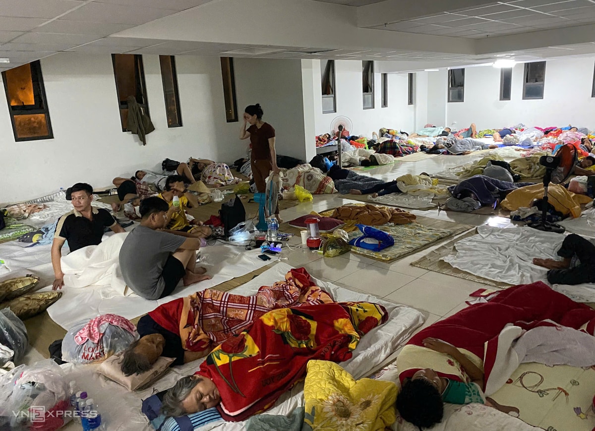 Tại điểm lánh nạn, người chạy lũ kiệt sức nằm la liệt, trong khi phía ngoài trời mưa, nhiều trường hợp vẫn ngóng chờ lực lượng cứu hộ đưa thân nhân khỏi vùng ngập sâu.