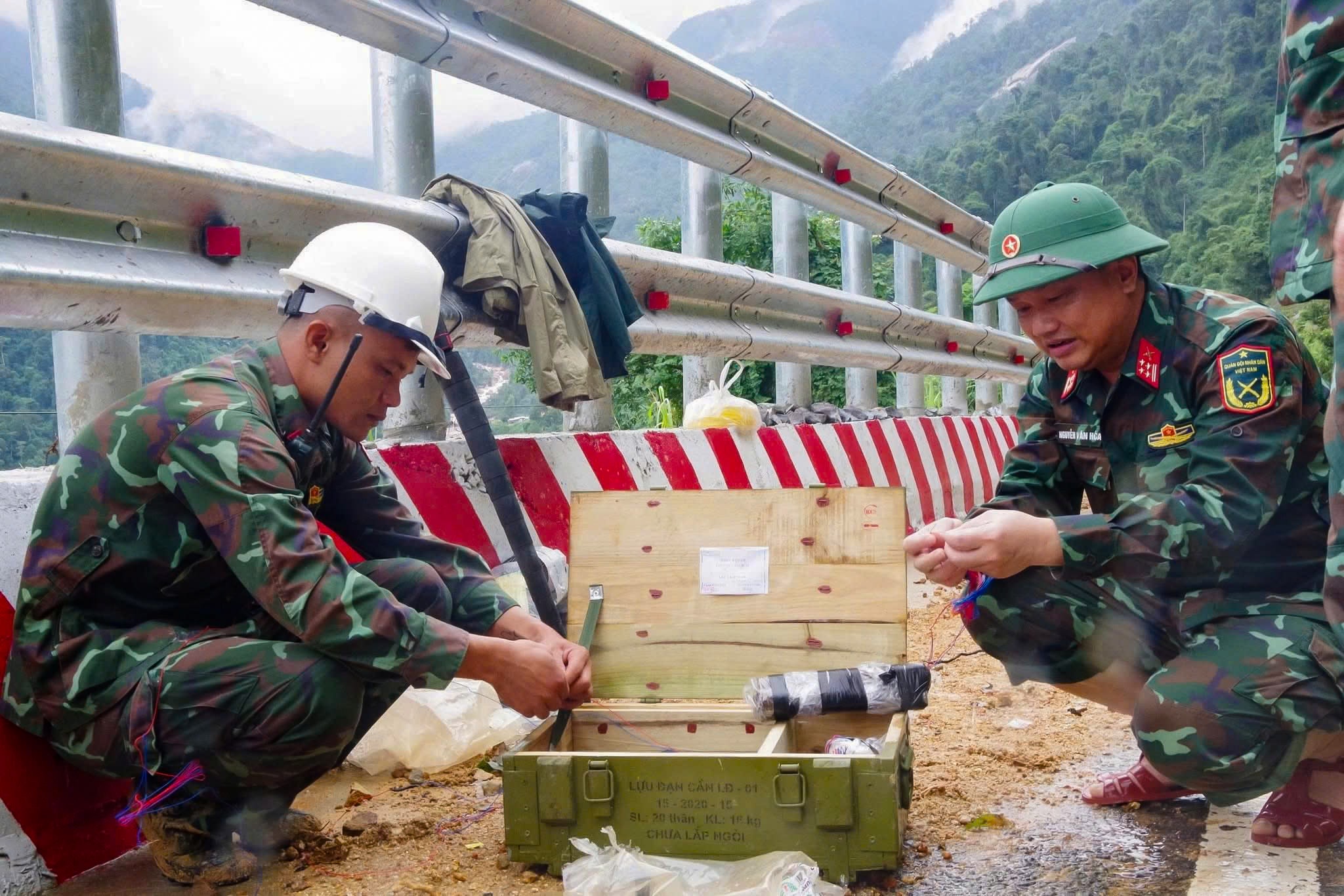 Quân đội cho nổ mìn phá những đá lớn chắn ngang đèo Khánh Lê. Video: Bùi Toàn - Tuấn Việt
