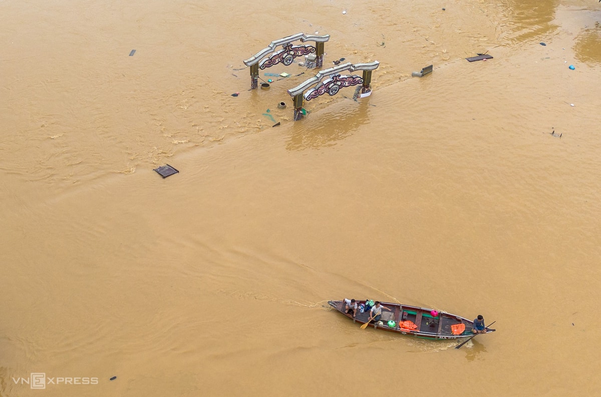Cầu An Hội qua sông Hoài, nối khu phố cổ và khu chợ đêm Nguyễn Hoàng, ngập hơn 2 m, chỉ còn lại chóp trang trí, sáng 30/10. Lũ sau đó rút, nhưng đến trưa 3/11 lên lại, chỉ còn cách mức lũ bốn ngày trước khoảng 0,7 m. Người dân dùng ghe, thuyền để vượt sông Hoài.