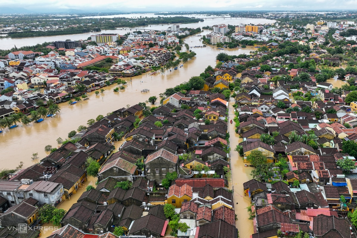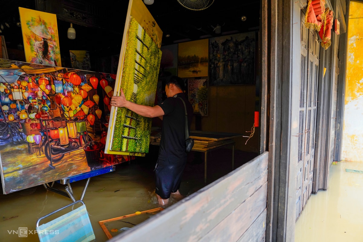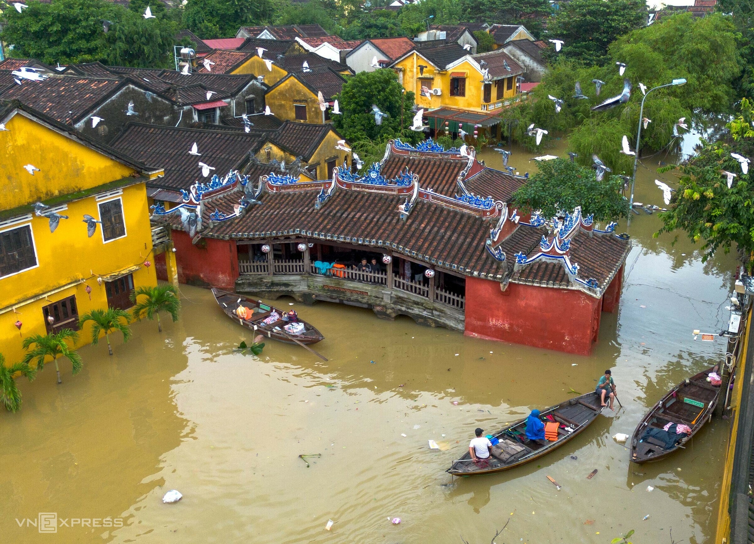 Nước lũ bắt đầu tràn vào phố cổ Hội An từ rạng sáng 27/10. Sau vài giờ, phố cổ hai bên sông Hoài bị ngập 1-2 m. Tàu thuyền vội vã đưa du khách, người dân thoát khỏi vùng ngập sâu. Nhiều người dân, hộ kinh doanh dọn tài sản lên cao ngang đợt lũ gần nhất năm 2007.