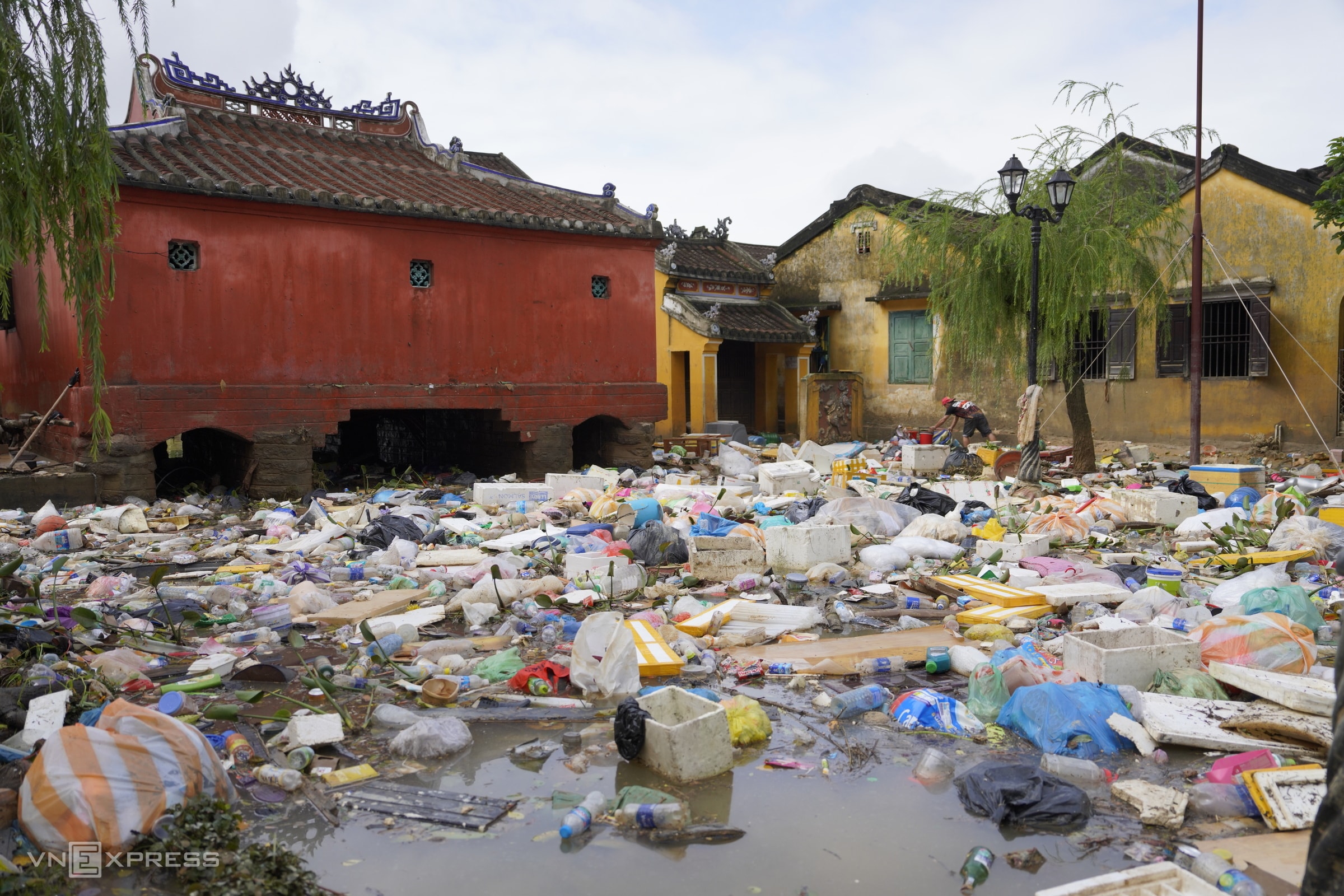 Người dân Hội An chưa dọn lũ xong thì lại phải đón trận lũ mới. Những túi rác được dọn tạm ra bên ngoài đường, chưa được thu gom, lại nổi lềnh bềnh khắp khu phố cổ. Nhiều người dân phải canh con nước để đẩy rác tránh trôi vào nhà.