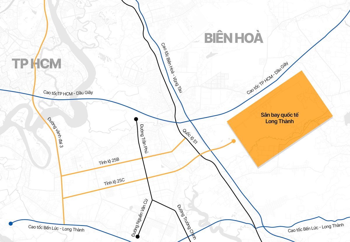 Tỉnh lộ 25C qua xã Long Thành, Nhơn Trạch là tuyến kết nối trực tiếp với đường T1 sân bay Long Thành tại nút giao quốc lộ 51. Dự án có tổng vốn đầu tư khoảng 1.200 tỷ đồng, rộng 8 làn, dự kiến khánh thành cuối năm 2025.