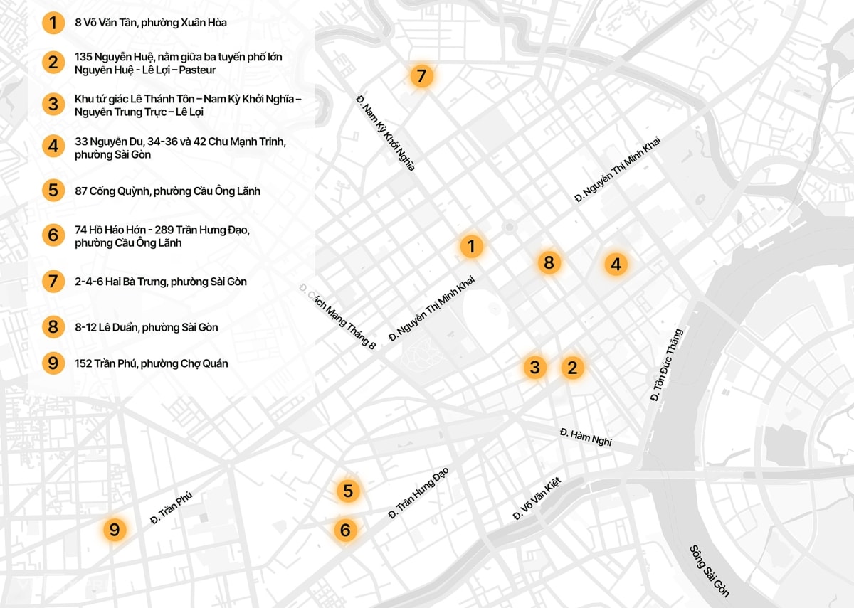 Vị trí 9 khu đất làm công viên, vườn hoa dịp Tết Bính Ngọ. Đồ họa: Tâm Thảo