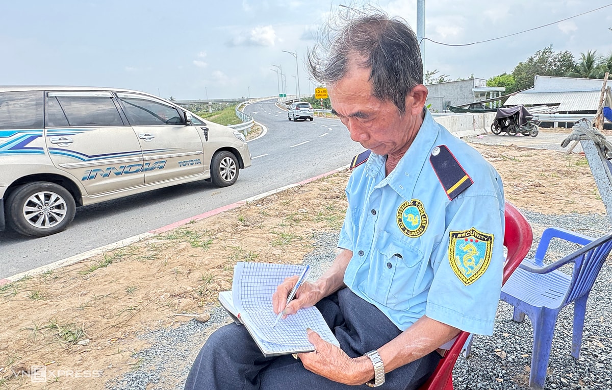 Ông Huỳnh Diệp, cán bộ trực hướng dẫn giao thông và đếm lượng phương tiện vào điểm đầu cao tốc Cần Thơ - Cà Mau.