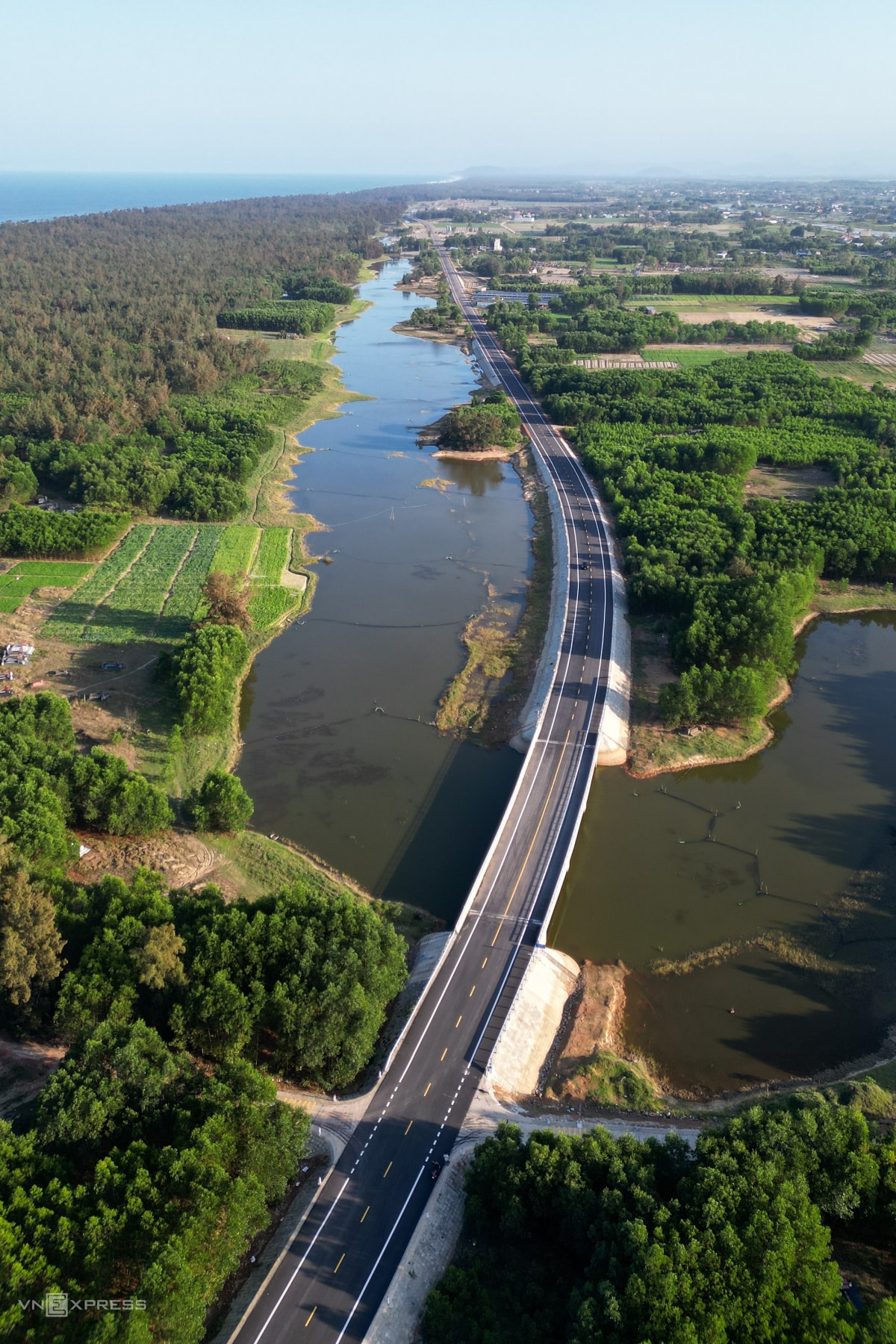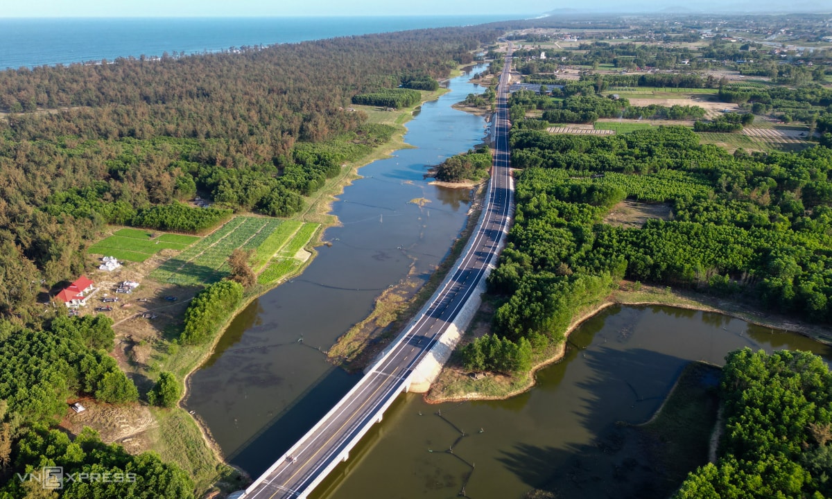 Tuyến đường ven biển Quảng Ngãi dài hơn 100 km, tổng vốn 5.600 tỷ đồng, băng qua rừng dương, vượt sông Trà Khúc và sông Vệ, kết nối Dung Quất - Chu Lai - Sa Huỳnh.