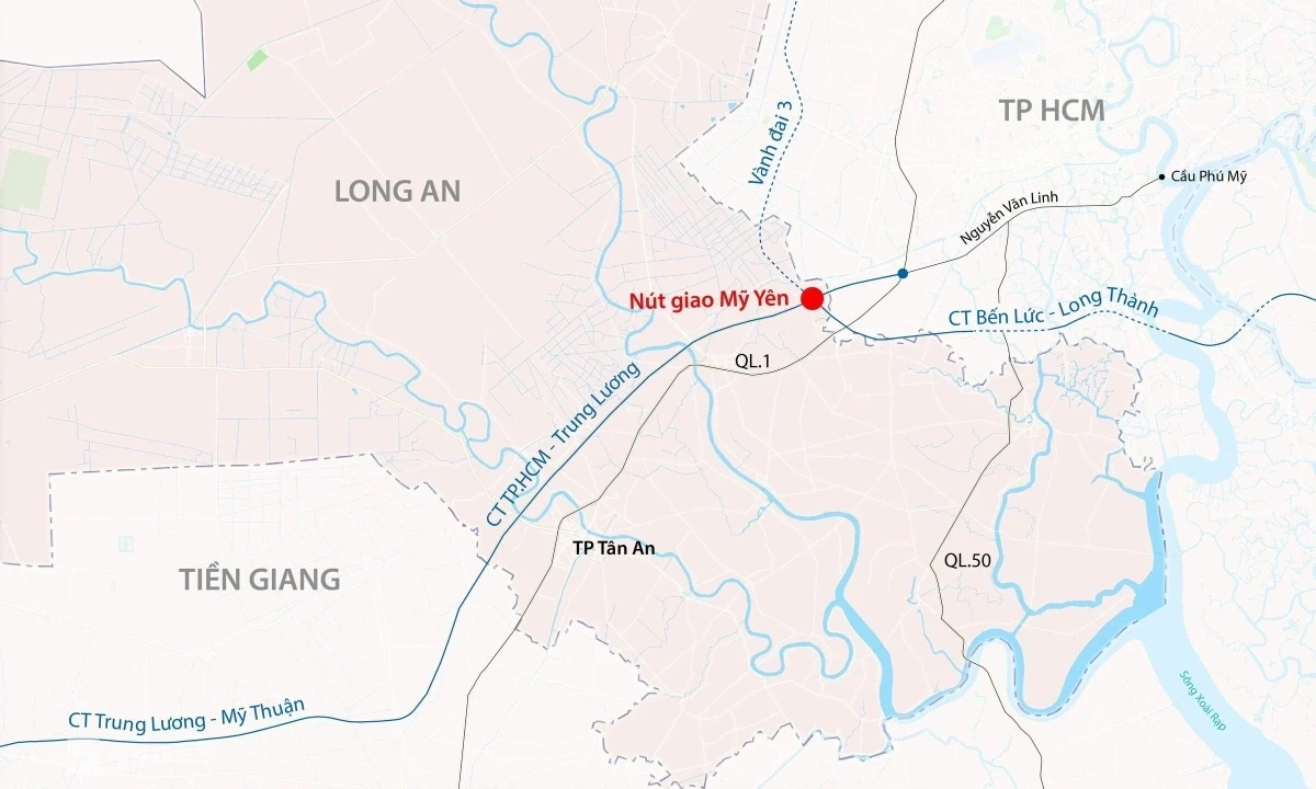 Vị trí nút giao Mỹ Yên kết nối ba cao tốc qua TP HCM. Đồ hoạ: Đăng Hiếu