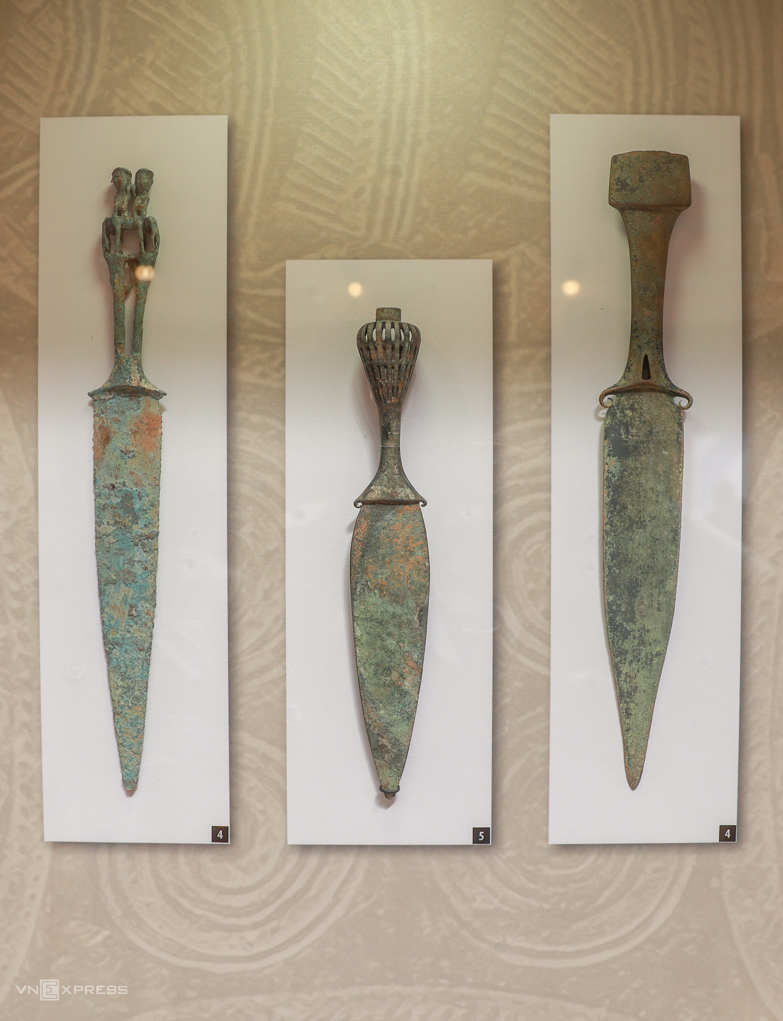 Triển lãm trưng bày hai loại hình vũ khí đánh gần (dao găm, rìu chiến) và vũ khí đánh xa (mũi giáo, mũi lao, mũi tên). Trong ảnh là những chiếc dao găm đủ kích thước, với phần chuôi được chế tác nhiều hình tượng của nhà sưu tập Lâm Bảo Ngọc.