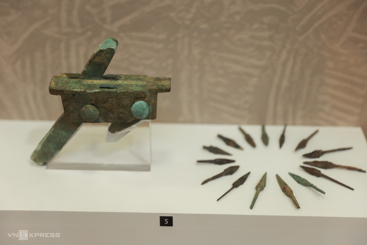 Bộ vũ khí đánh xa gồm mũi tên và lẫy nỏ của ông Mai Sĩ Tất Thắng. Các loại vũ khí này minh chứng cho trình độ kỹ thuật luyện kim của người Việt hơn 2.500 năm trước.