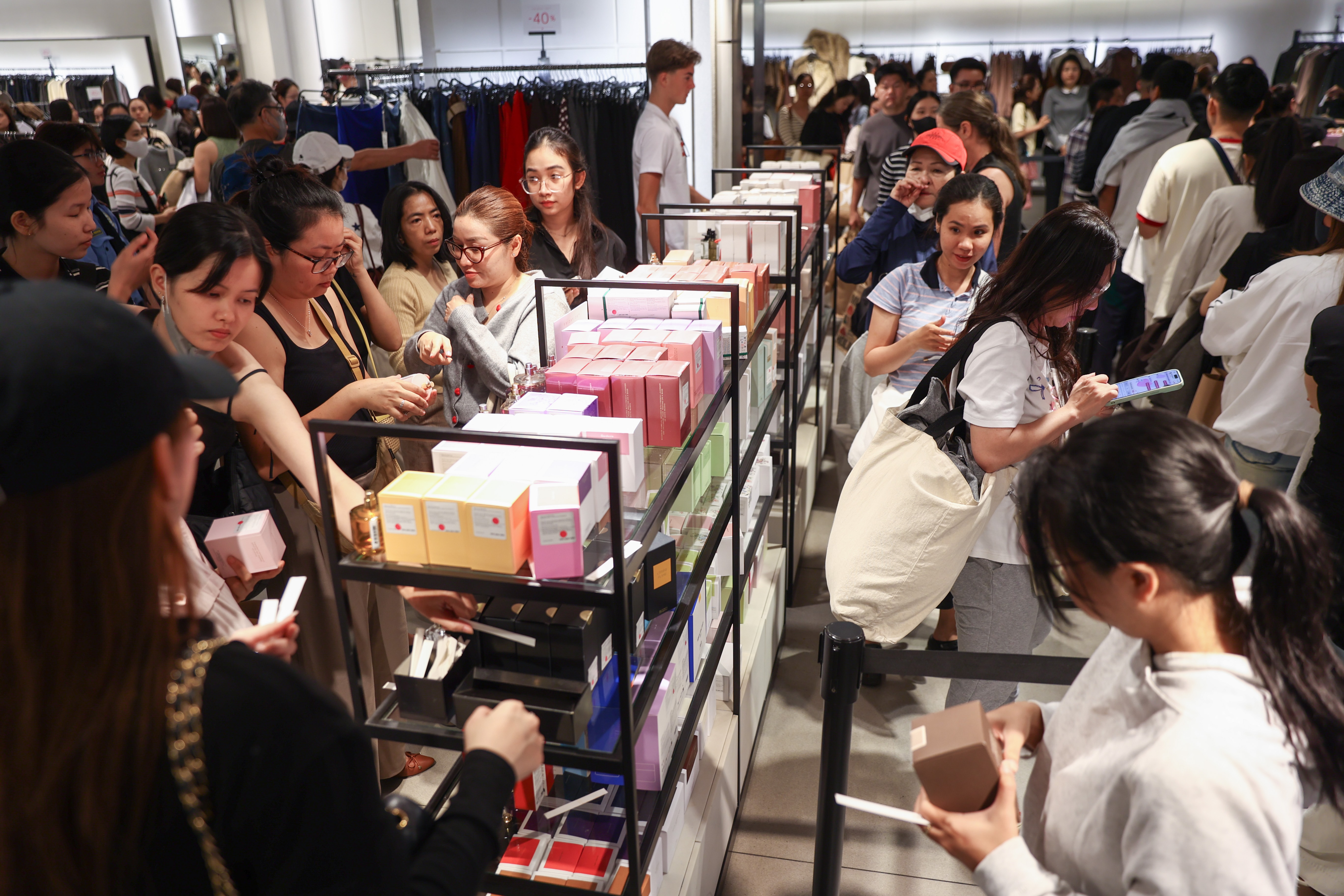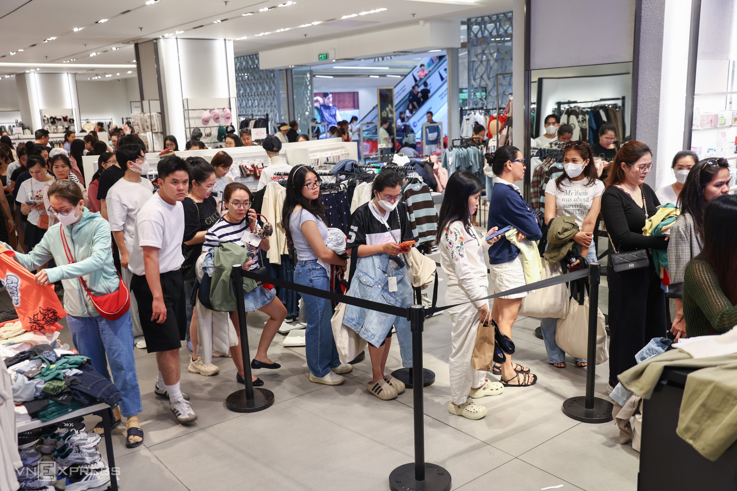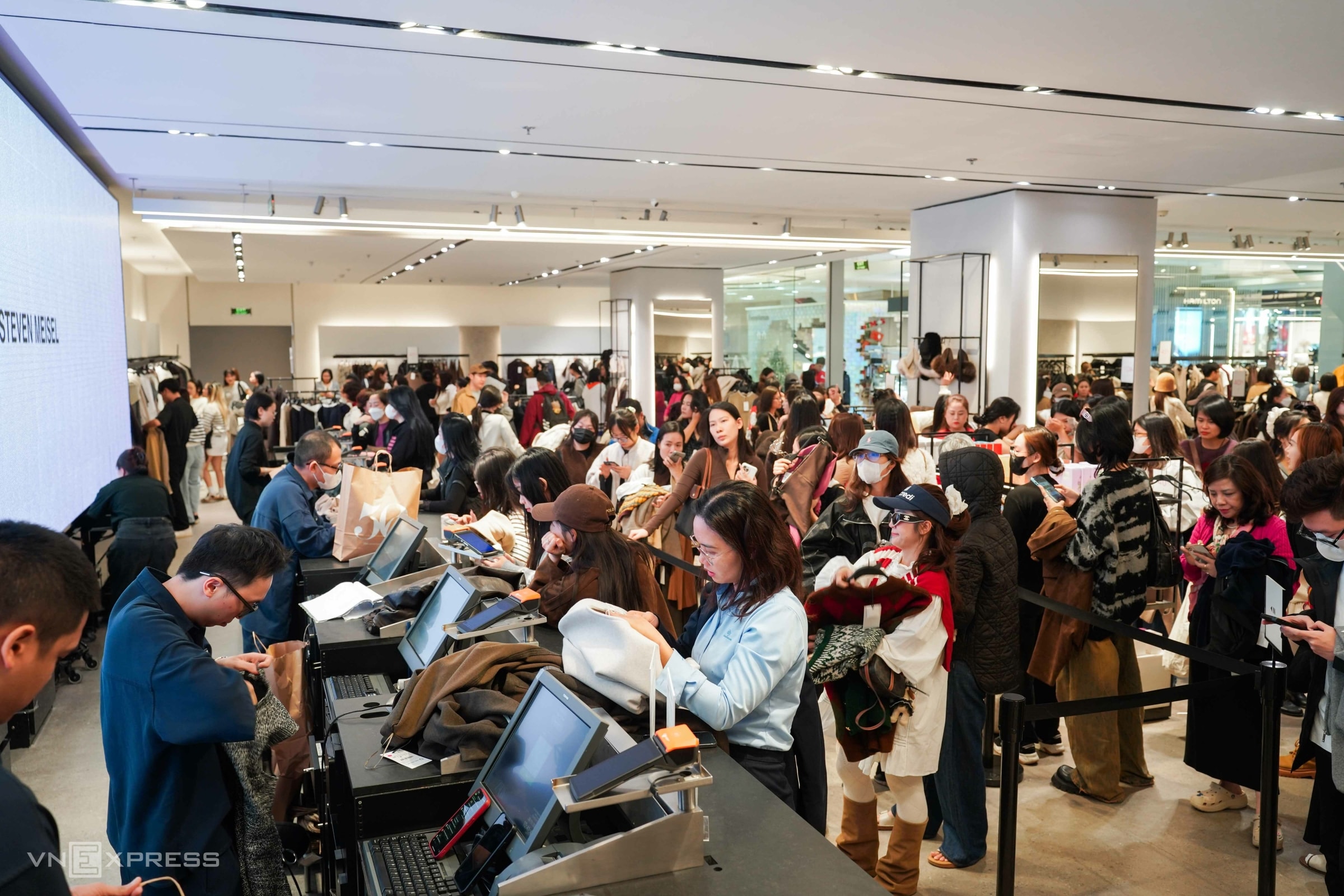 Từ sáng sớm ngày Black Friday, nhiều trung tâm thương mại ở TP HCM và Hà Nội đã kín khách đến mua đồ giảm giá, những dòng người xếp hàng dài chờ tính tiền.