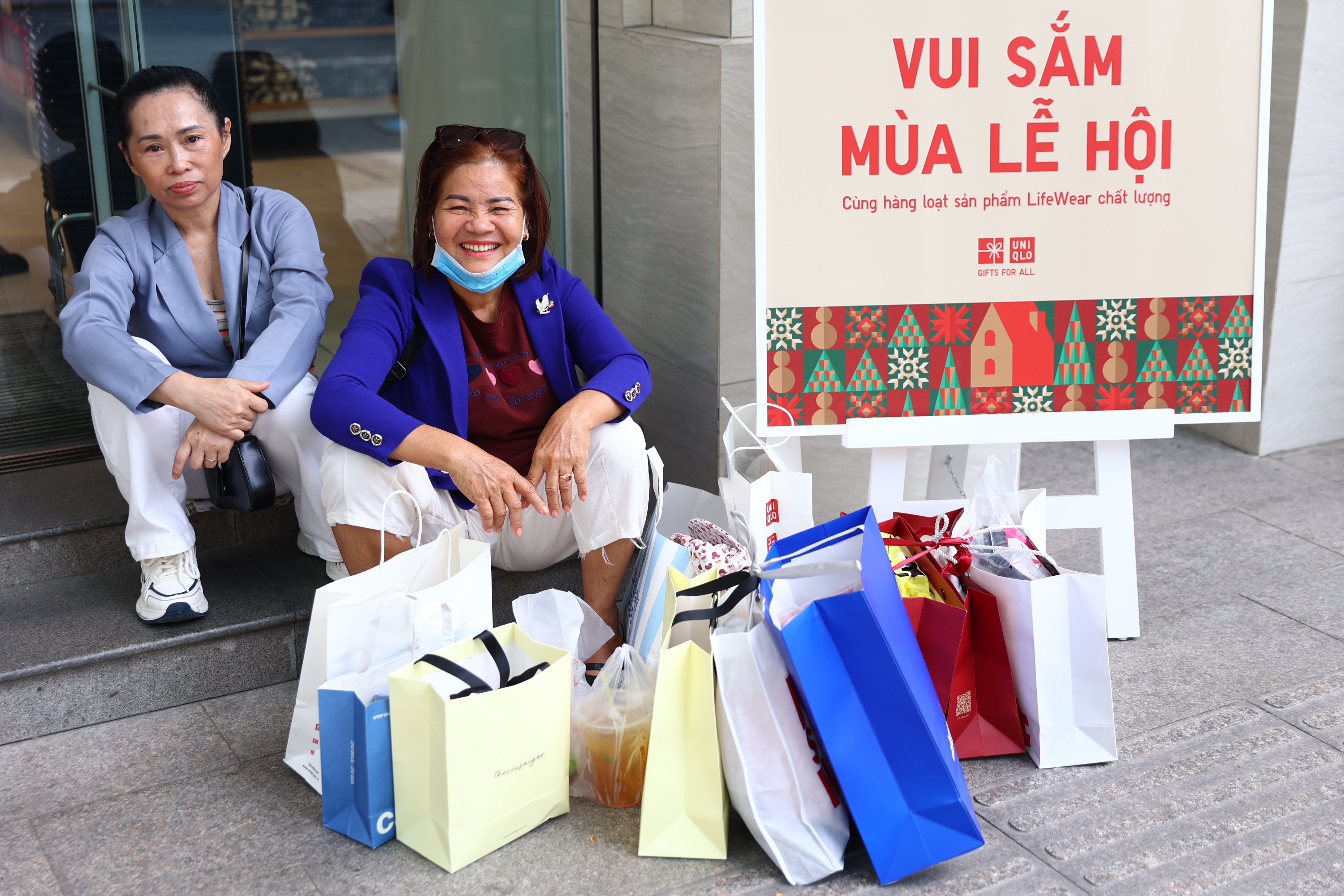 Người mua hàng nghỉ chân, bên cạnh nhiều túi đồ đã lựa chọn. Hôm nay, nhiều trung tâm thương mại mở cửa tới 23h thay vì 22h như thường lệ.