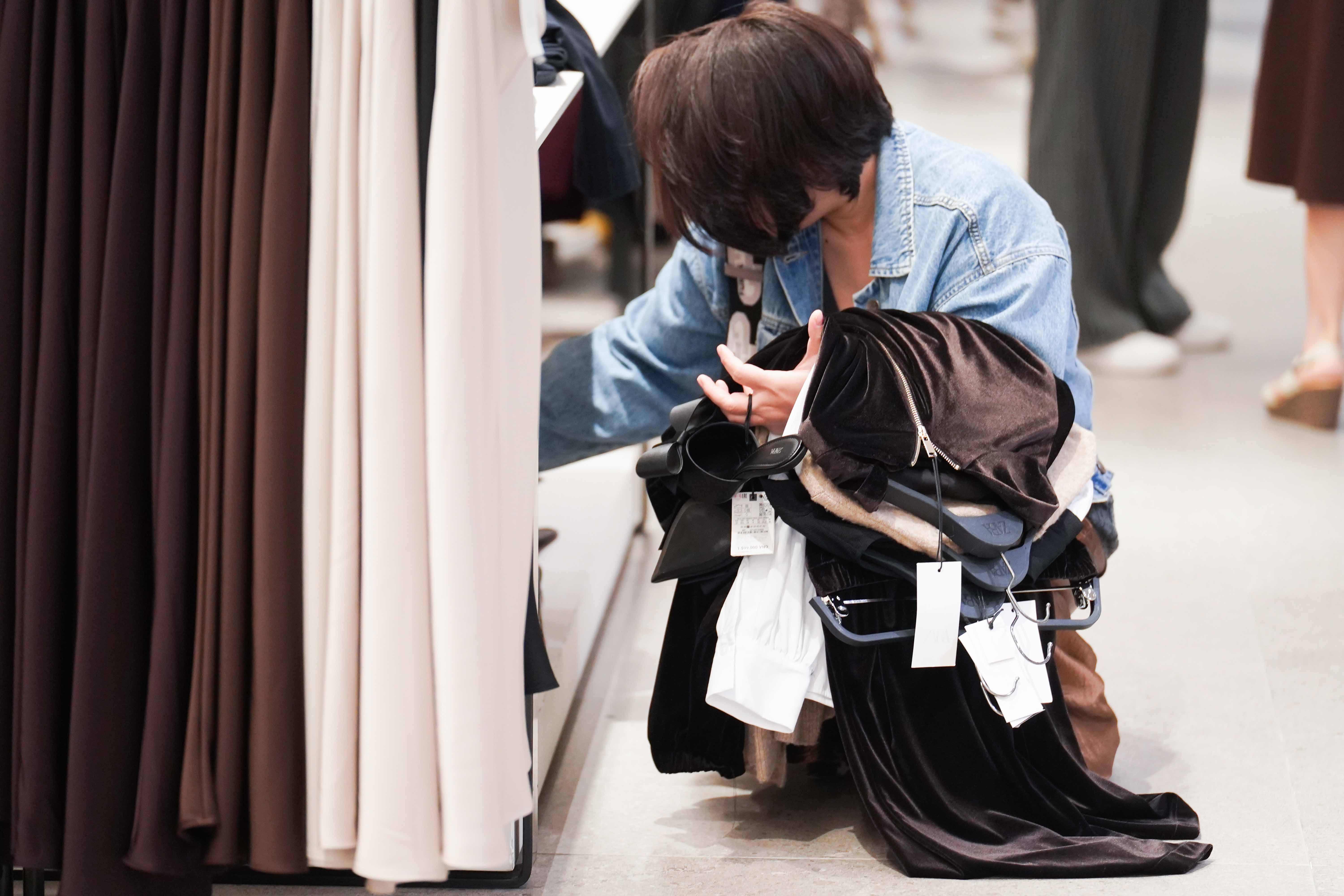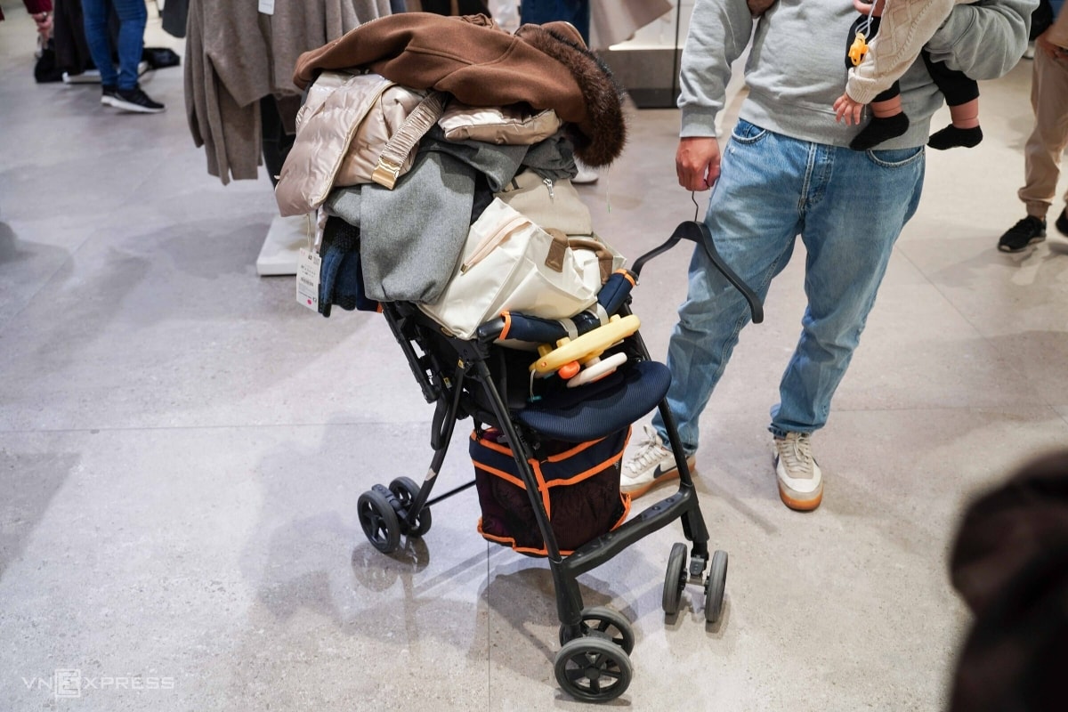 Chiếc xe đẩy chất đầy quần áo chờ tính tiền. "Thương hiệu này ít khuyến mãi nên tôi tận dụng dịp Black Friday mua đồ mới cho cả gia đình dùng dịp cuối năm và Tết sắp tới", anh Nguyễn Công Trung cho biết.