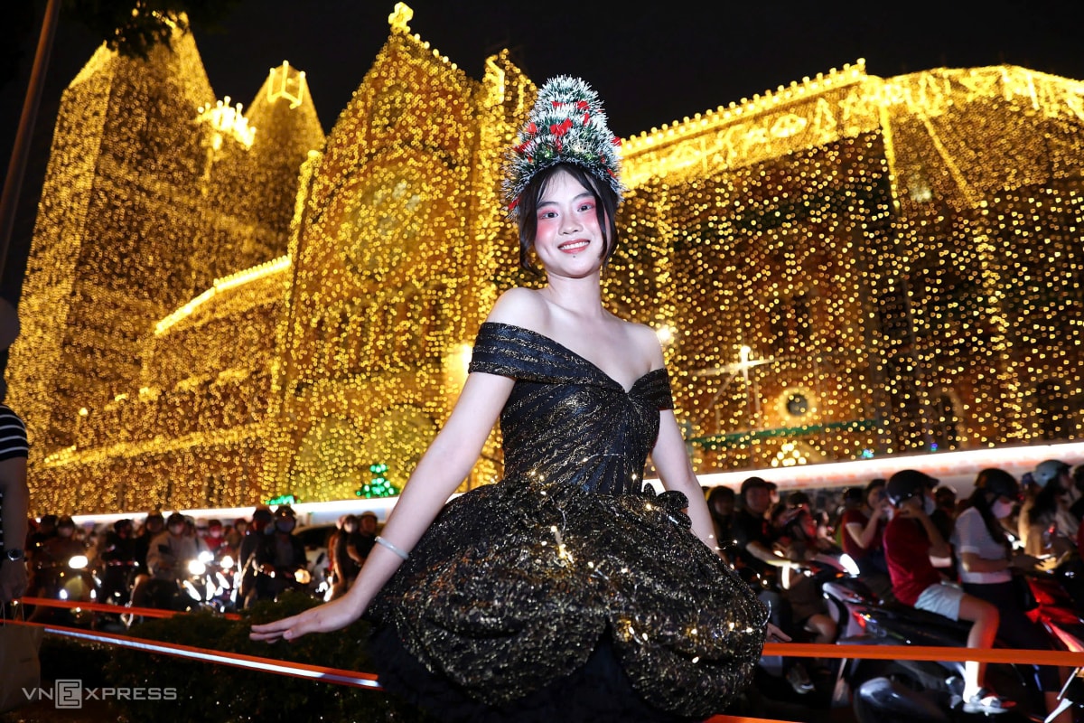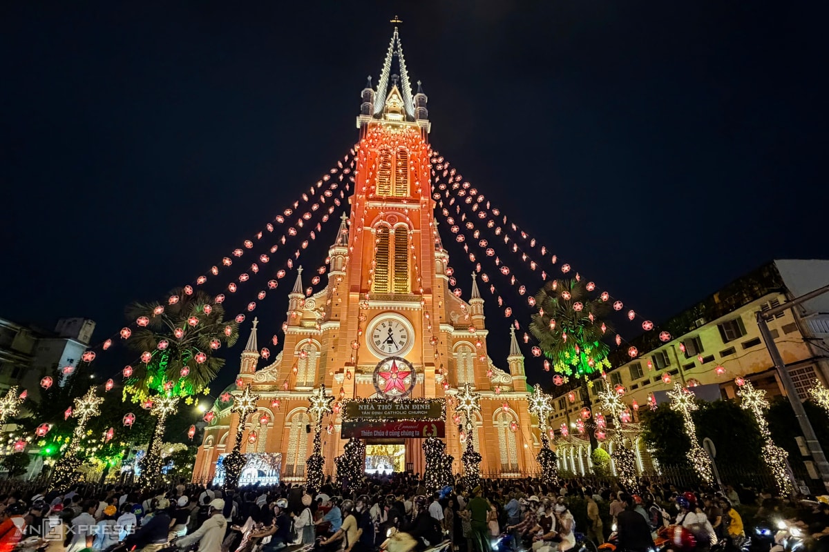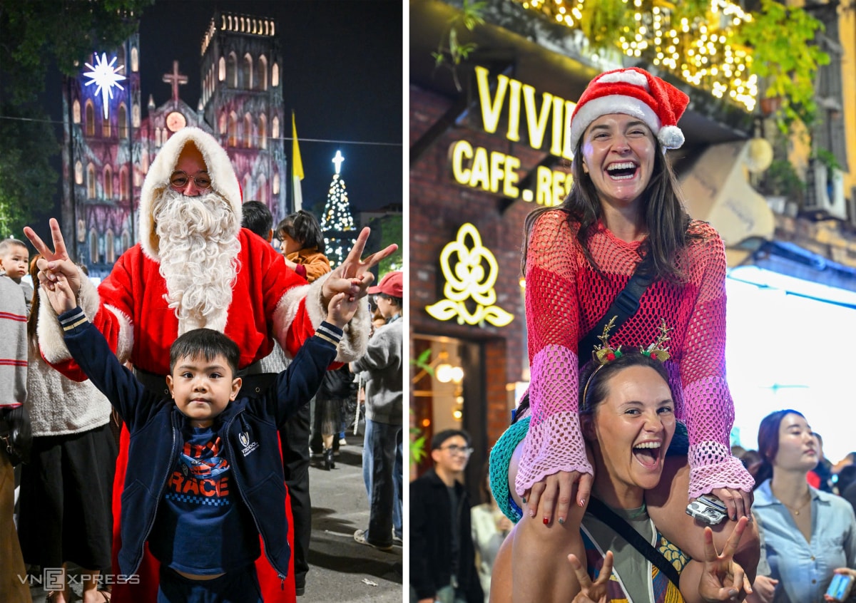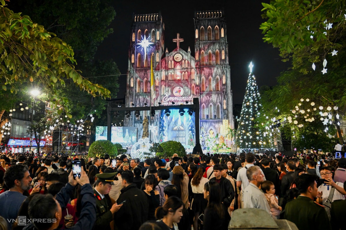 Người dân Hà Nội, TP HCM đổ về nhà thờ, xóm đạo, các tuyến phố trung tâm để vui chơi, mừng Chúa Giáng sinh, tối 24/12.