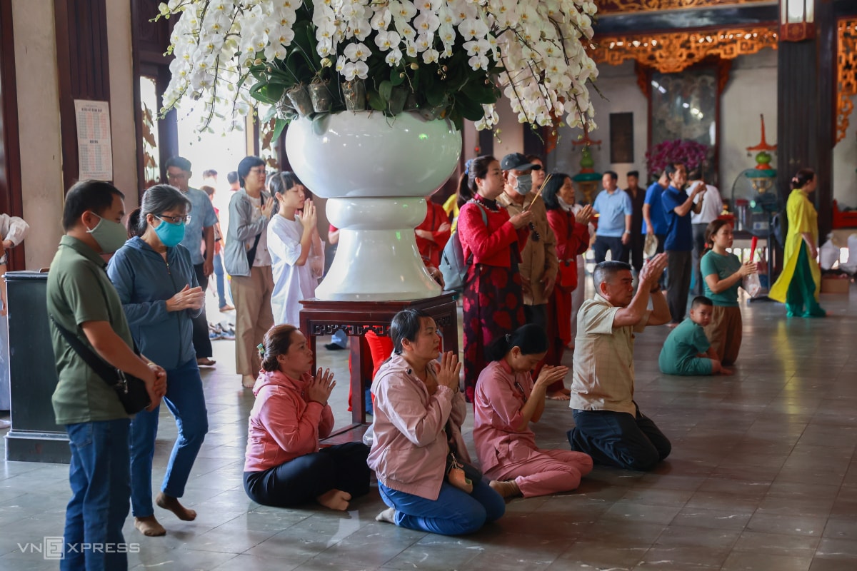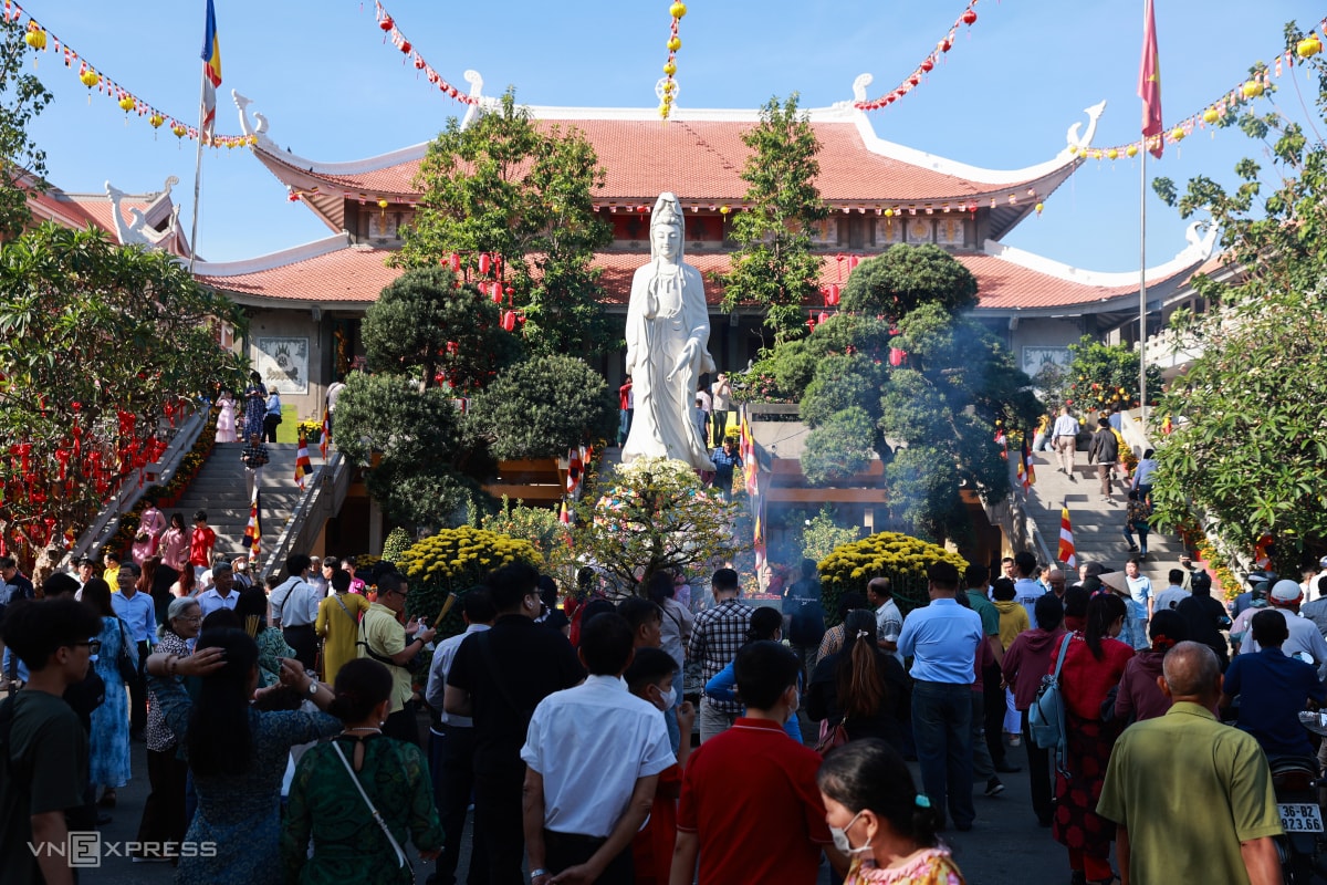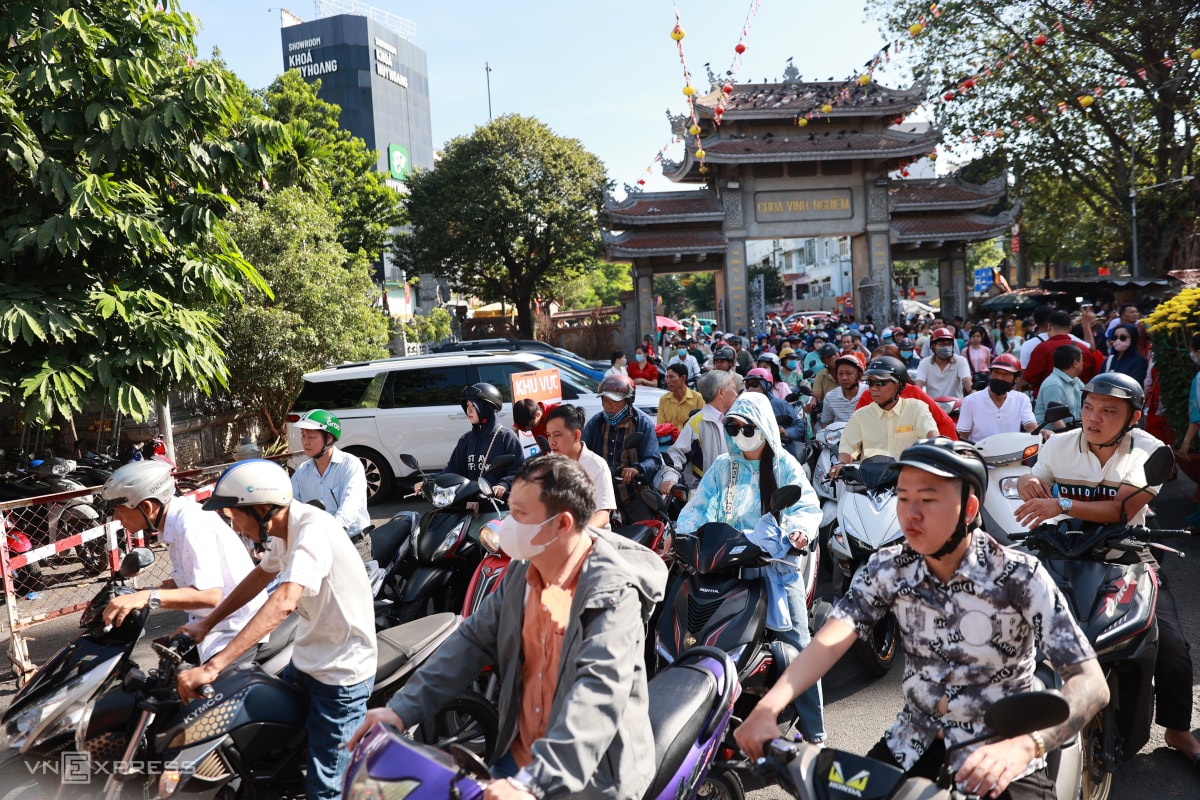 Đông người dân đổ về chùa Vĩnh Nghiêm, phường Xuân Hoà, thắp hương, xếp hàng gõ chuông cầu may mắn sáng mùng 1 Tết (17/2).