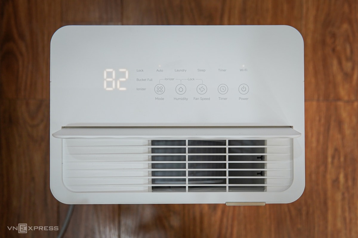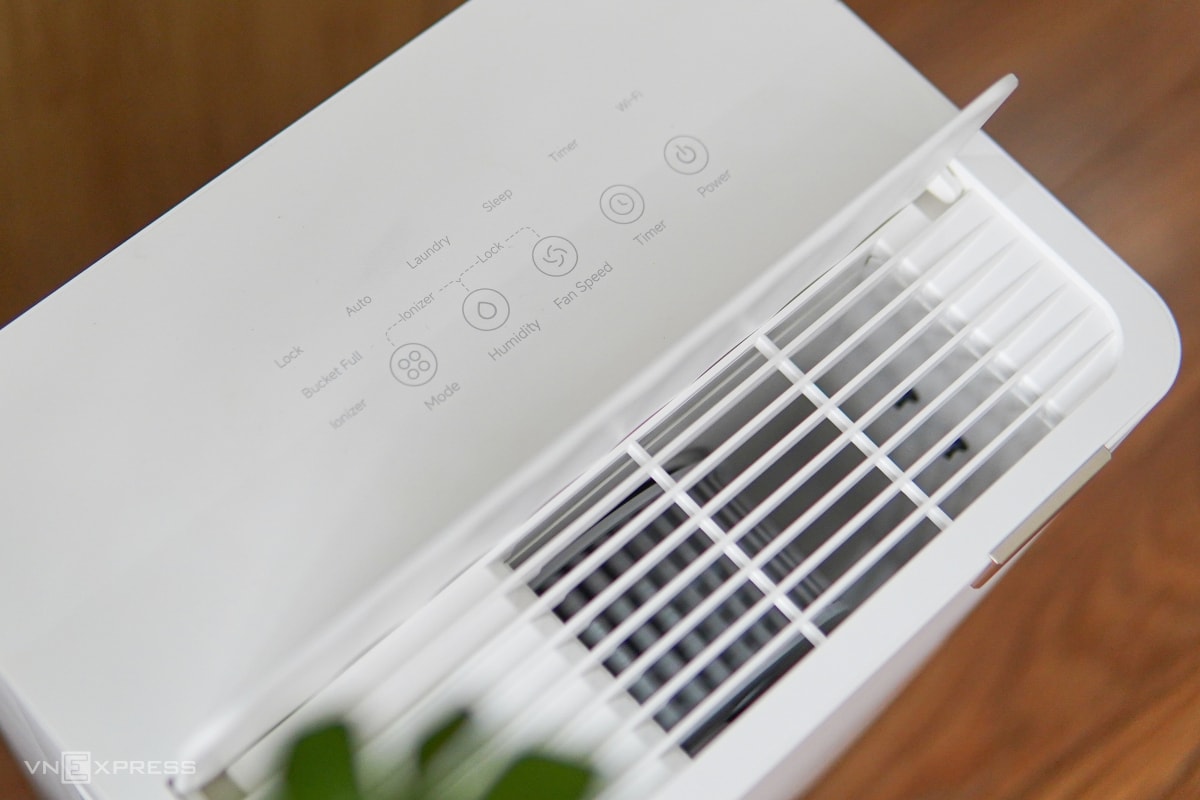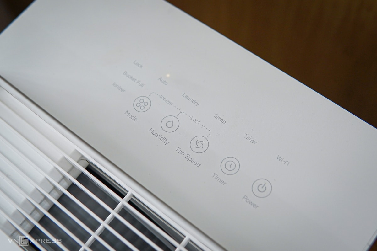 Mặt trên gồm khu vực điều khiển với các phím cảm ứng, màn hình LED lớn hiển thị chỉ số độ ẩm theo thời gian thực, đồng thời hỗ trợ điều chỉnh các tính năng như hẹn giờ, tốc độ gió. Máy cung cấp ba chế độ vận hành chính, gồm: Tự động, Laundry - duy trì gió mạnh để sấy quần áo, Sleep - giảm độ ồn quạt để sử dụng khi ngủ. Bên cạnh đó là các tính năng phụ như khóa trẻ em và ion hóa (plasma).