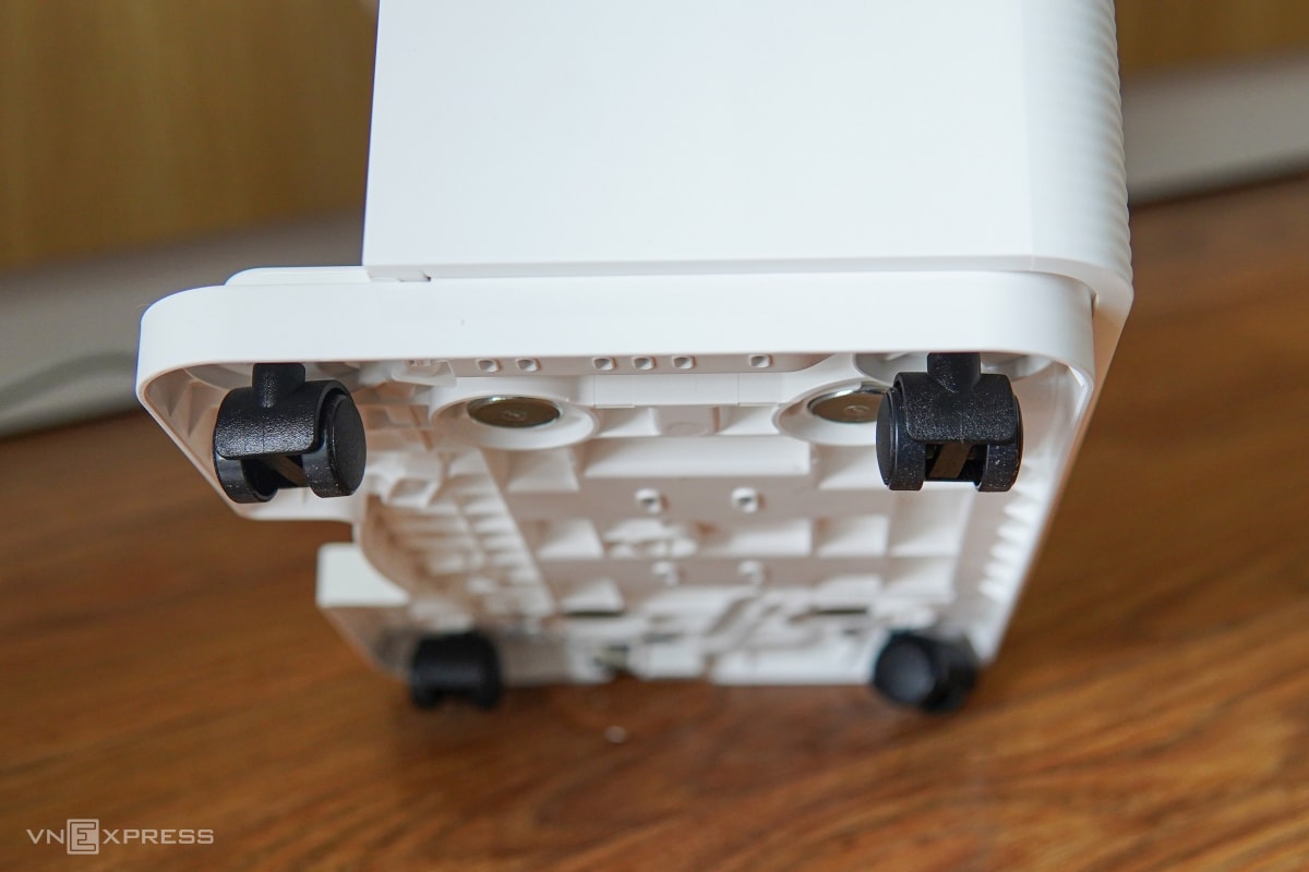 Do đặc thù sử dụng máy nén (compressor) và dàn đồng bên trong, máy hút ẩm công suất 20 lít/ngày thường có trọng lượng lớn, gây khó khăn khi cần di chuyển giữa các phòng. Trên DD20, nhà sản xuất giải quyết vấn đề này bằng hệ thống bốn bánh xe xoay 360 độ đặt ẩn dưới chân đế. Hỗ trợ cho việc di chuyển là hai hốc tay cầm được đúc chìm hai bên hông.