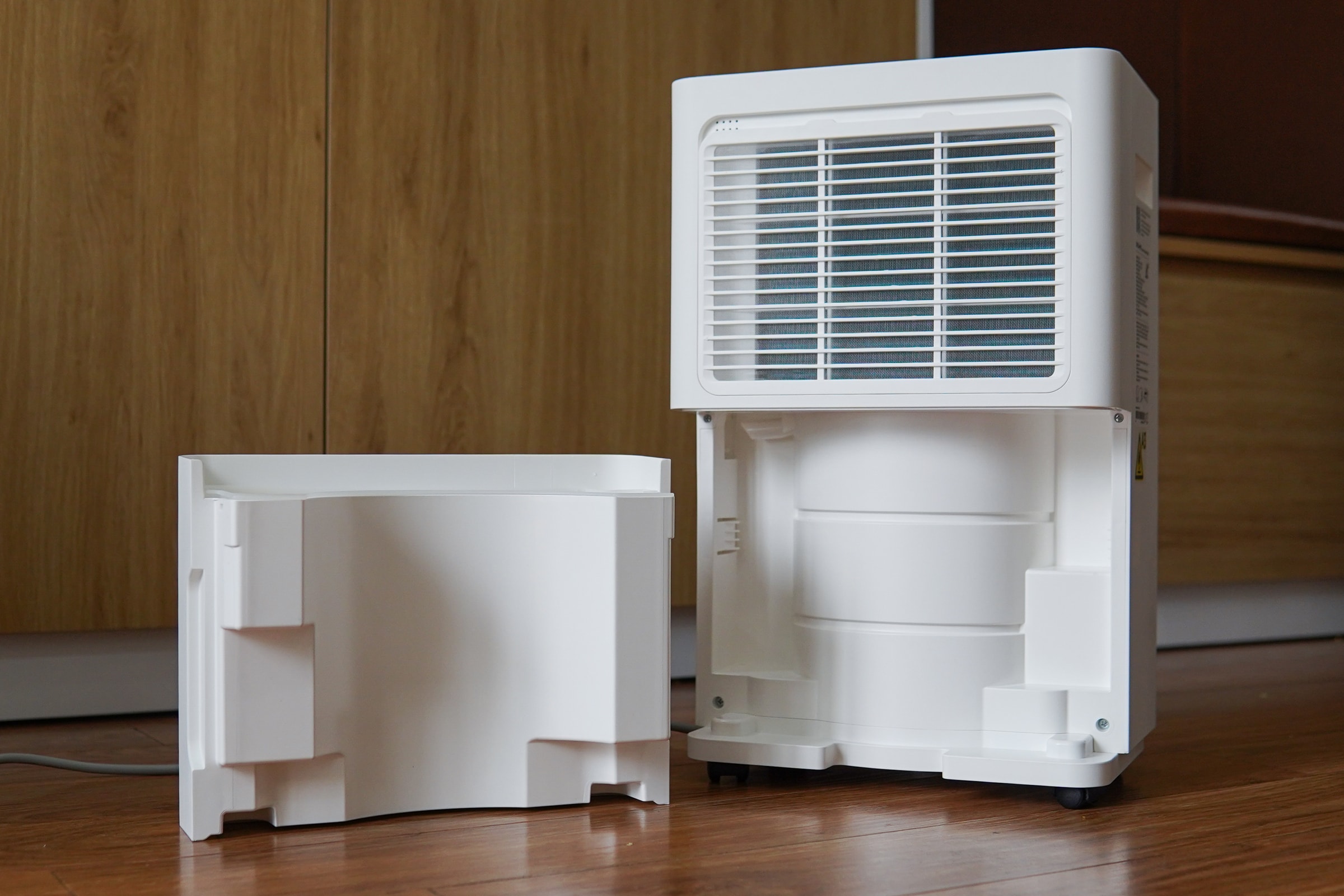 Nước ngưng tụ sau khi tách khỏi không khí được dẫn về khay chứa đặt ở phần dưới mặt sau. Đánh đổi cho kích thước nhỏ là dung tích của khay chứa cũng được rút gọn, ở mức 2,5 lít, có thể gặp tình trạng nhanh đầy nếu độ ẩm phòng ở mức cao. Để hỗ trợ quan sát, nhà sản xuất tích hợp một vạch trong suốt chạy dọc theo ngăn chứa, cho phép kiểm tra mực nước bằng mắt thường. Tuy nhiên, hệ thống cảnh báo đầy nước (Bucket Full) lại bộc lộ hạn chế khi chỉ hiển thị bằng một đèn báo nhỏ trên bảng điều khiển và thiếu tín hiệu âm thanh đủ lớn hay thông báo qua app trên smartphone.