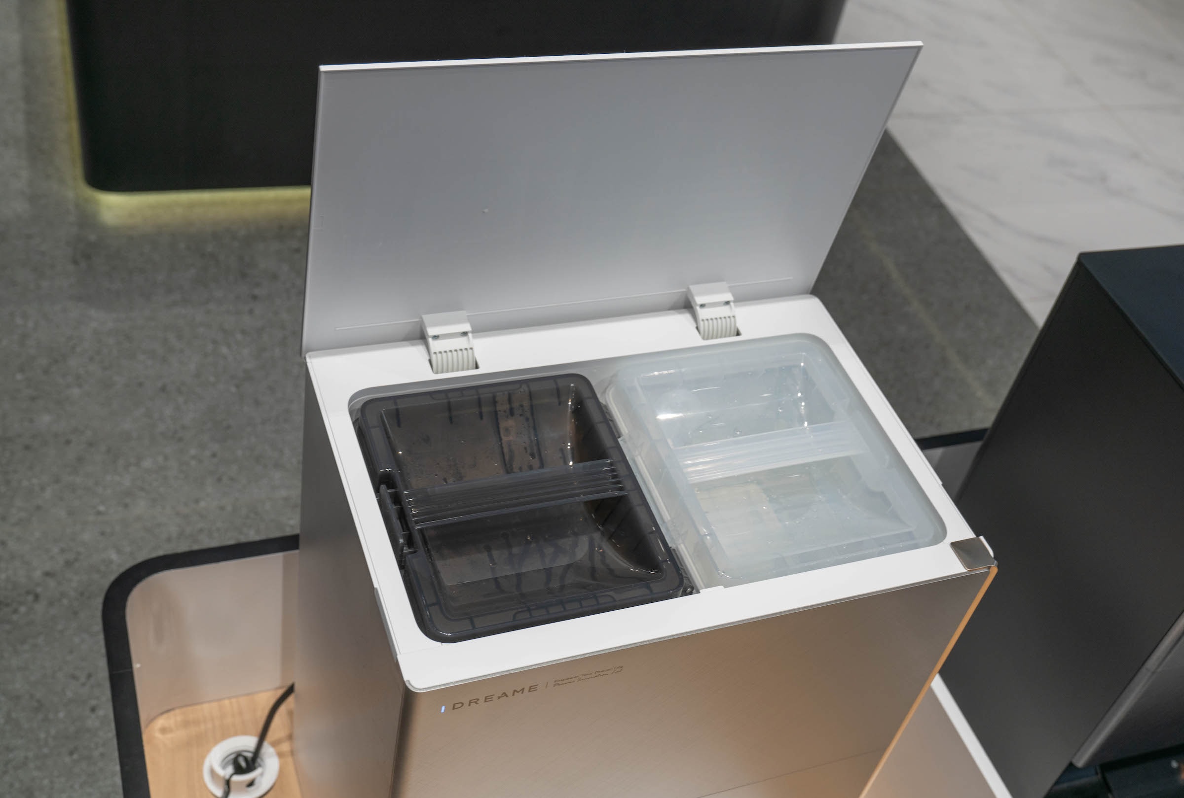 Hai hộp đựng nước sạch và bẩn bố trí trên đỉnh máy với nắp đậy. Phía dưới có túi đựng rác dung tích 3,2 lít cho thời gian sử dụng có thể đến 75 ngày, không cần đổ rác mỗi ngày, bên cạnh là hộp chứa dung dịch lau nhà.