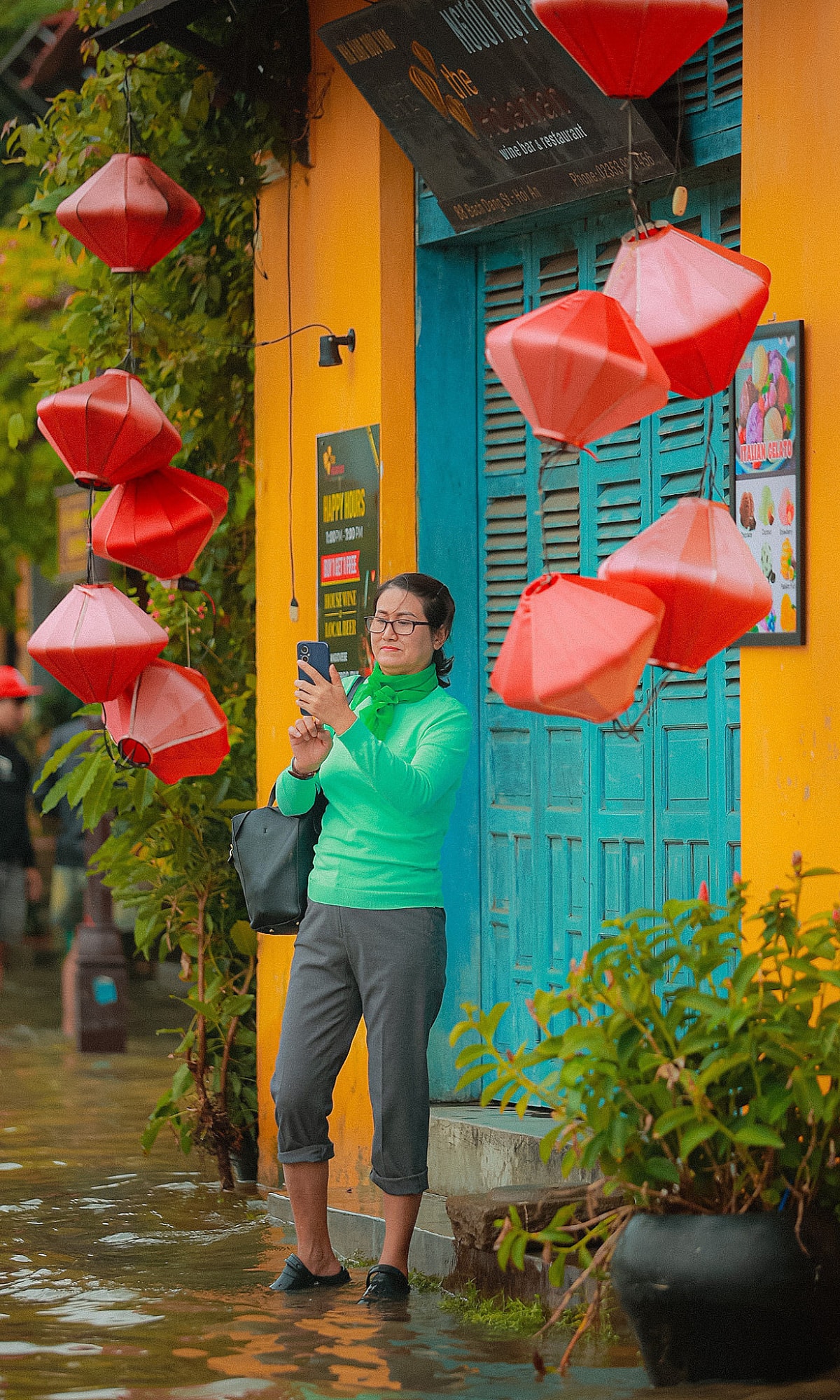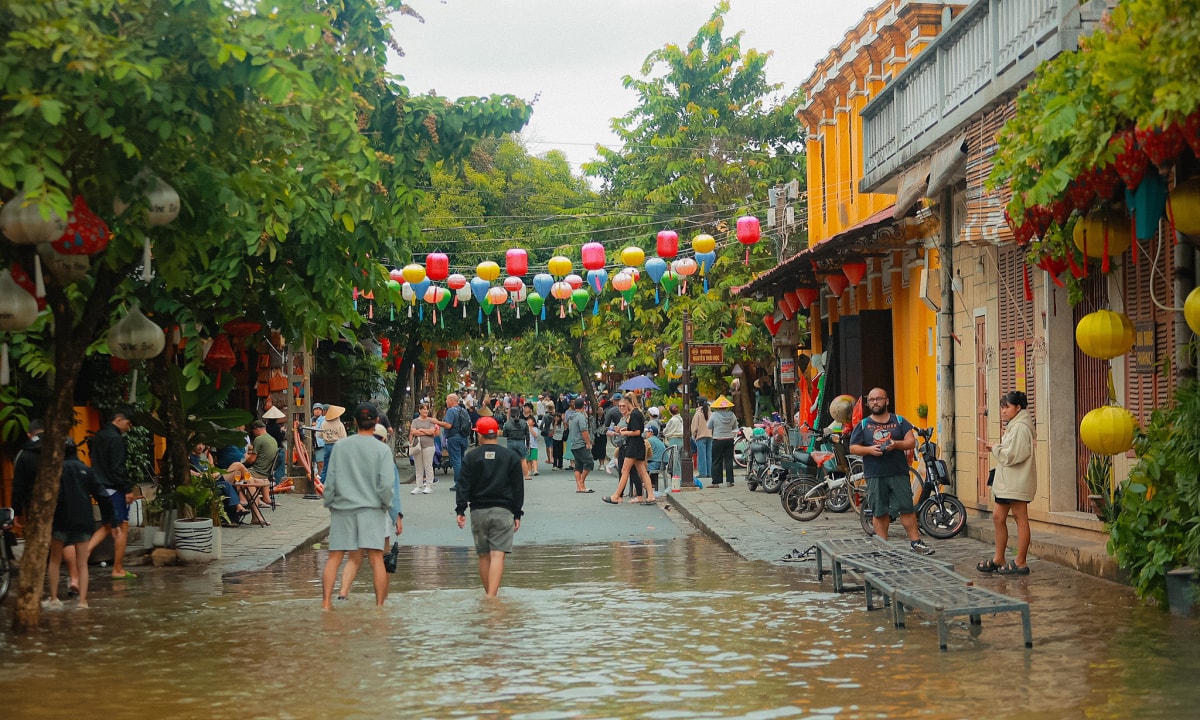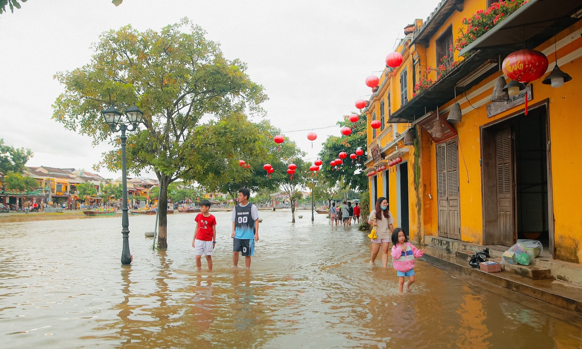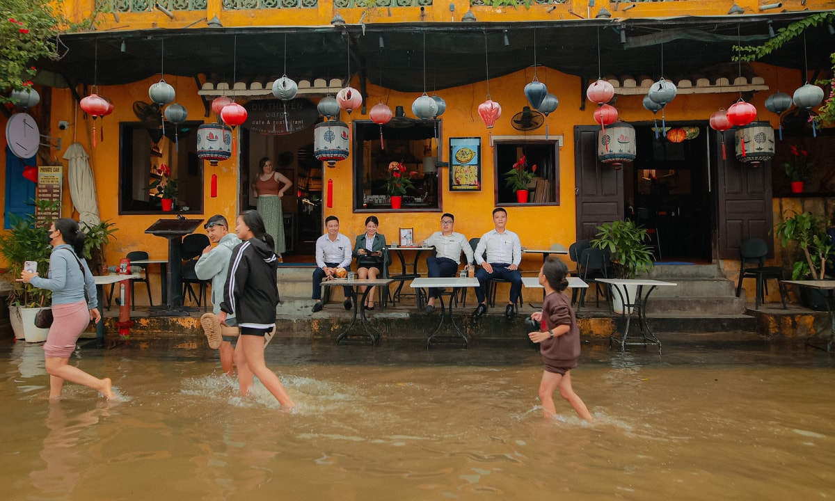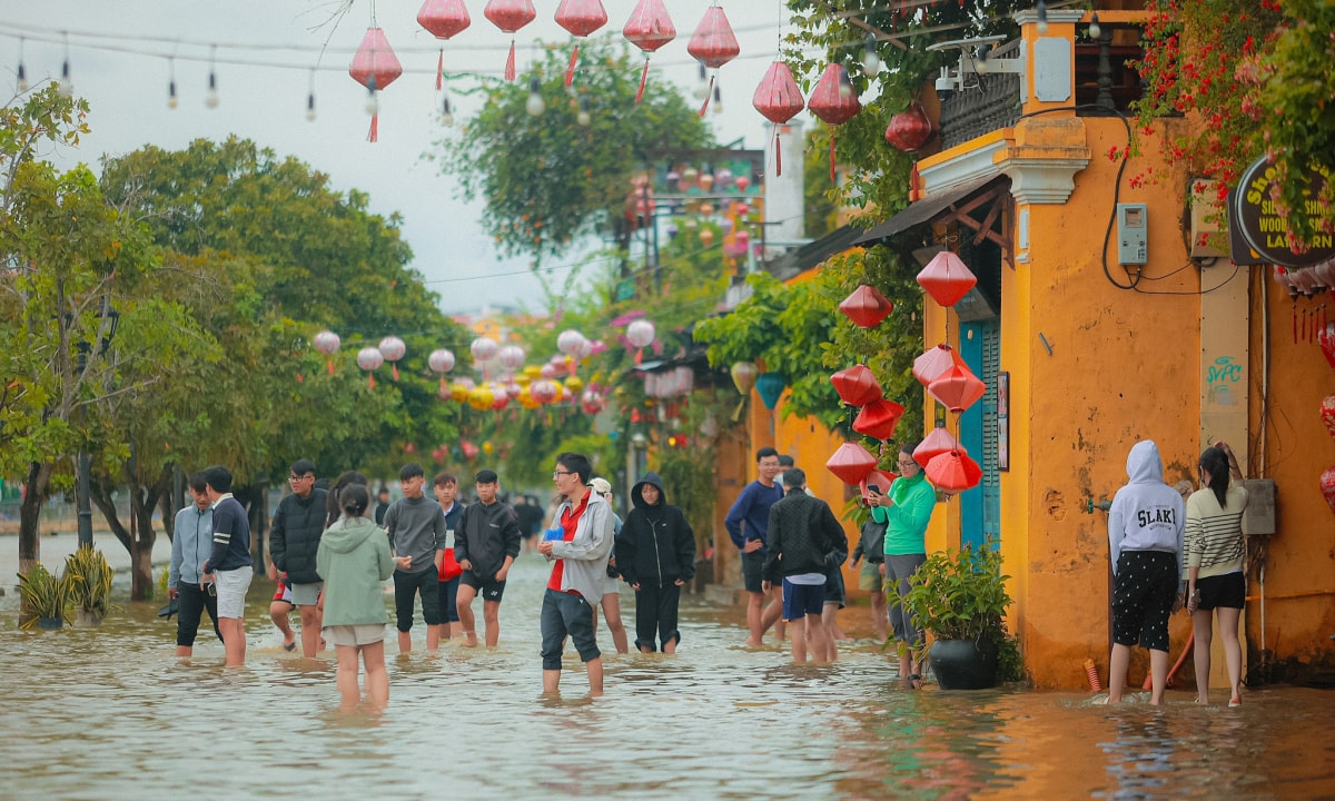Nhiều đoạn đường trong phố cổ ngập trên nửa mét, các cửa hàng đóng cửa, di dời đồ đạc lên cao trong khi du khách vẫn đông đúc, lội nước đi tham quan.