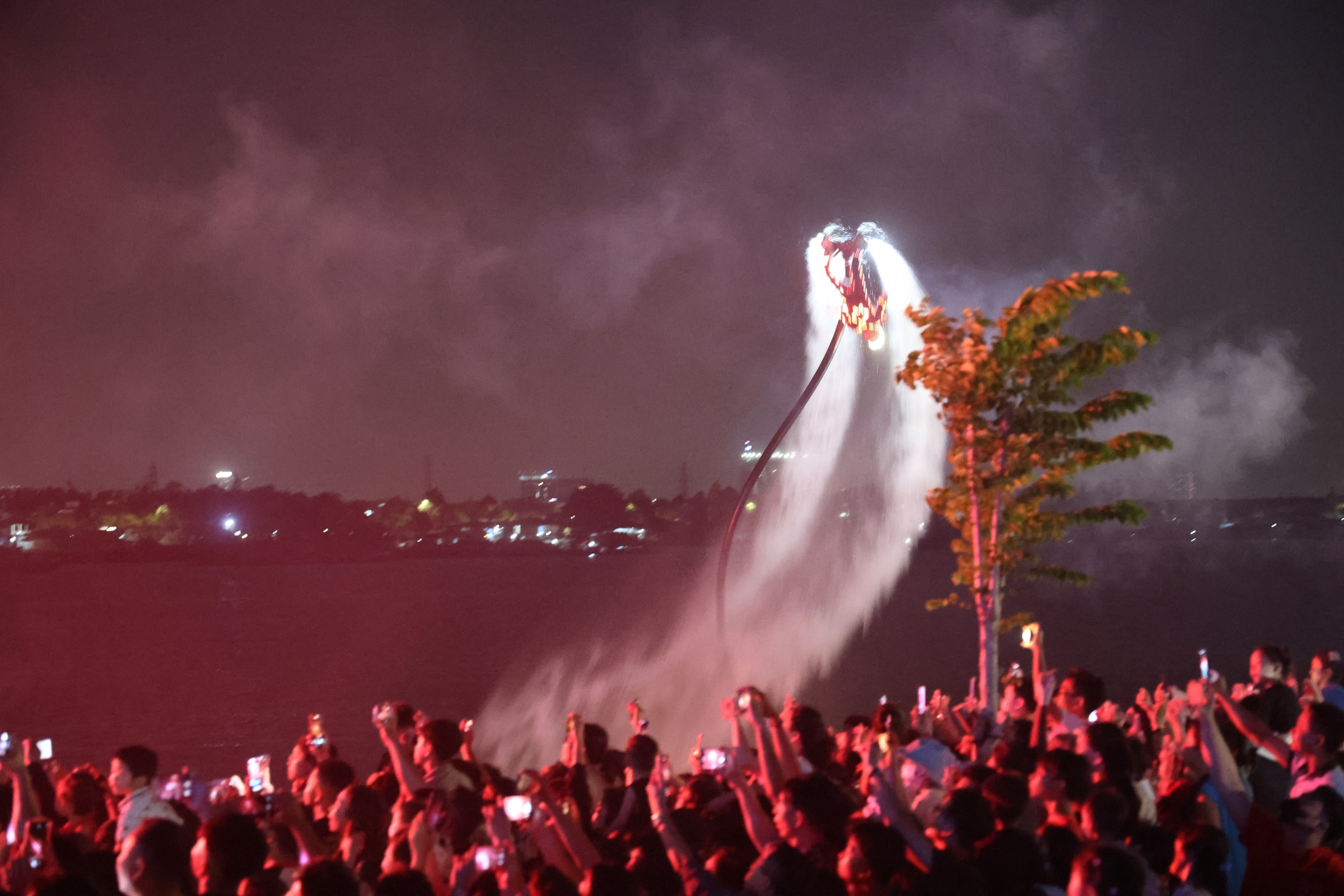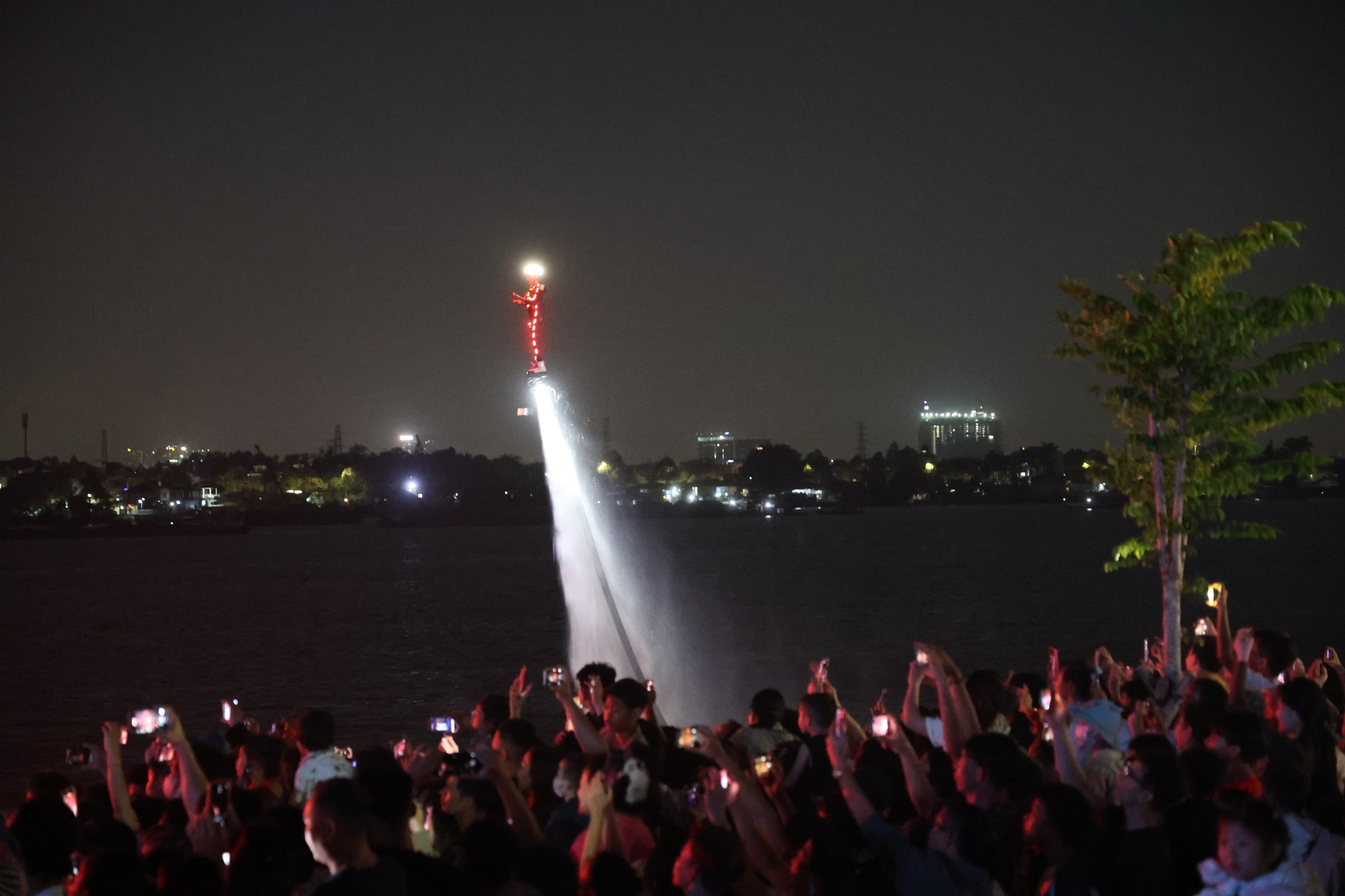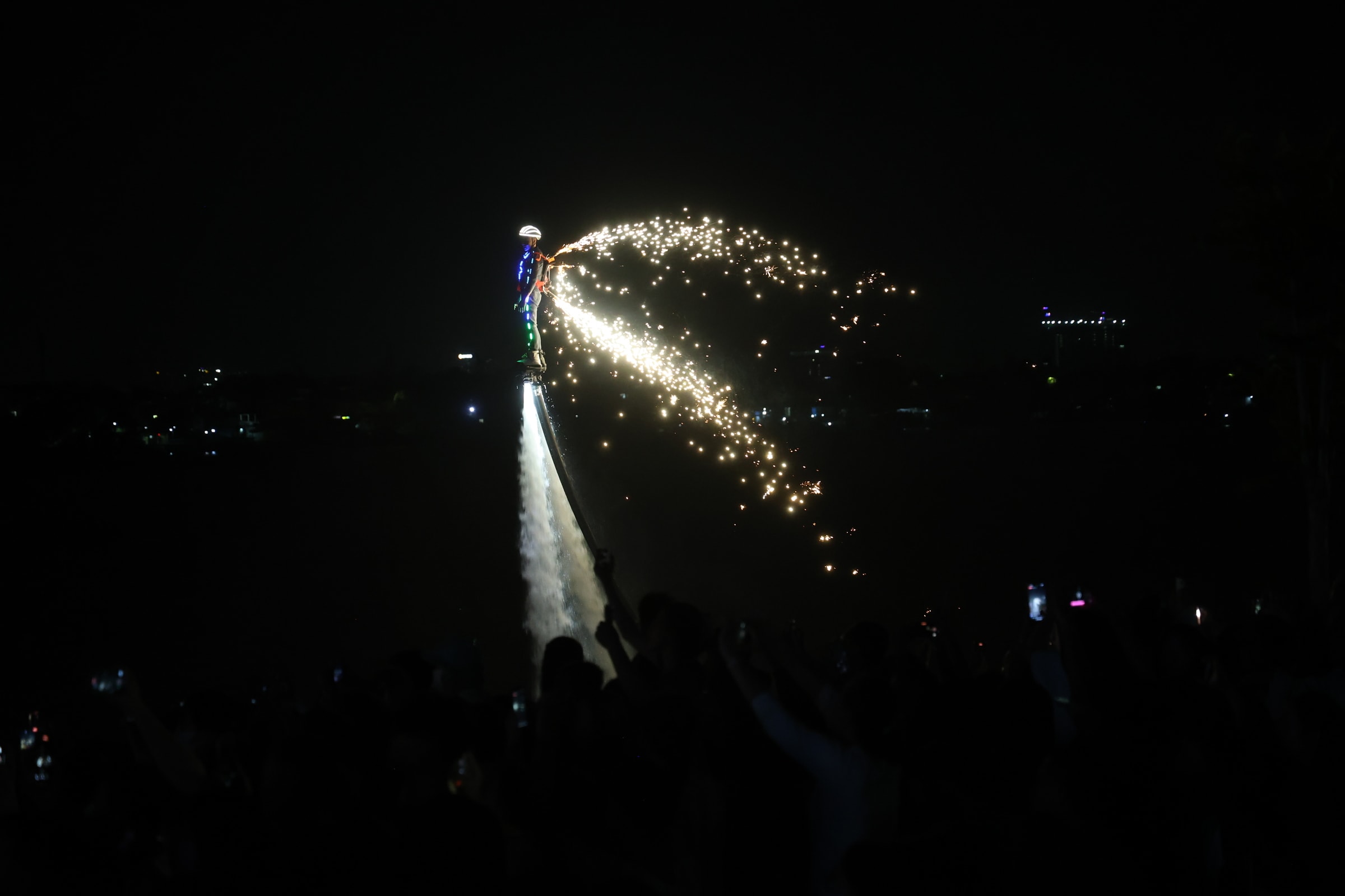 Các vận động viên Flyboard trình diễn trên sông Đồng Nai kết hợp pháo hoa và ánh sáng.