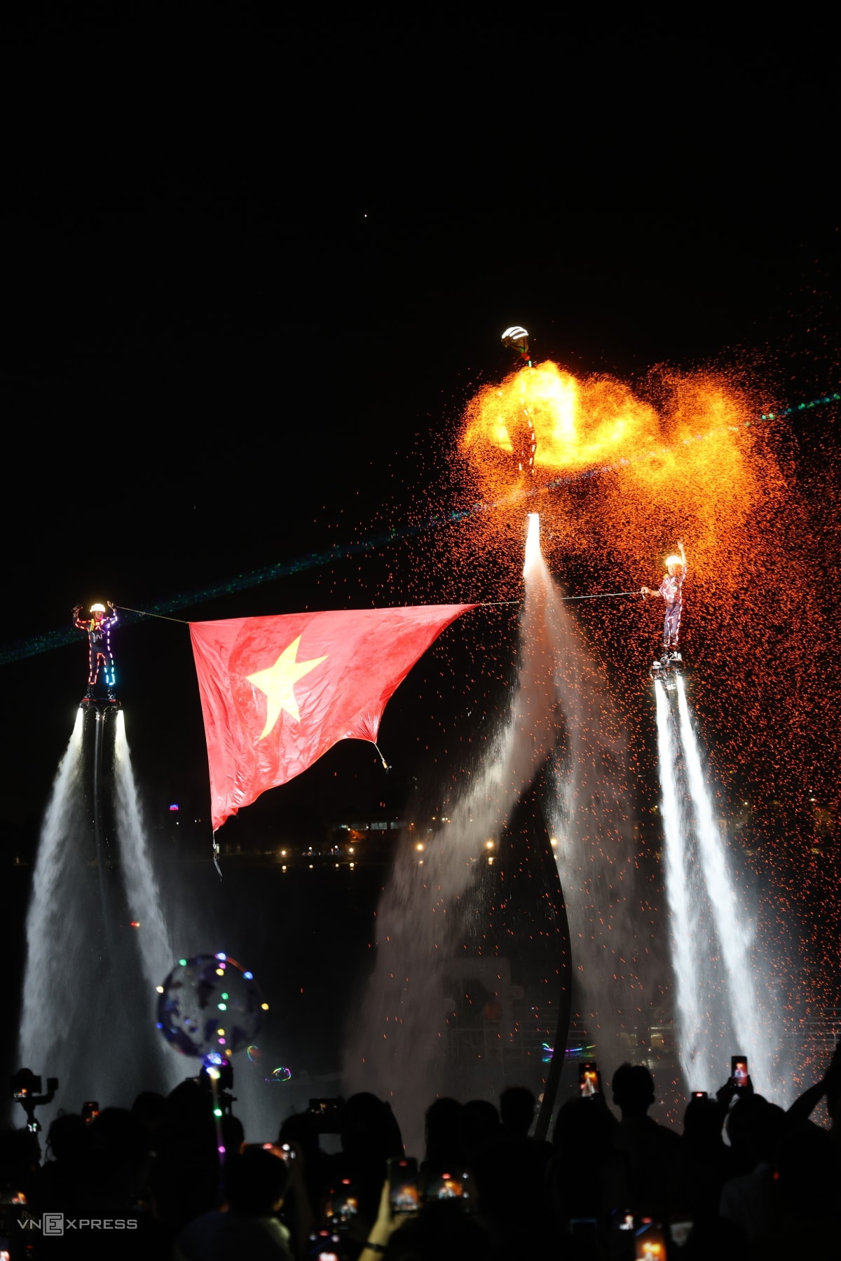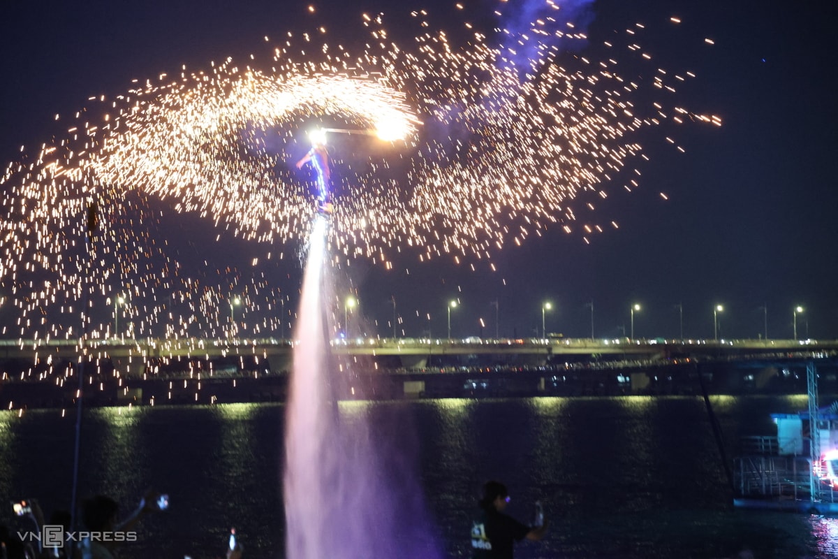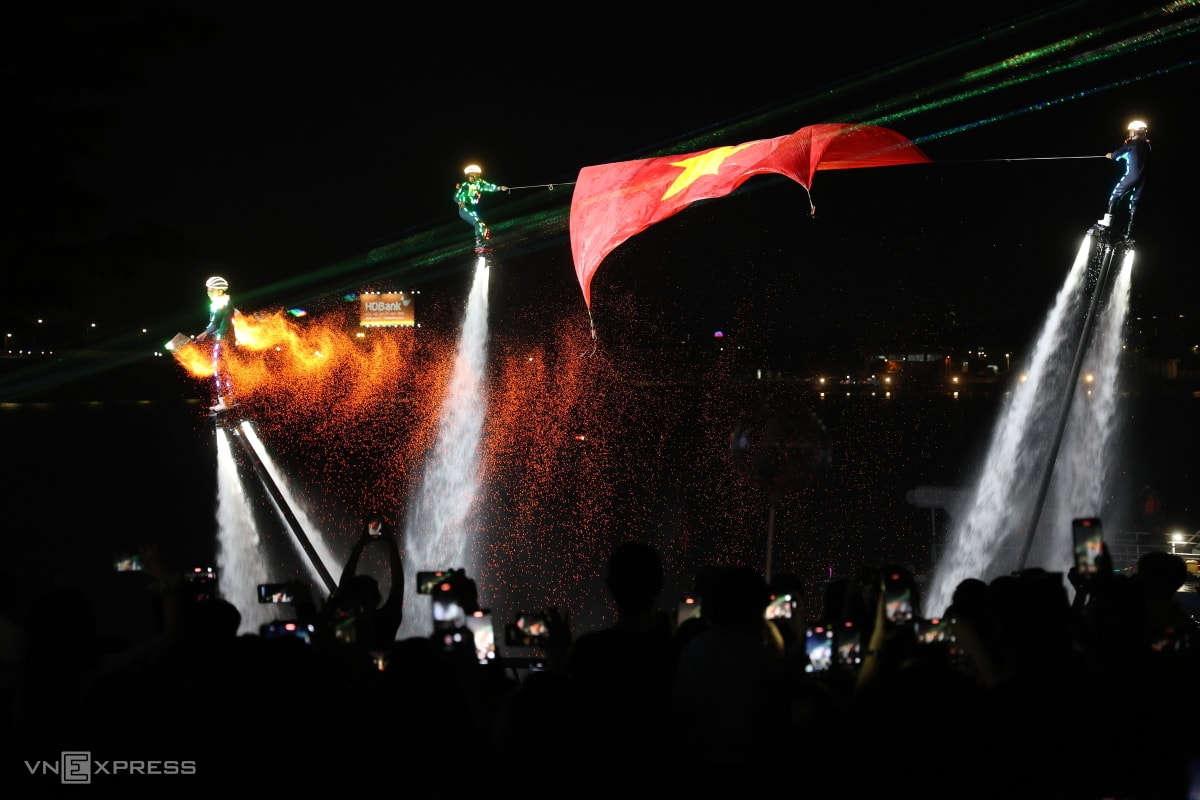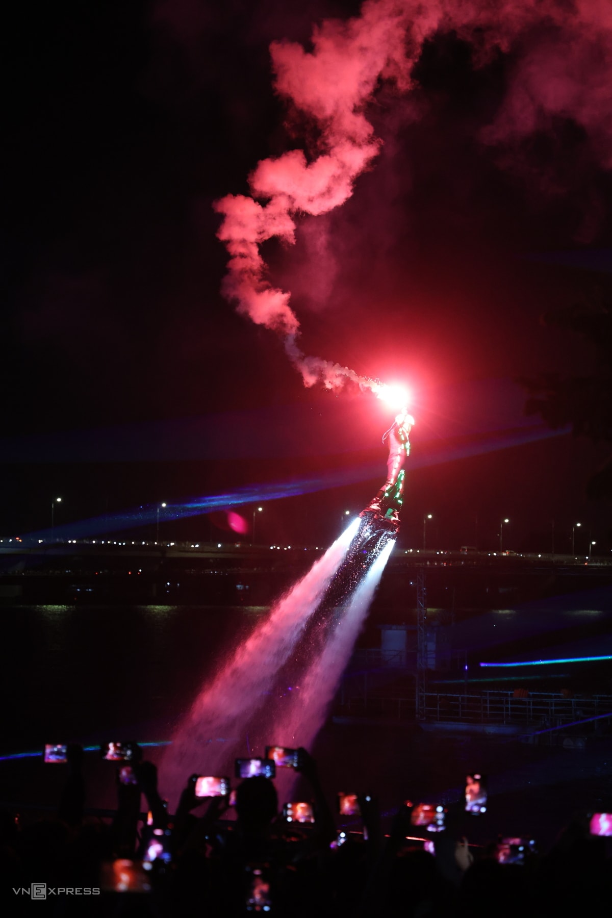 Các vận động viên Flyboard trình diễn trên sông Đồng Nai kết hợp pháo hoa và ánh sáng.