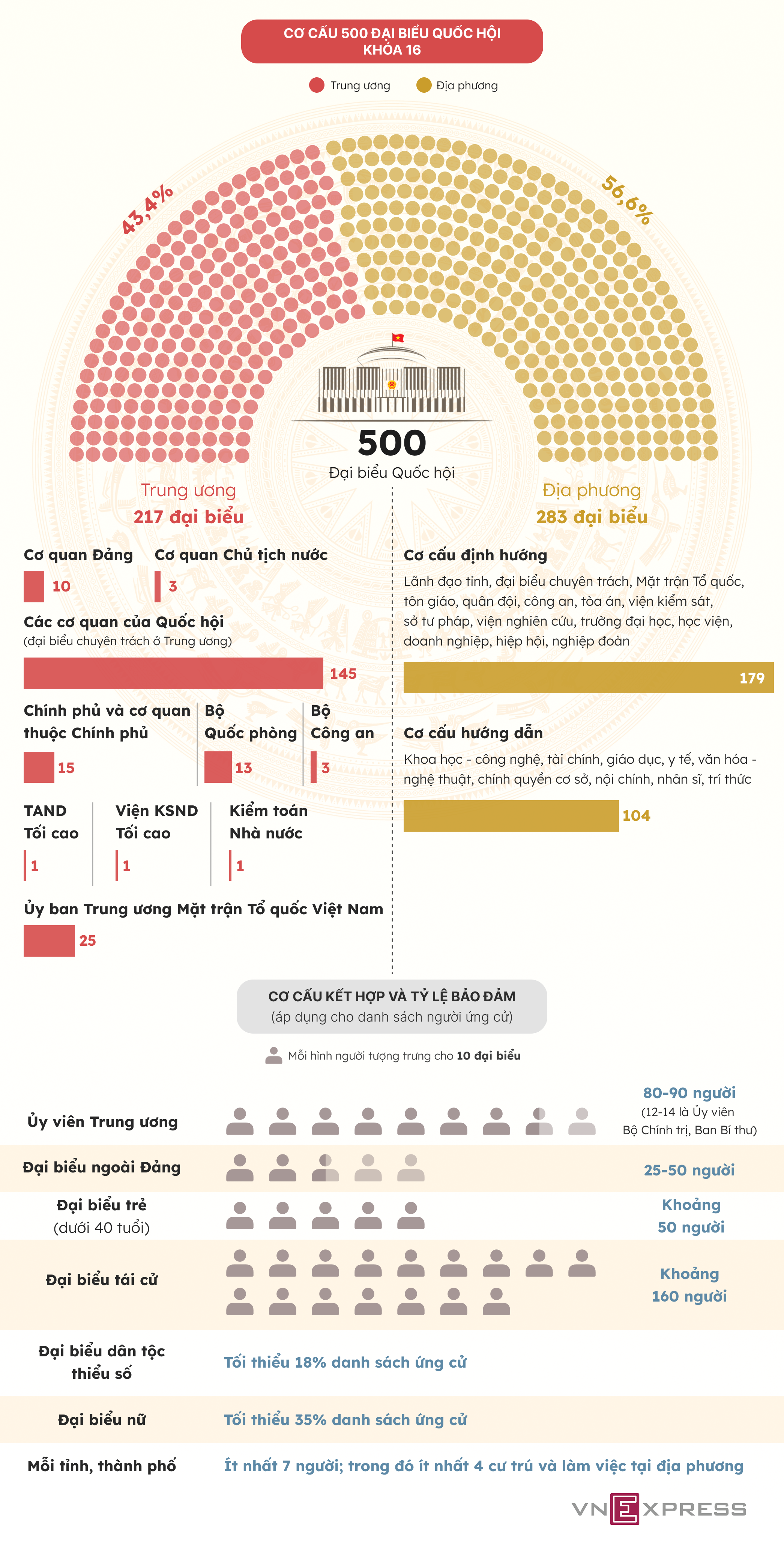 Quốc hội Khóa 16 có tổng cộng 500 đại biểu, trong đó 217 đại biểu Trung ương và 283 đại biểu địa phương.