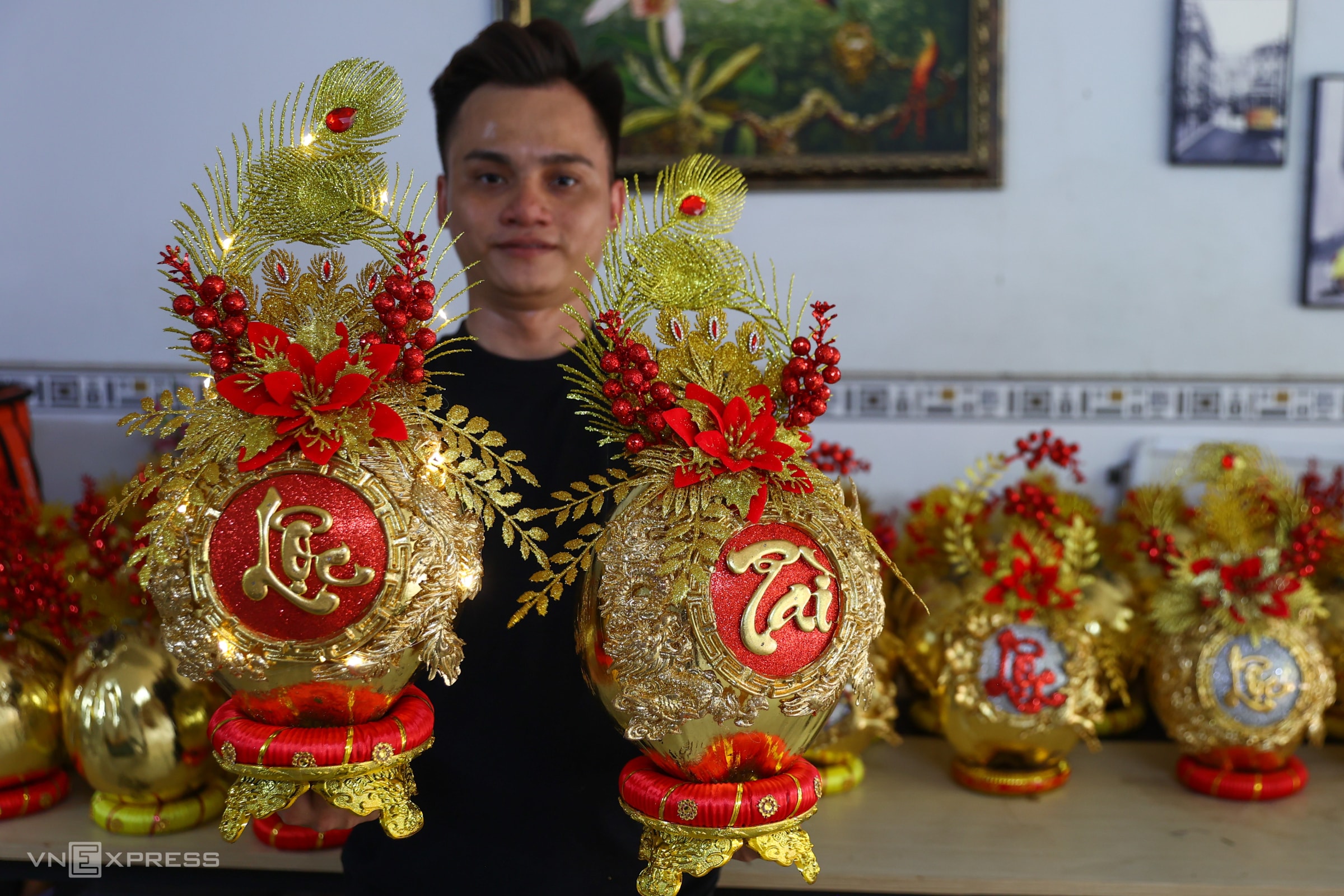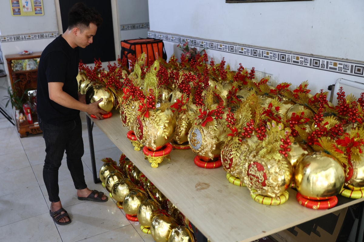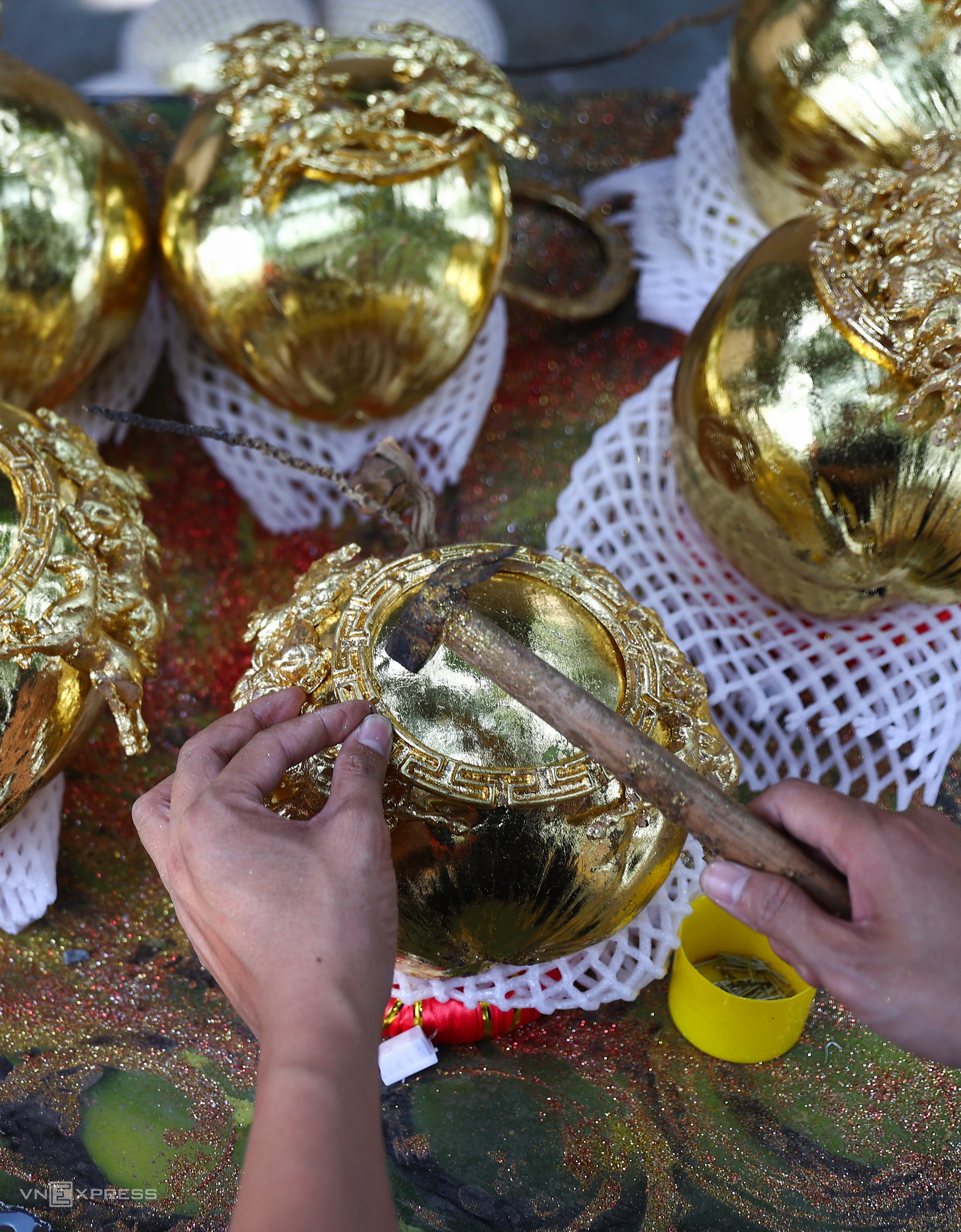 Cách đó hơn 50 km, xưởng của anh Anh Tú (28 tuổi) ở TP Biên Hoà cũ làm hàng trăm quả dừa dát vàng. Dịp Tết này, xưởng làm 7.000 quả mạ vàng, tăng hơn 20% so với năm trước. "Năm nay nhiều đơn hàng hơn nhưng chủ yếu là bán sỉ nên giá không tăng nhiều", anh Tú nói.