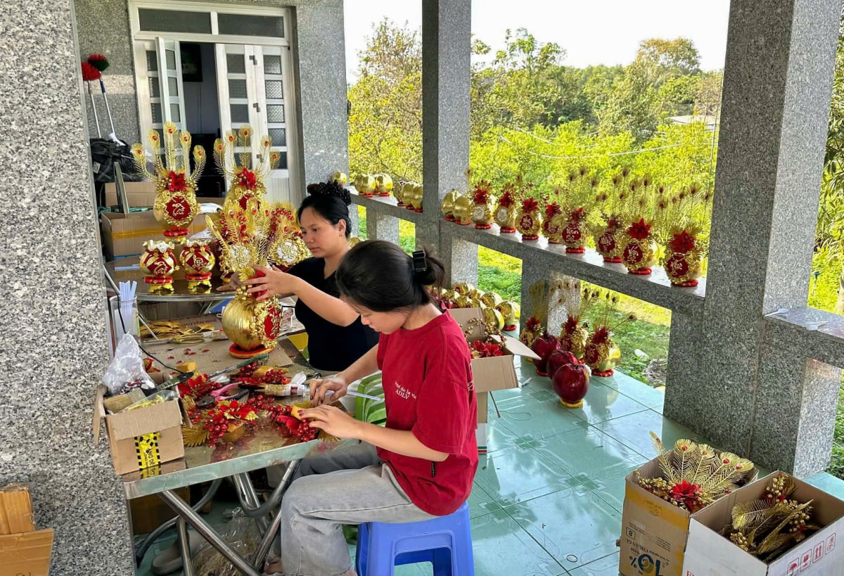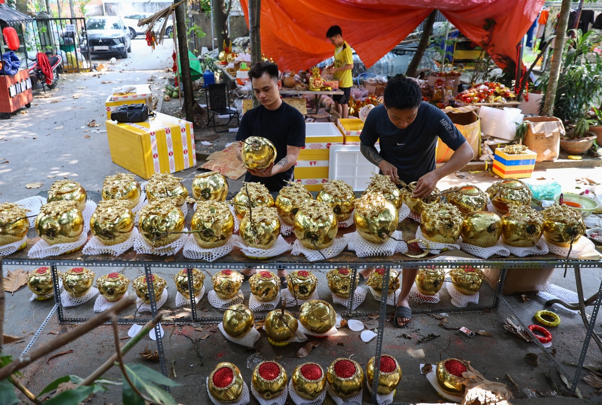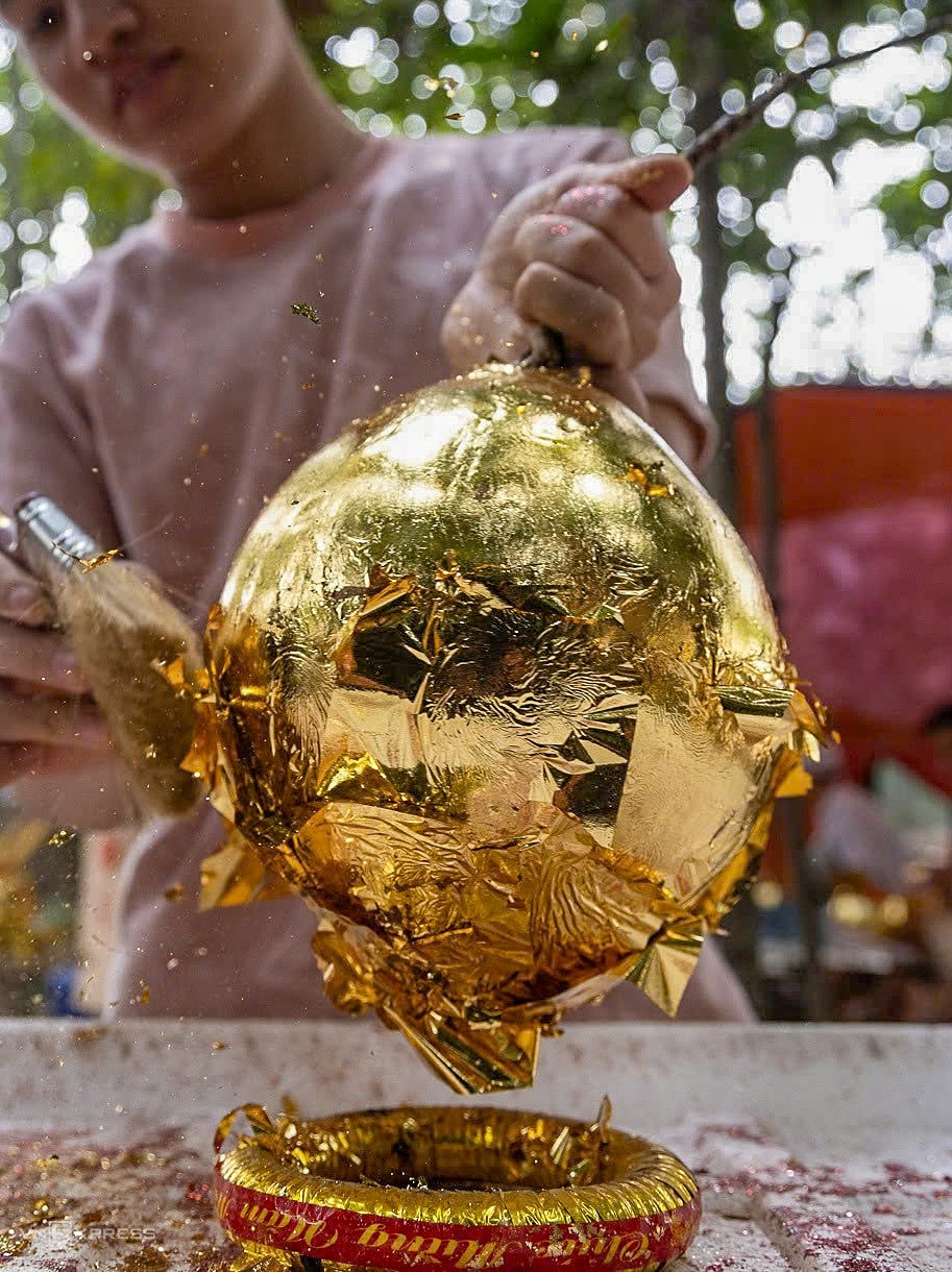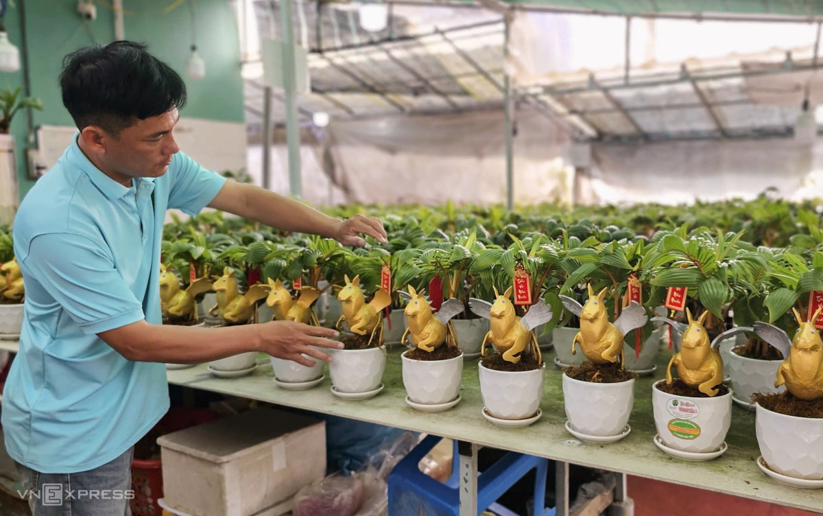 Cách đó hơn 50 km, xưởng của anh Anh Tú (28 tuổi) ở TP Biên Hoà cũ làm hàng trăm quả dừa dát vàng. Dịp Tết này, xưởng làm 7.000 quả mạ vàng, tăng hơn 20% so với năm trước. "Năm nay nhiều đơn hàng hơn nhưng chủ yếu là bán sỉ nên giá không tăng nhiều", anh Tú nói.