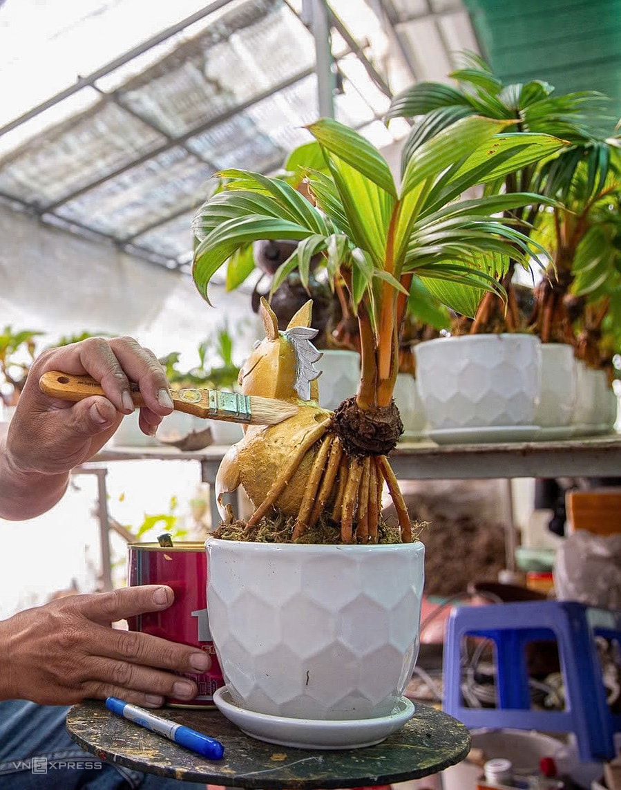Để có những chậu dừa bonsai, từ nửa năm trước anh Tùng nhập giống dừa xiêm ở trong vùng về ươm, khi cây cao khoảng 15 đến 20 cm thì bắt đầu tạo hình. Suốt thời gian lên giống, người thợ phải uốn lá, làm rễ, đôn gốc dừa... cho dáng đẹp.