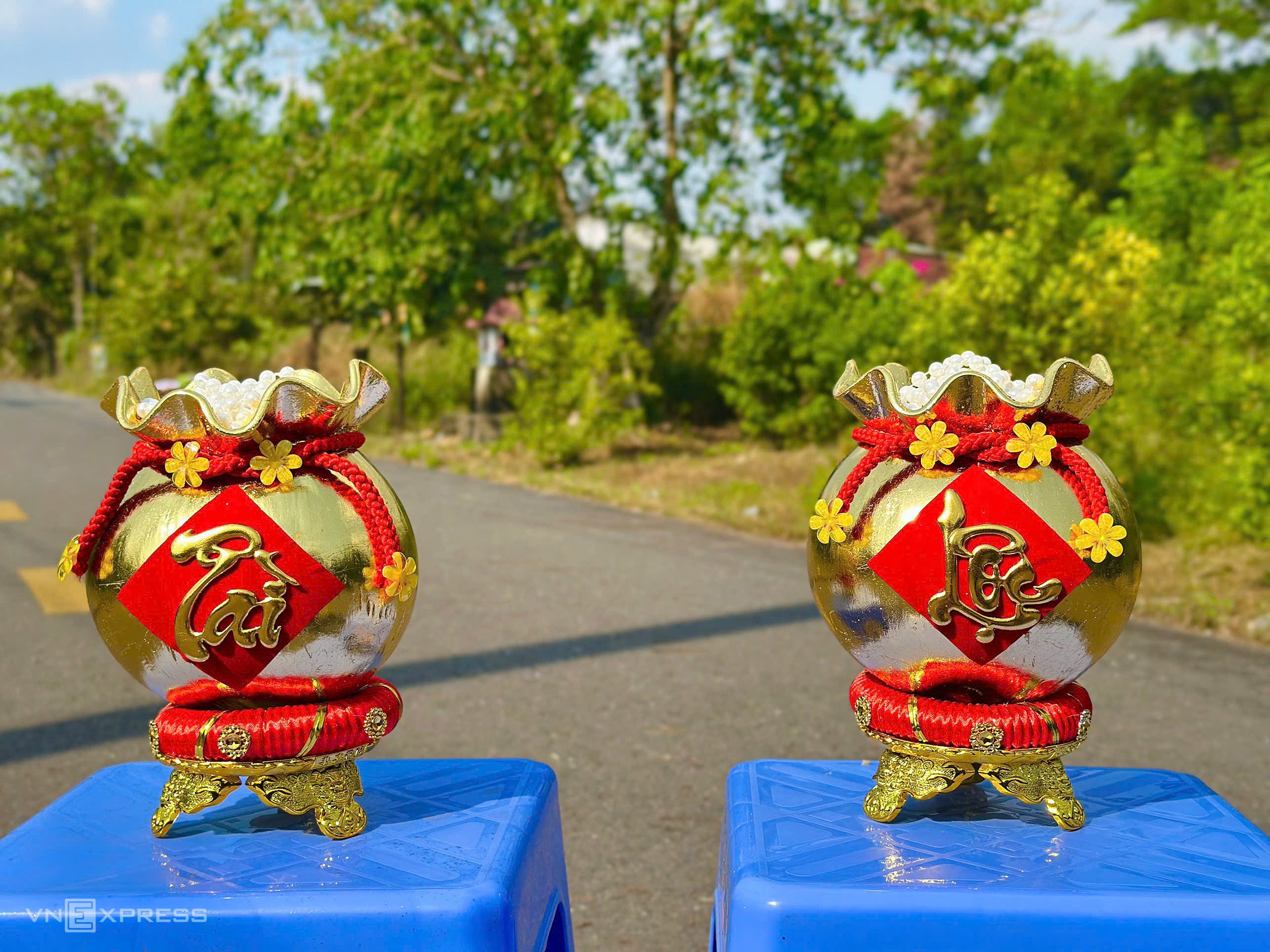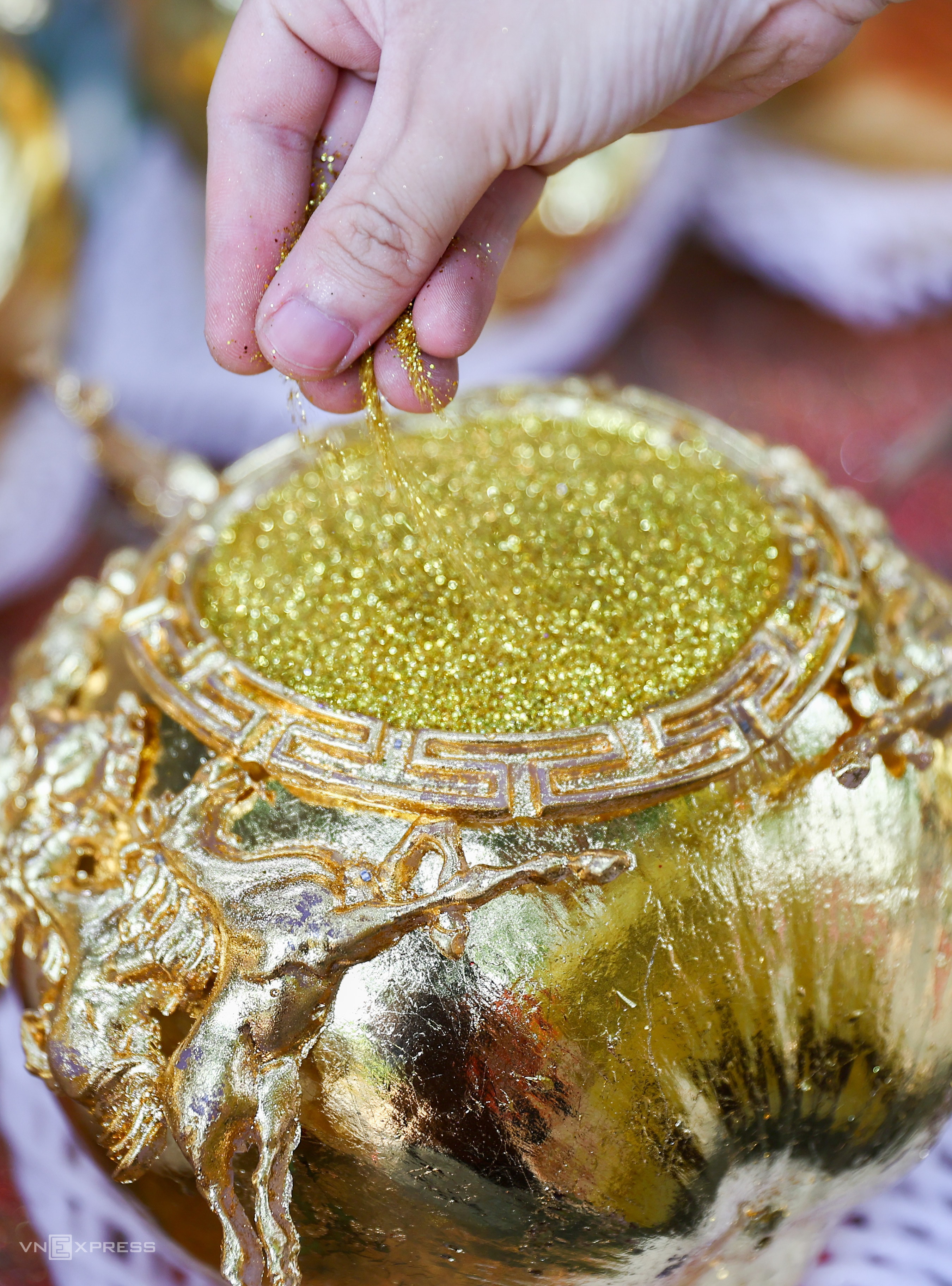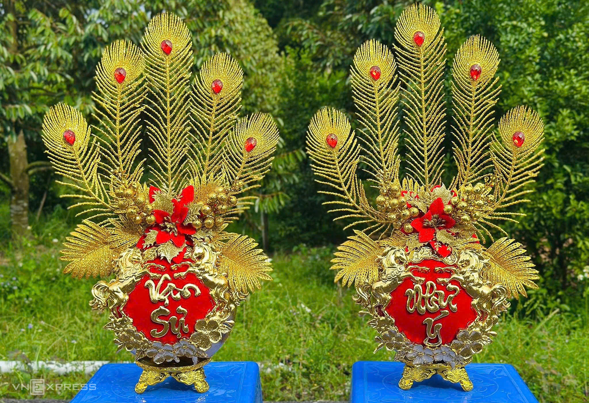 Dừa là trái "đầy nước đầy thịt", biểu trưng cho sự sung túc, không thiếu thốn, dát thêm vàng mang ý nghĩa tài lộc. "Vì vậy nên mặt hàng này năm nào cũng hút khách, mọi người phải làm đến tối để kịp đơn", chủ xưởng giải thích.