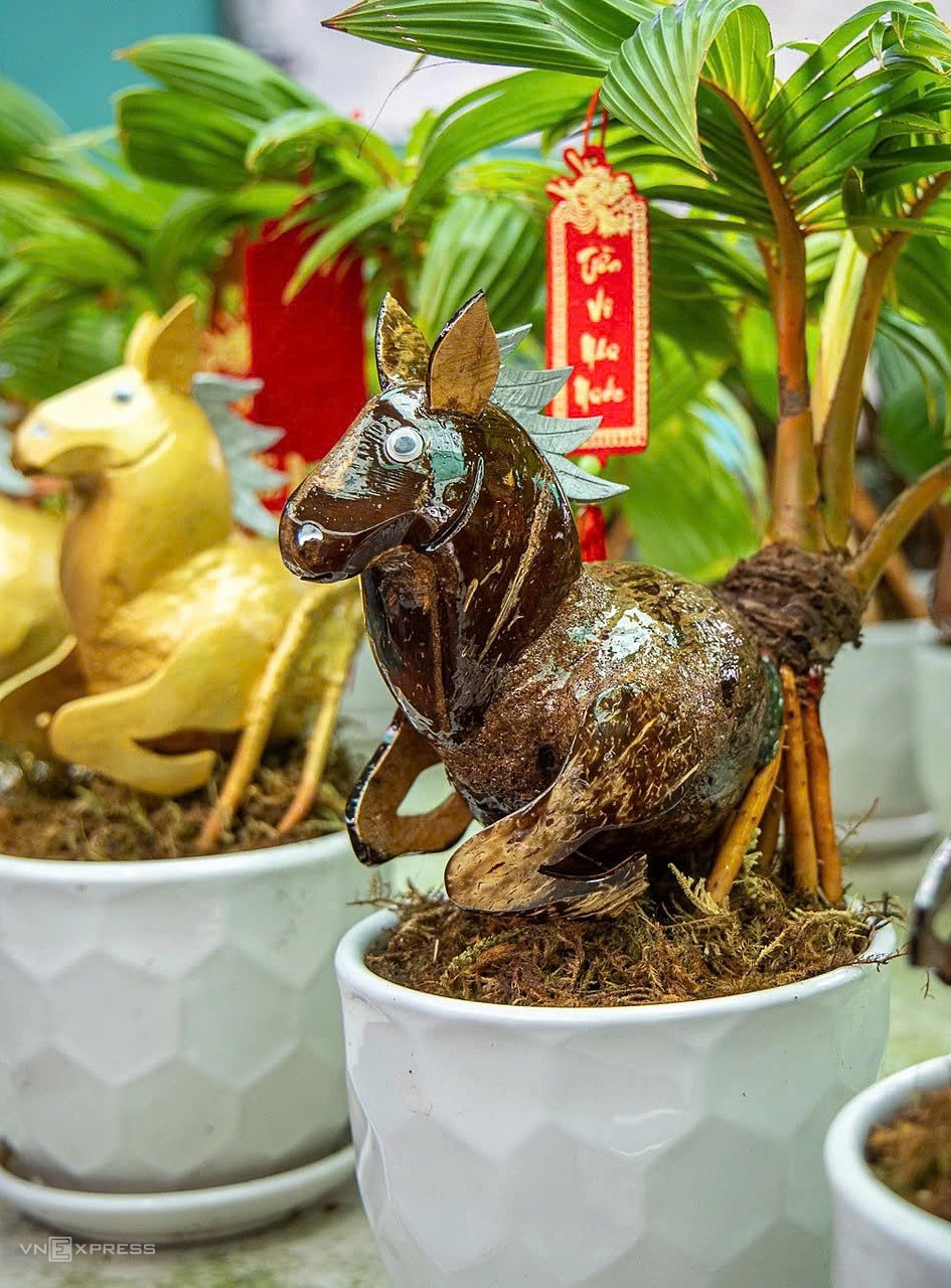 Trong khu vườn trên đường Trương Văn Đa (phường Bình Lợi, TP HCM), anh Đậu Thanh Tùng trưng bày hàng trăm gốc dừa kiểng được tạo hình ngựa, linh vật Tết Bính Ngọ. Đây là năm thứ 7 anh làm dừa bonsai hình các con giáp.
