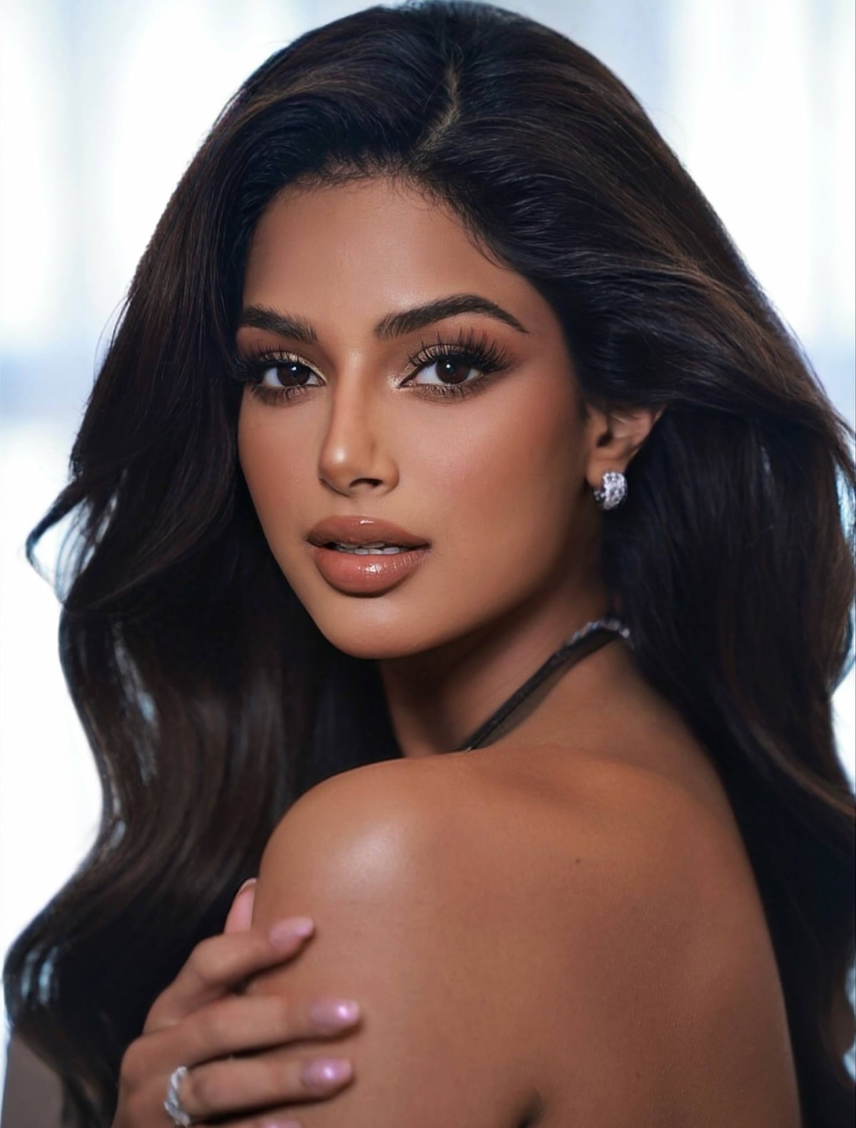 Chuyên gia trang điểm Quân Nguyễn, Pu Lê nói ngỡ ngàng khi gặp lại Harnaaz Sandhu tại buổi trang điểm và làm tóc cho cô, hôm 16/10. Họ chọn son nâu trầm, nhấn vào mắt, môi và đánh phồng tóc, tôn lên nét quyến rũ của người đẹp. "Cô ấy vẫn ngọt ngào và đầy cuốn hút", Quân Nguyễn nói.