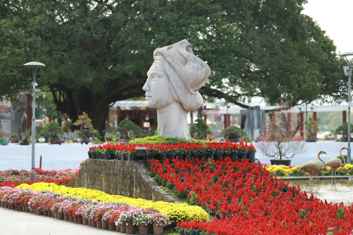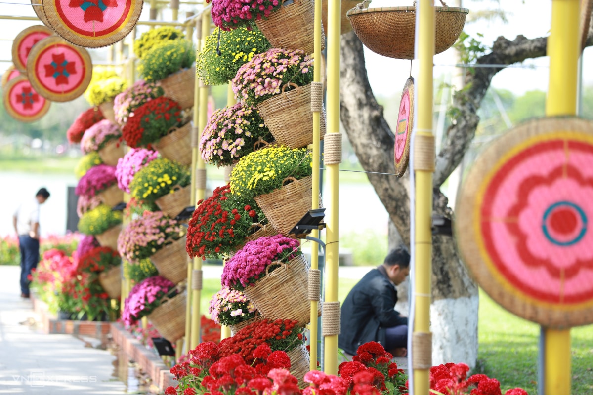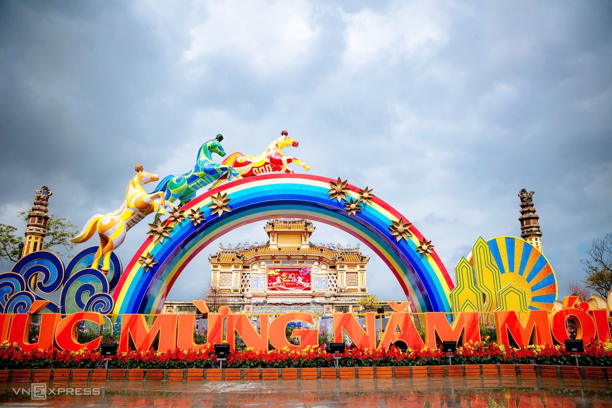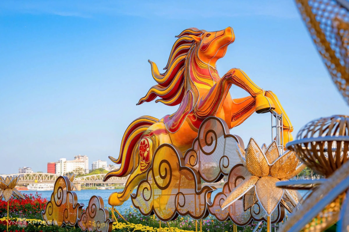 Công viên hai bờ sông Hương được trang trí nhiều loài hoa cùng linh vật đón Tết Bính Ngọ, nổi bật là cặp ngựa xanh - đỏ tượng trưng âm dương hài hòa.