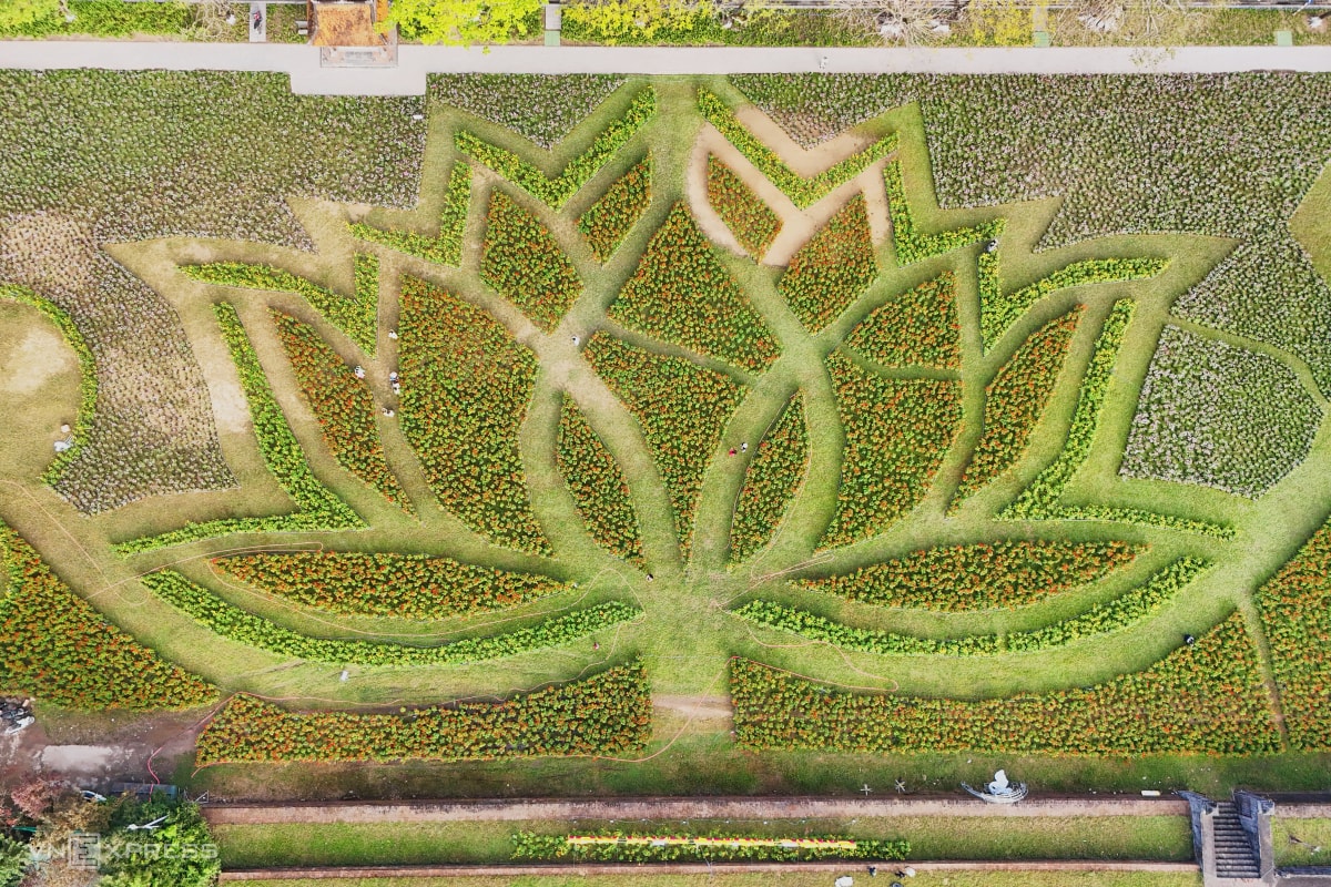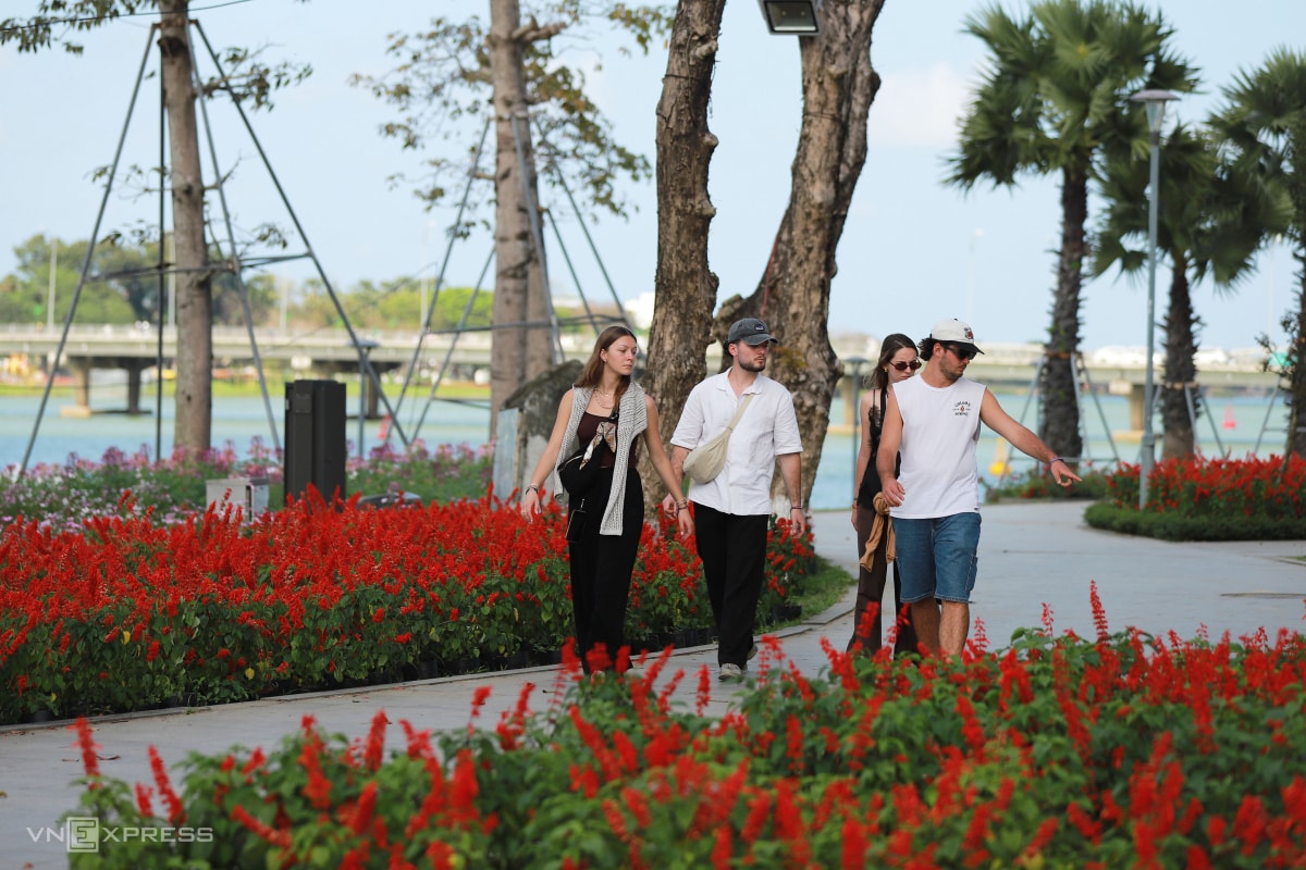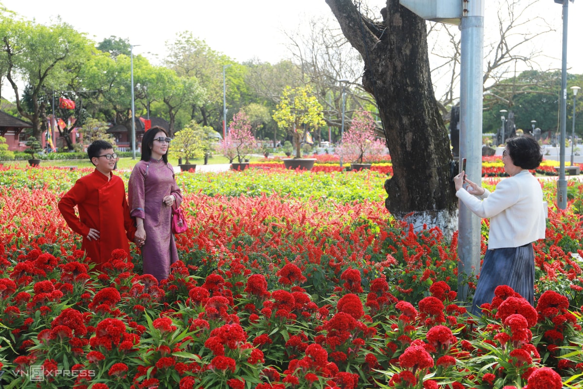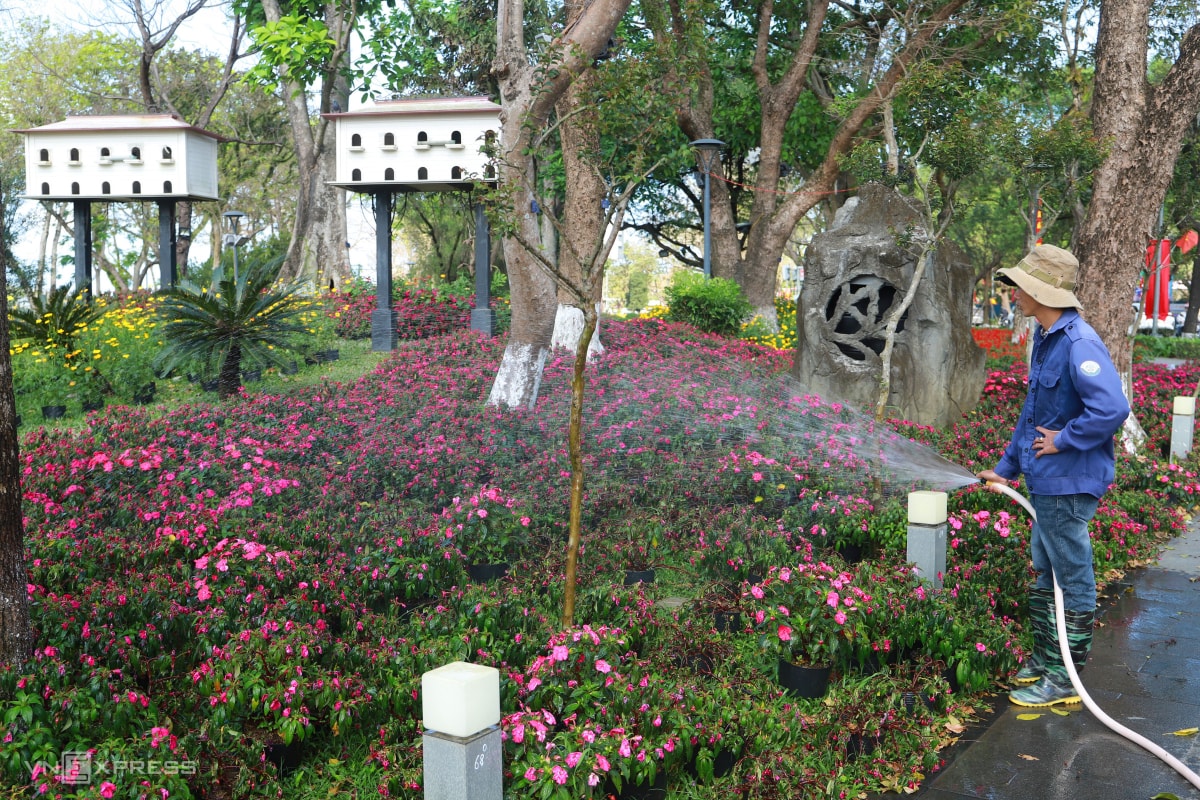 Công viên hai bờ sông Hương được trang trí nhiều loài hoa cùng linh vật đón Tết Bính Ngọ, nổi bật là cặp ngựa xanh - đỏ tượng trưng âm dương hài hòa.