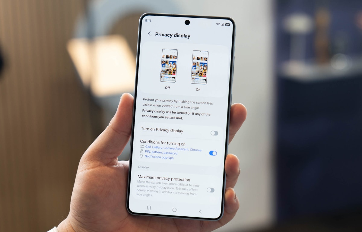 Khi kích hoạt tính, máy tự điều chỉnh việc chiếu sáng của các điểm ảnh, lúc này chỉ góc nhìn thẳng mới thấy được hình ảnh. Tuy nhiên, Samsung chỉ trang bị Privacy Display cho bản cao cấp nhất, không có trên Galaxy S26 và S26+.