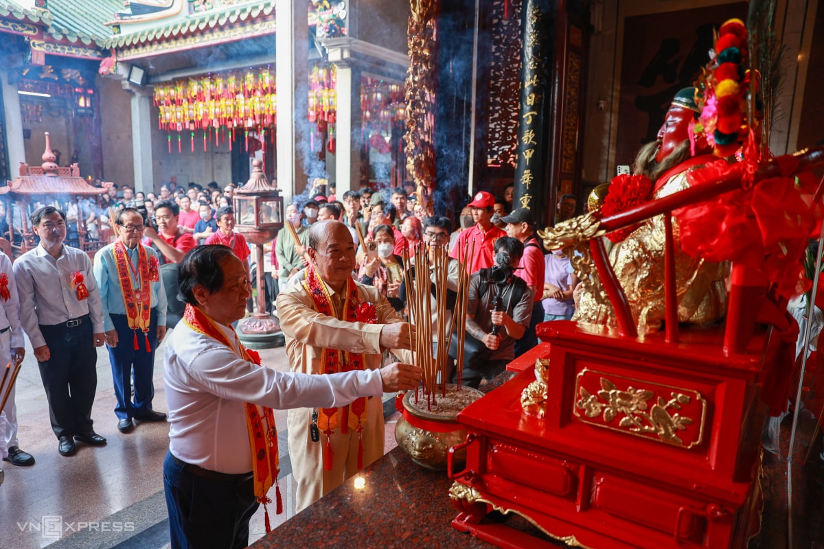 9h30, tượng Quan Thánh Đế Quân được rước về lại Hội quán Nghĩa An. Nhiều người thắp hương, cầu nguyện, xin lộc trước ban thờ.