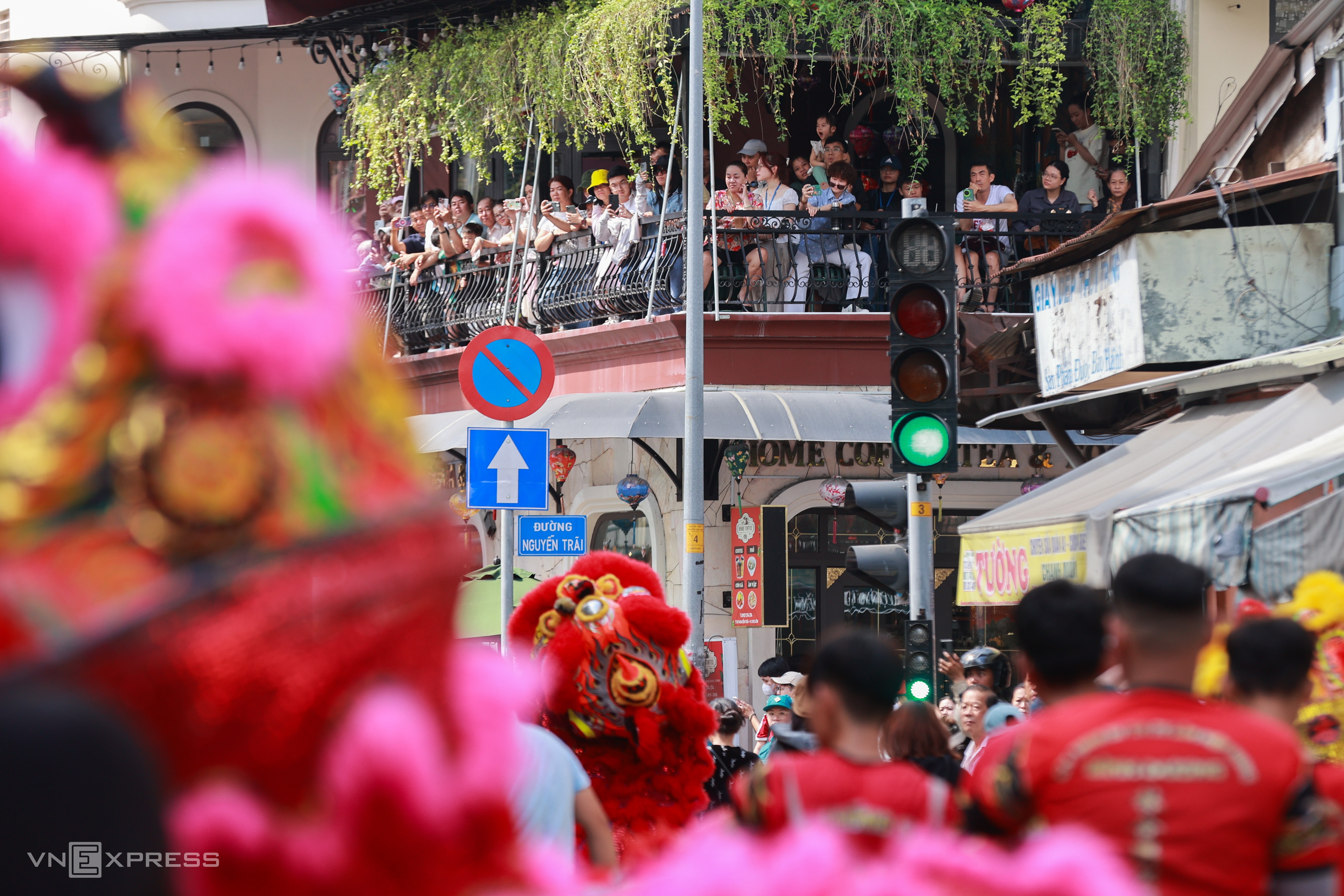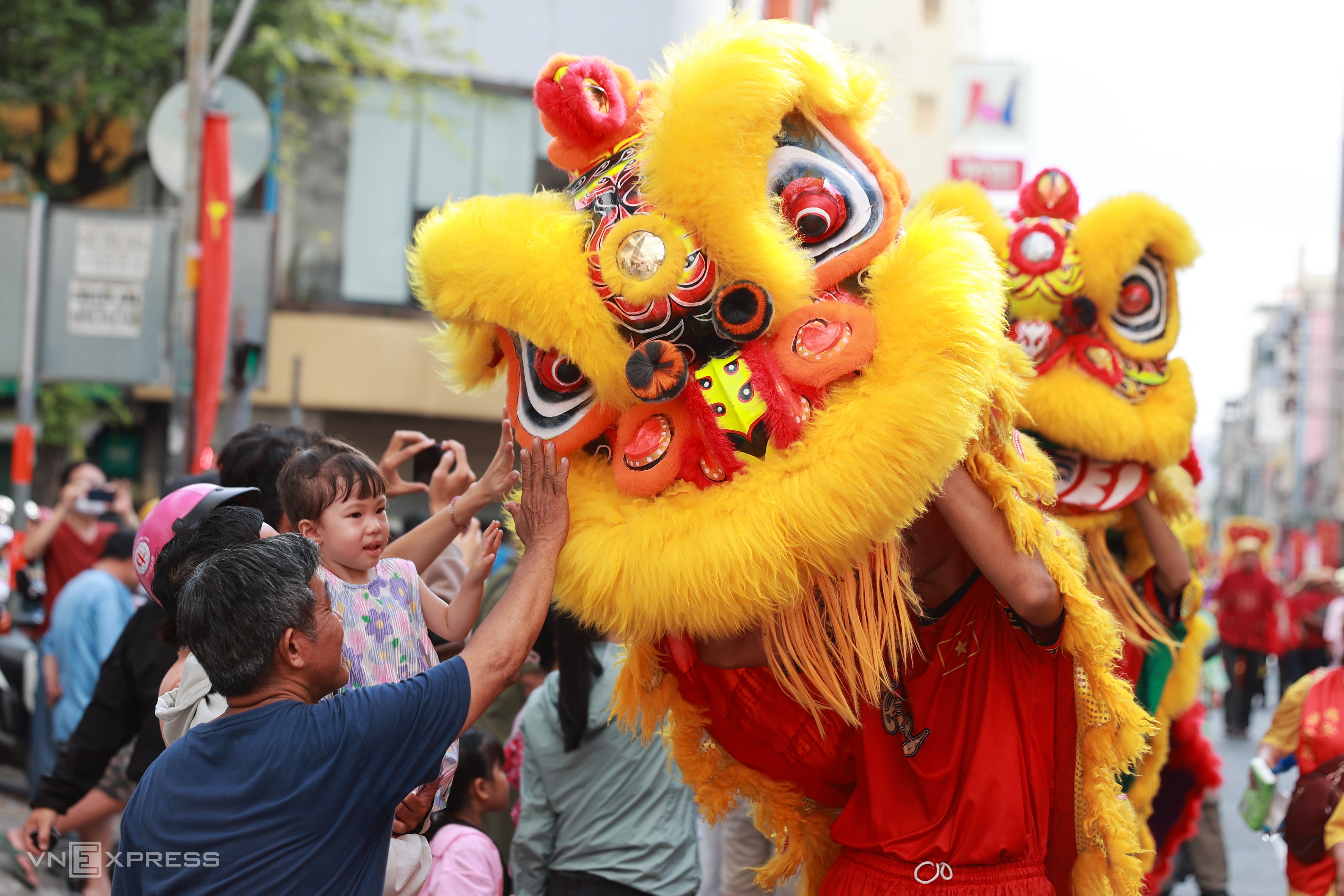 Tại các ngã tư, khu dân cư, chùa và hội quán, các đoàn dừng lại biểu diễn múa lân, múa rồng phục vụ người dân trong khoảng một phút.