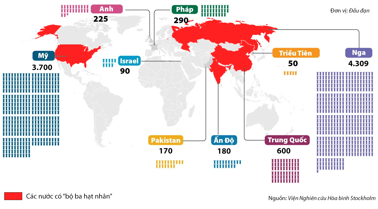 Tổng cộng 9.614 đầu đạn hạt nhân đang được biên chế khắp thế giới, trong đó Nga và Mỹ sở hữu kho vũ khí nguyên tử lớn nhất.