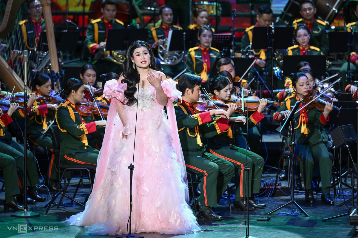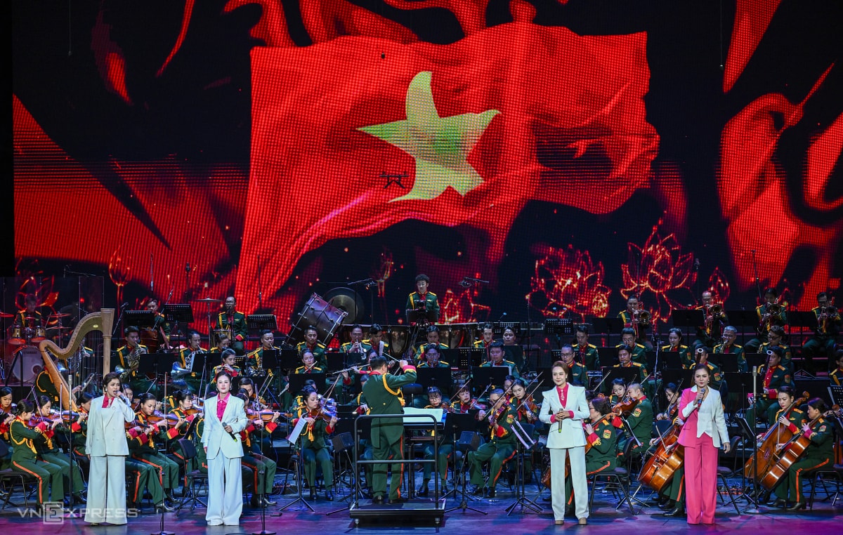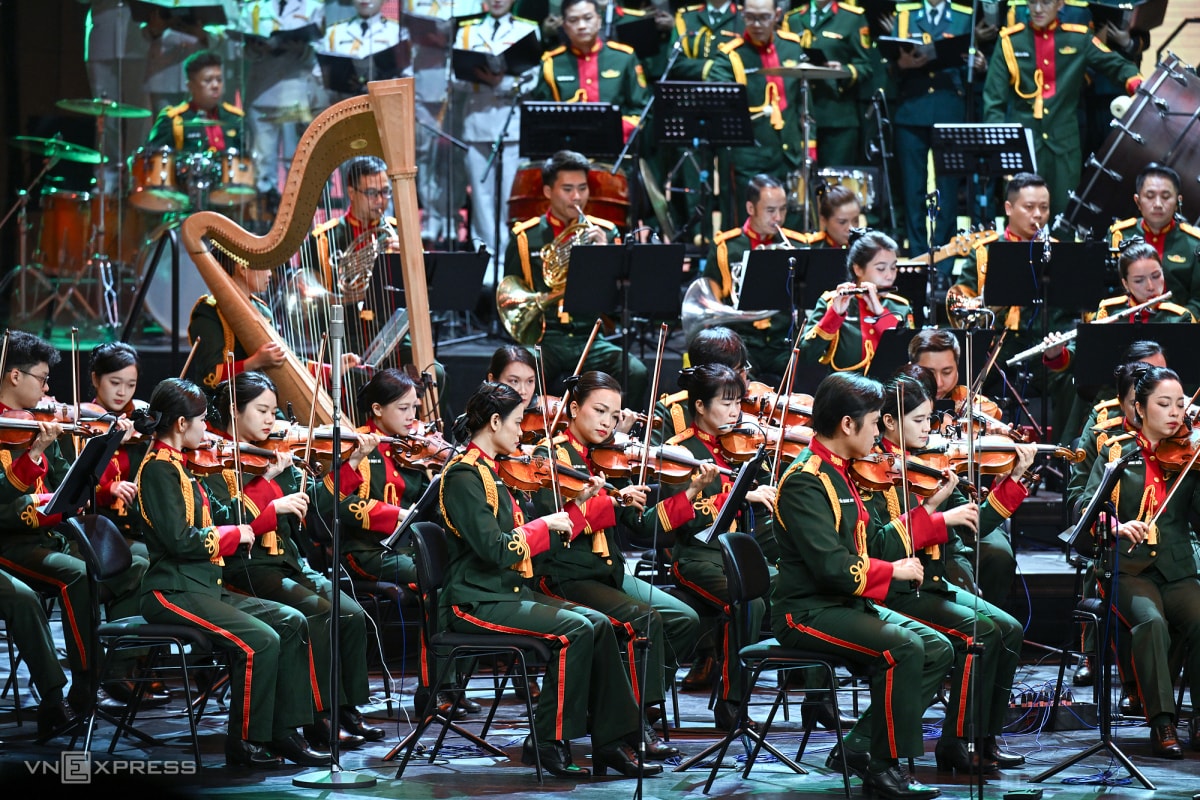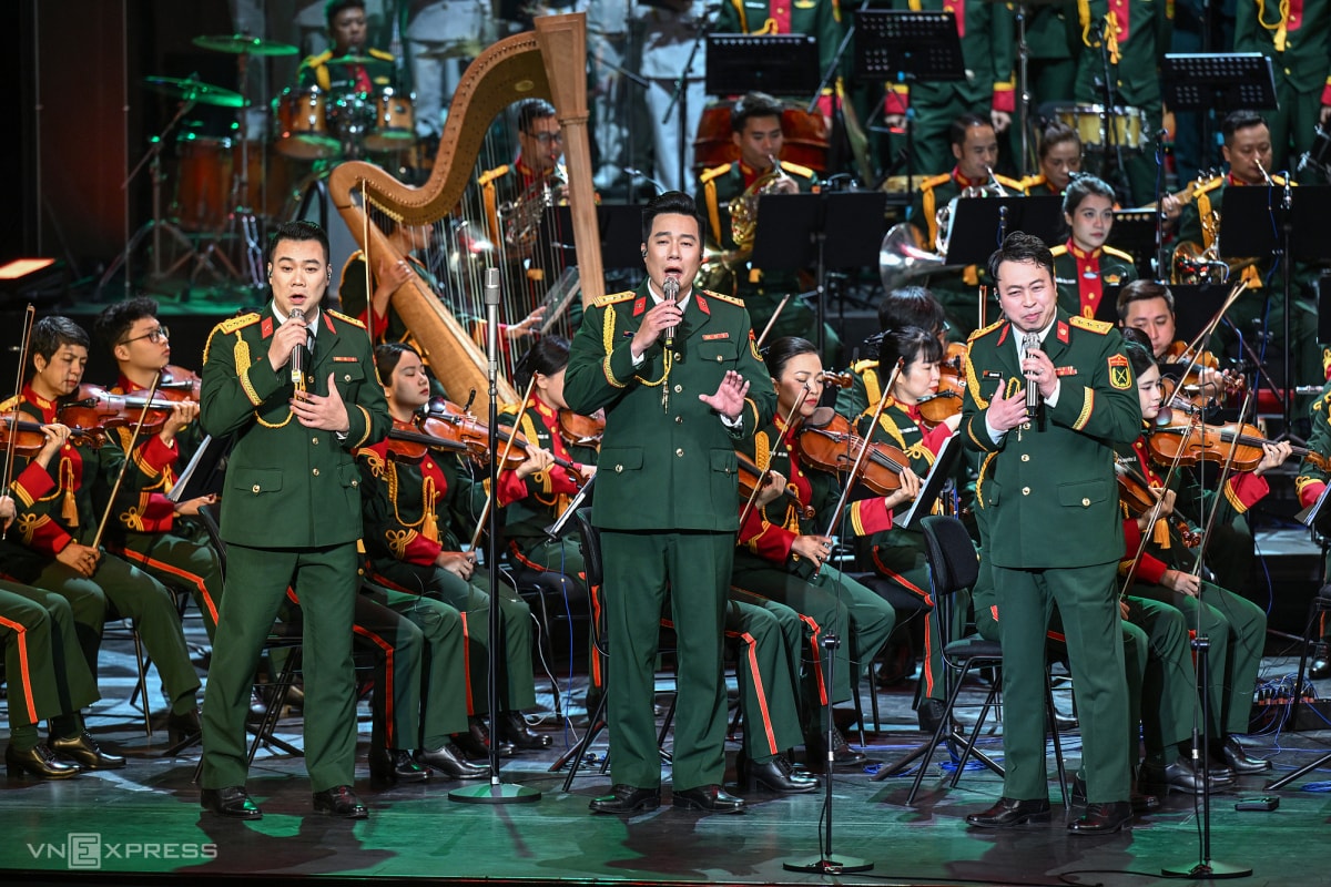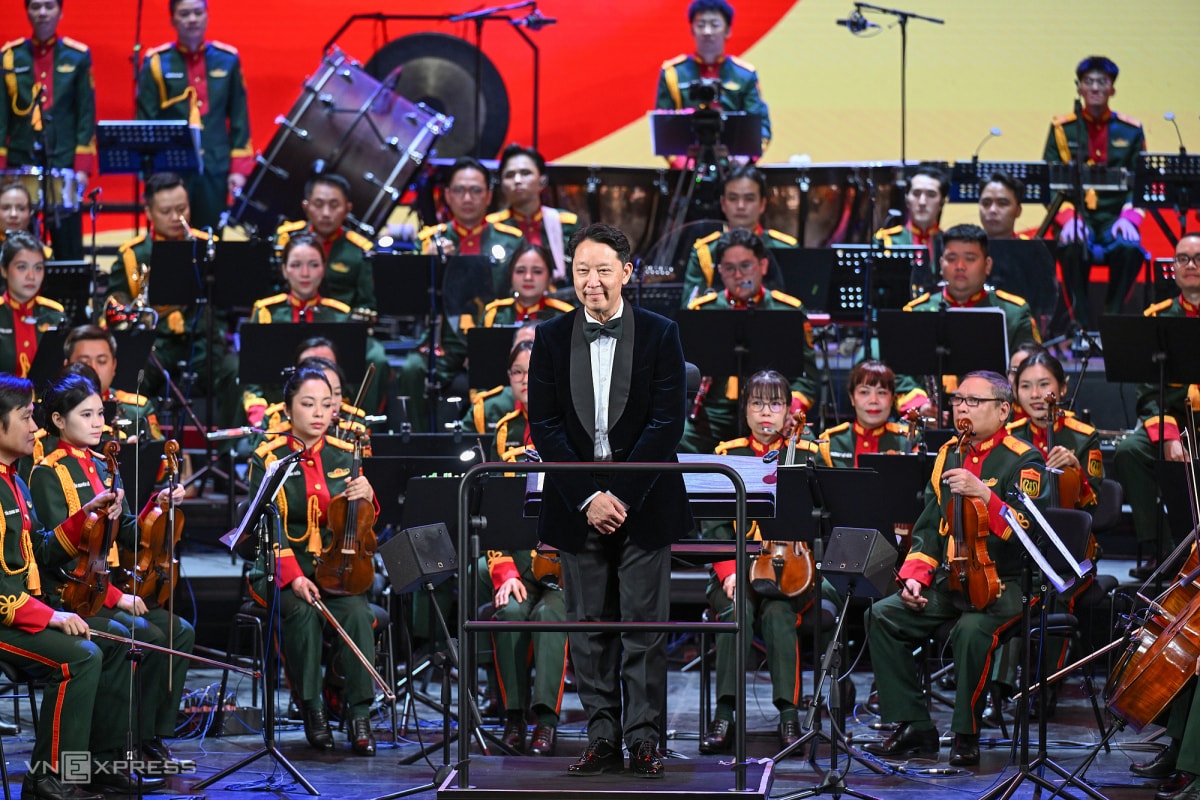 Nhạc trưởng Lê Phi Phi (giữa) đảm nhận vai trò chỉ huy chính trong tổng thể đêm diễn, bên cạnh Đại tá, Nghệ sĩ Nhân dân Nguyễn Xuân Bắc. Ông lãnh đạo dàn nhạc cùng đội hợp xướng nhịp nhàng. Ở một số tiết mục, ông ra hiệu cho khán giả vỗ tay theo từng giai điệu, được nhiều người hưởng ứng.