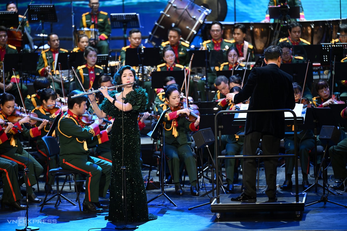 Khán phòng Nhà hát Hồ Gươm như lắng đọng khi nghệ sĩ sáo Thu Hương biểu diễn Flute Concerto: Tình yêu của biển. Cô cho biết vinh dự, tự hào khi lần đầu được tham gia với một dàn nhạc quân đội chuyên nghiệp, quy mô lớn, có đủ tính năng, thành phần.