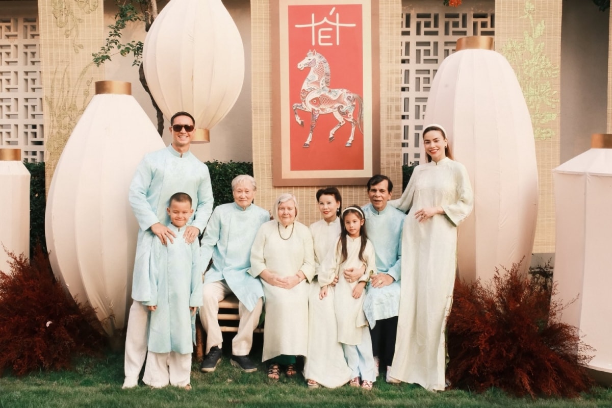 Trước đó, cô cùng cả nhà quây quần ăn Tết ở biệt thự khu Thảo Điền, TP HCM. Bố mẹ Kim Lý (thứ hai, ba từ trái qua) từ Thụy Điển về nước vào tháng 11/2025 mừng sinh nhật con dâu, sau đó đại gia đình đón năm mới cùng nhau.