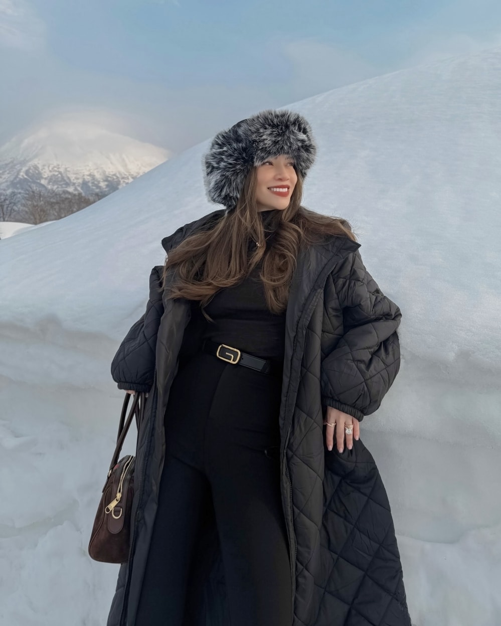 Cô diện phong cách Thu Đông với trang phục đơn sắc, phối cùng thắt lưng da và mũ lông.
