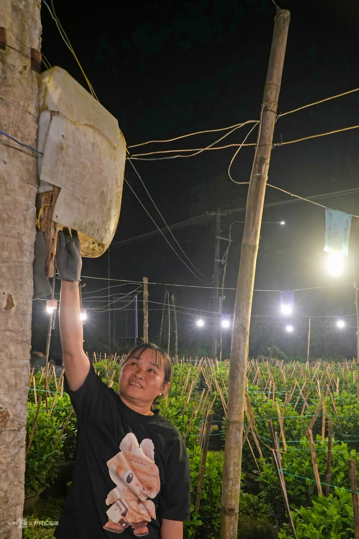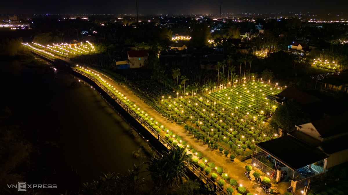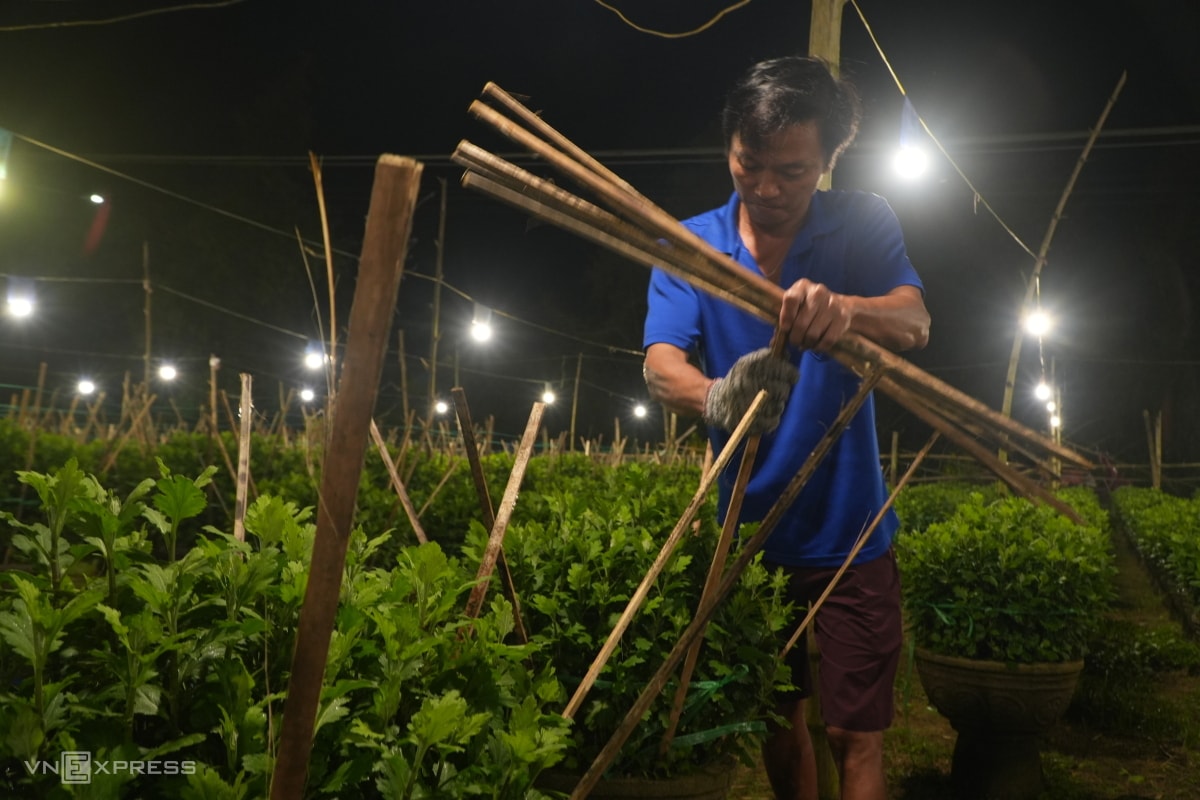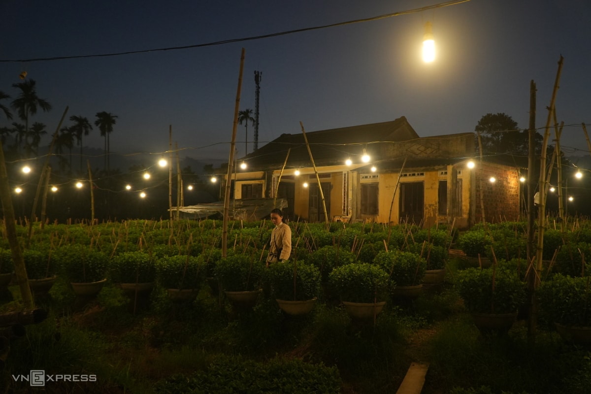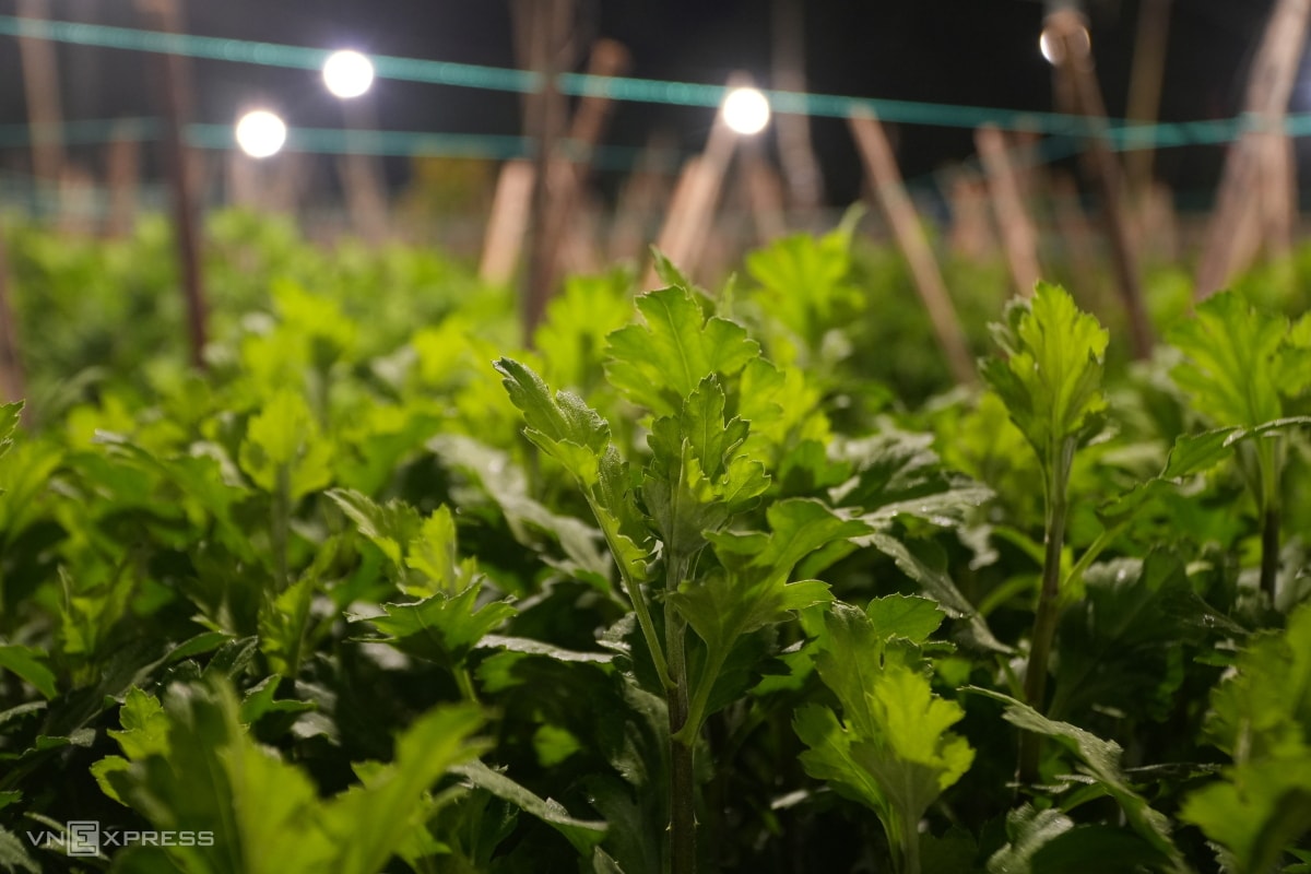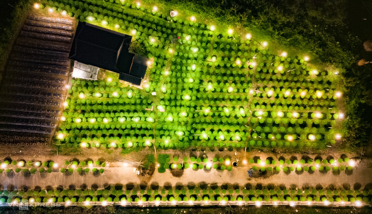 Người dân làng hoa Nghĩa Hiệp thắp hàng chục nghìn đèn điện để "thúc" cho cây lớn đều, nở hoa đúng Tết, khiến hàng trăm khu vườn sáng rực xuyên đêm.