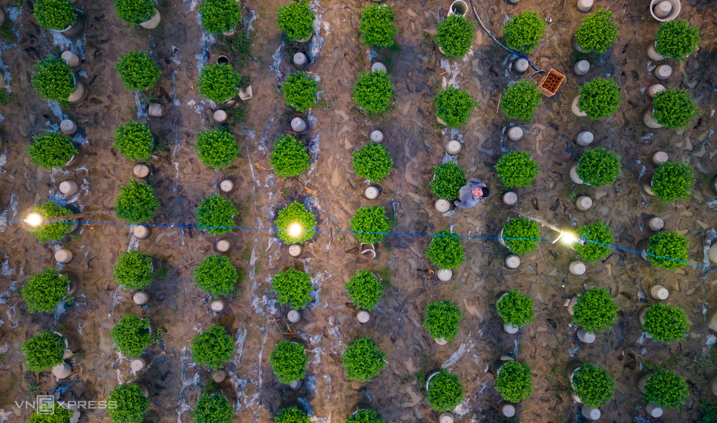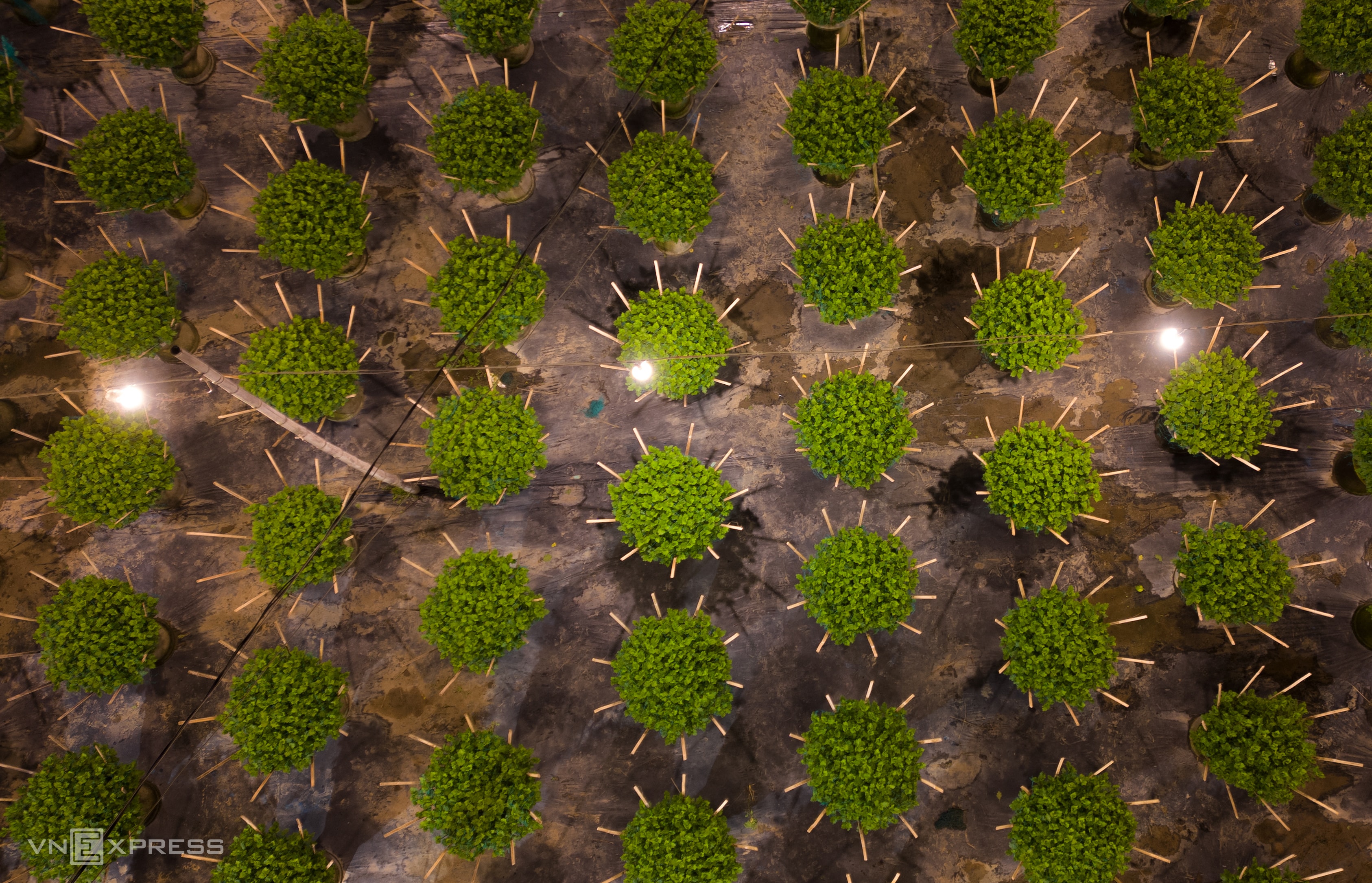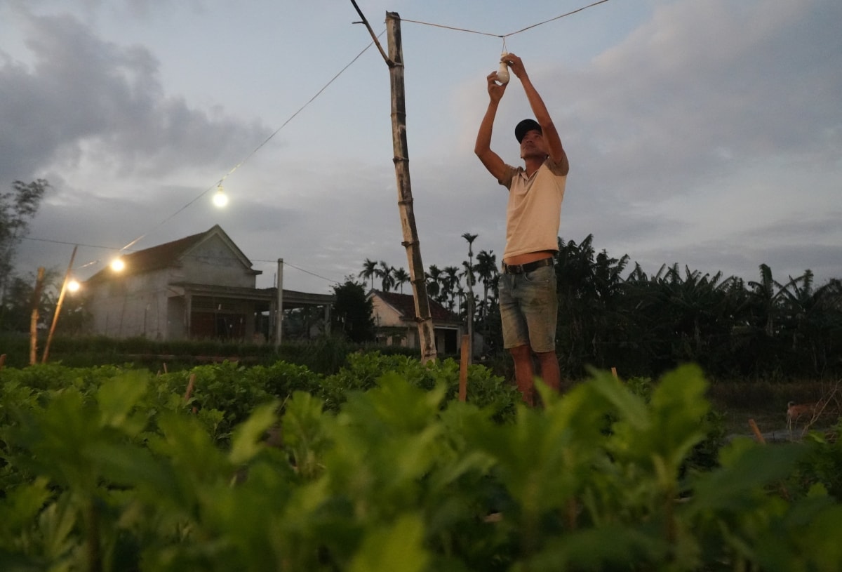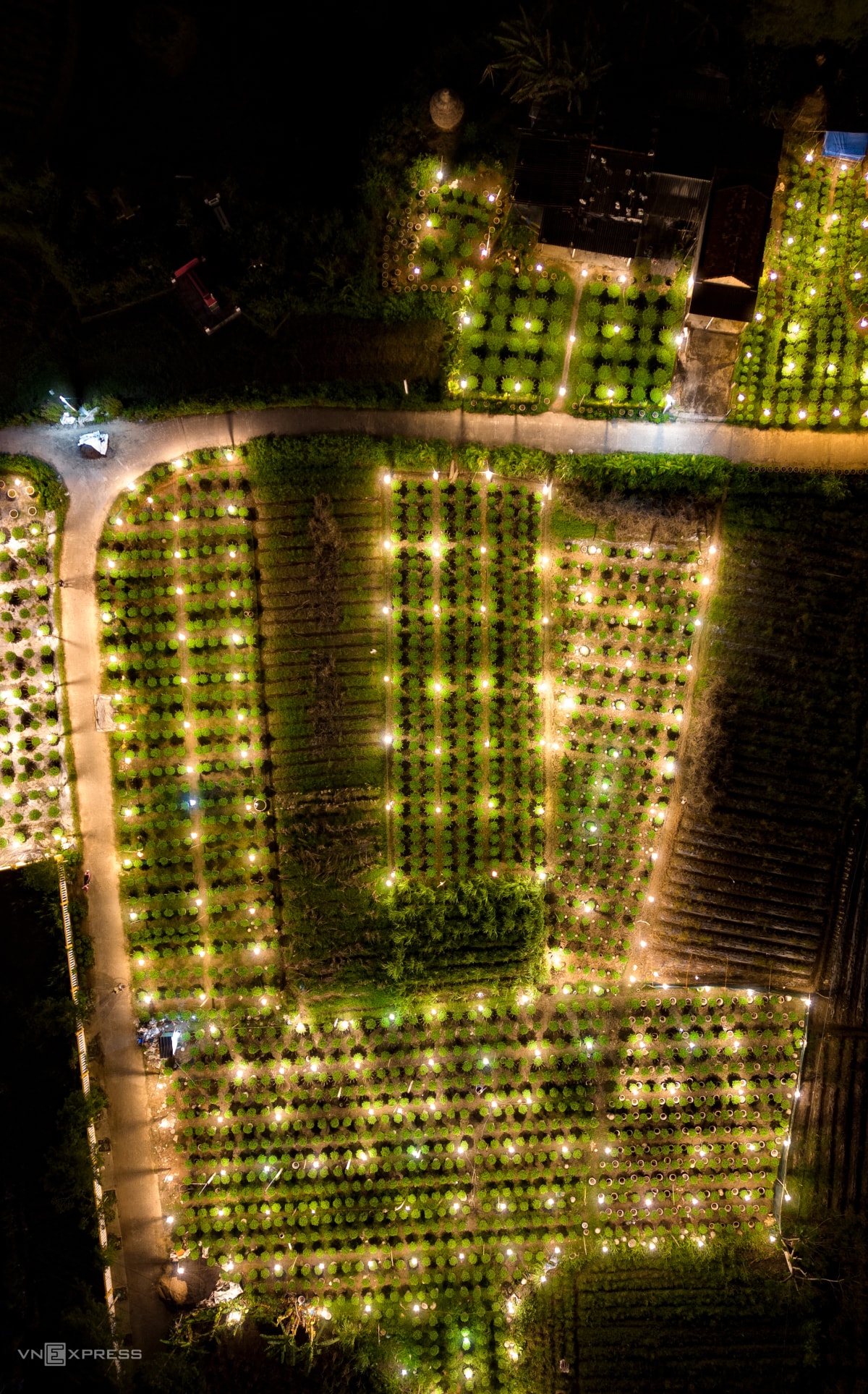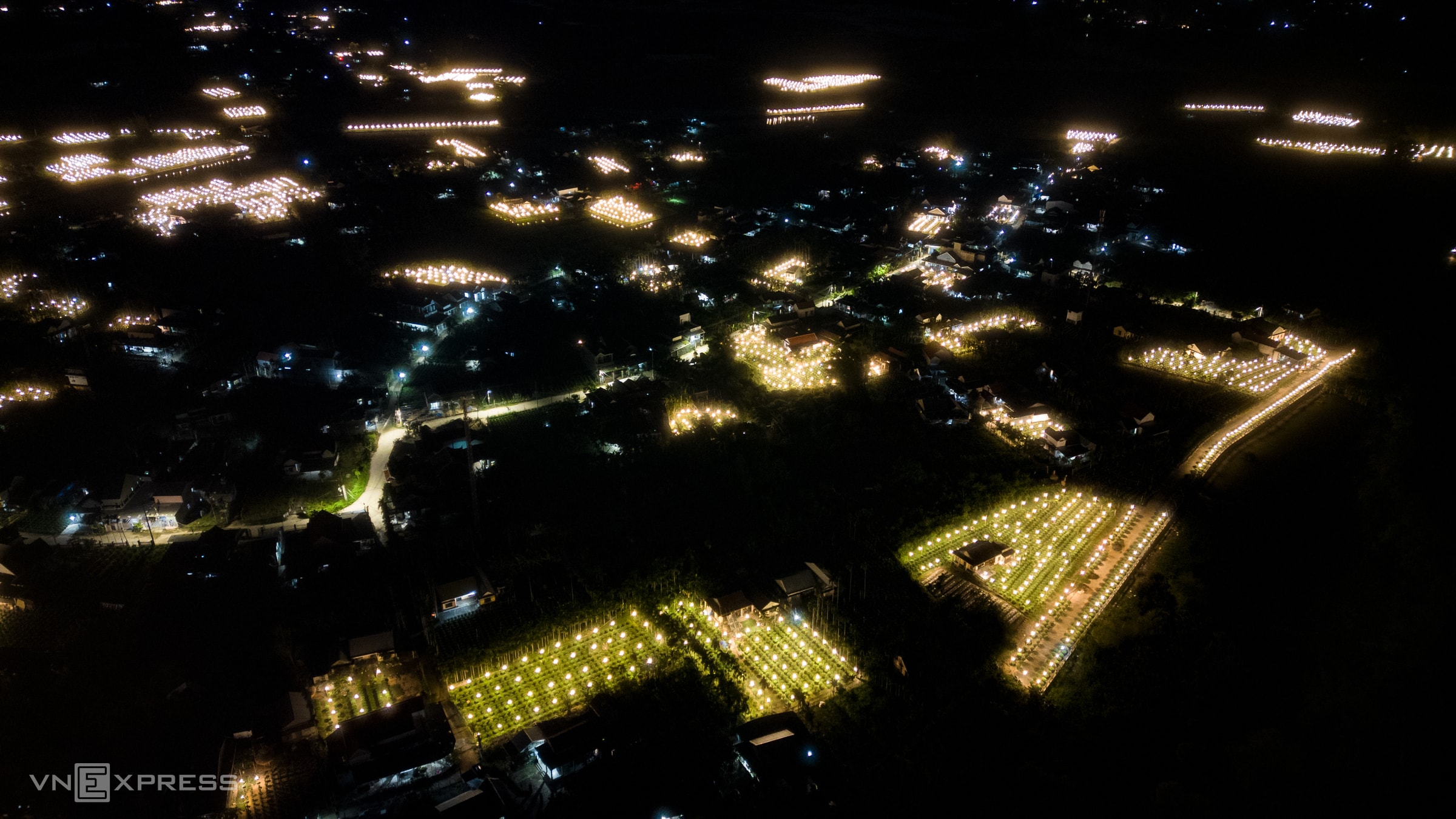 Người dân làng hoa Nghĩa Hiệp thắp hàng chục nghìn đèn điện để "thúc" cho cây lớn đều, nở hoa đúng Tết, khiến hàng trăm khu vườn sáng rực xuyên đêm.
