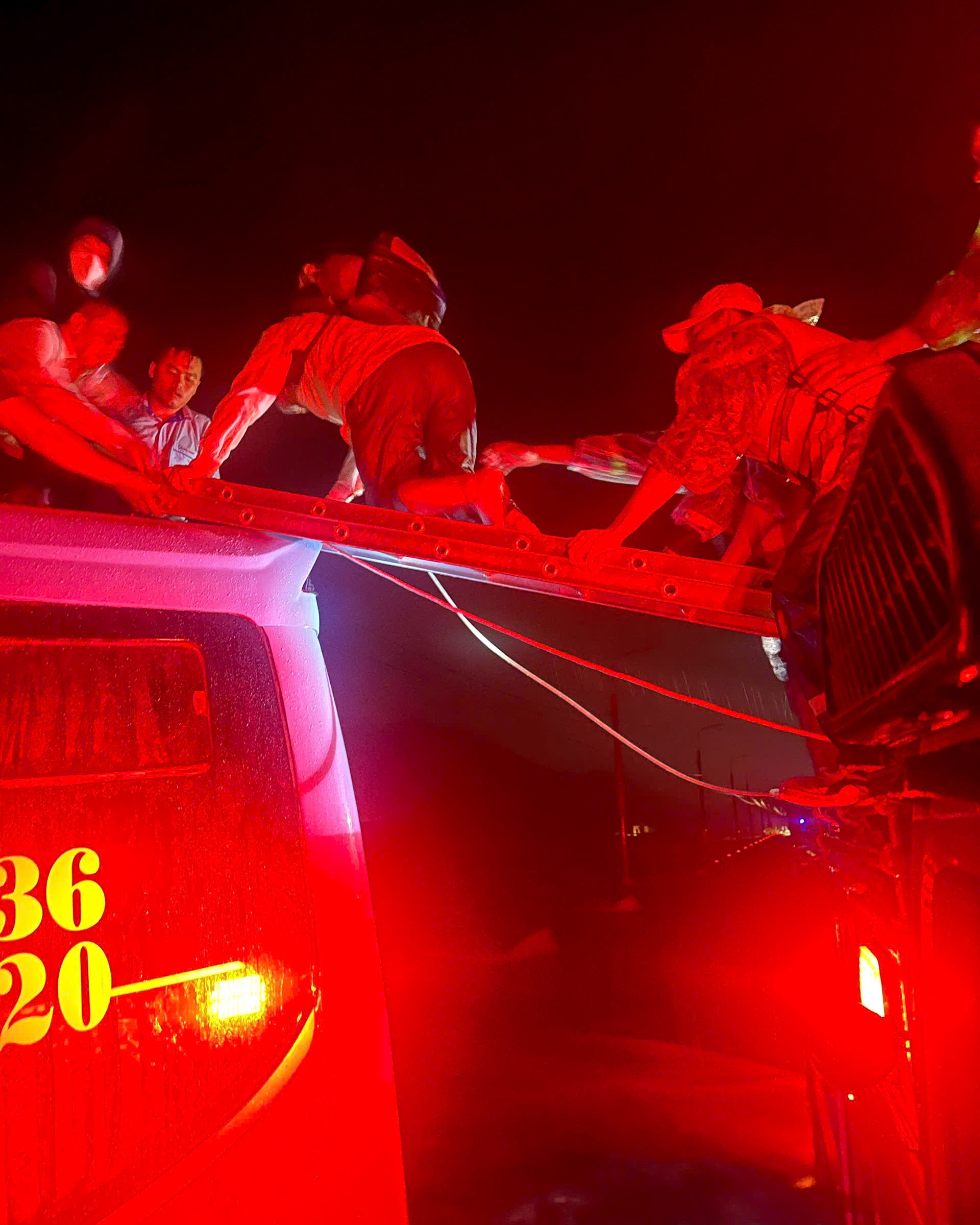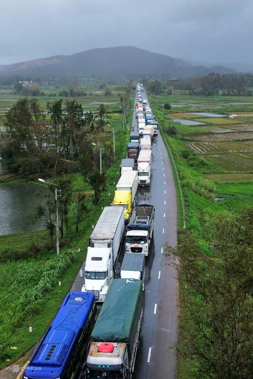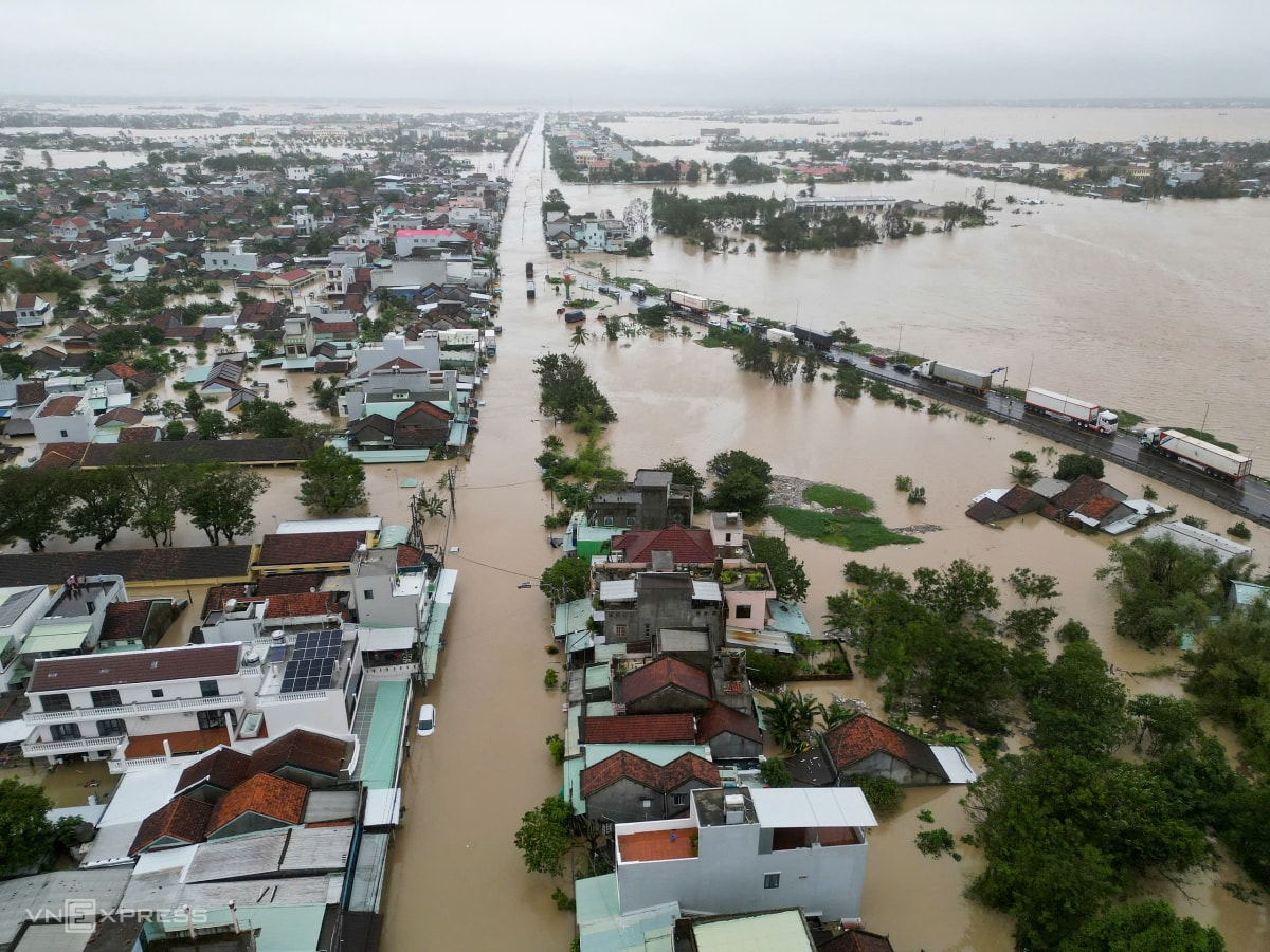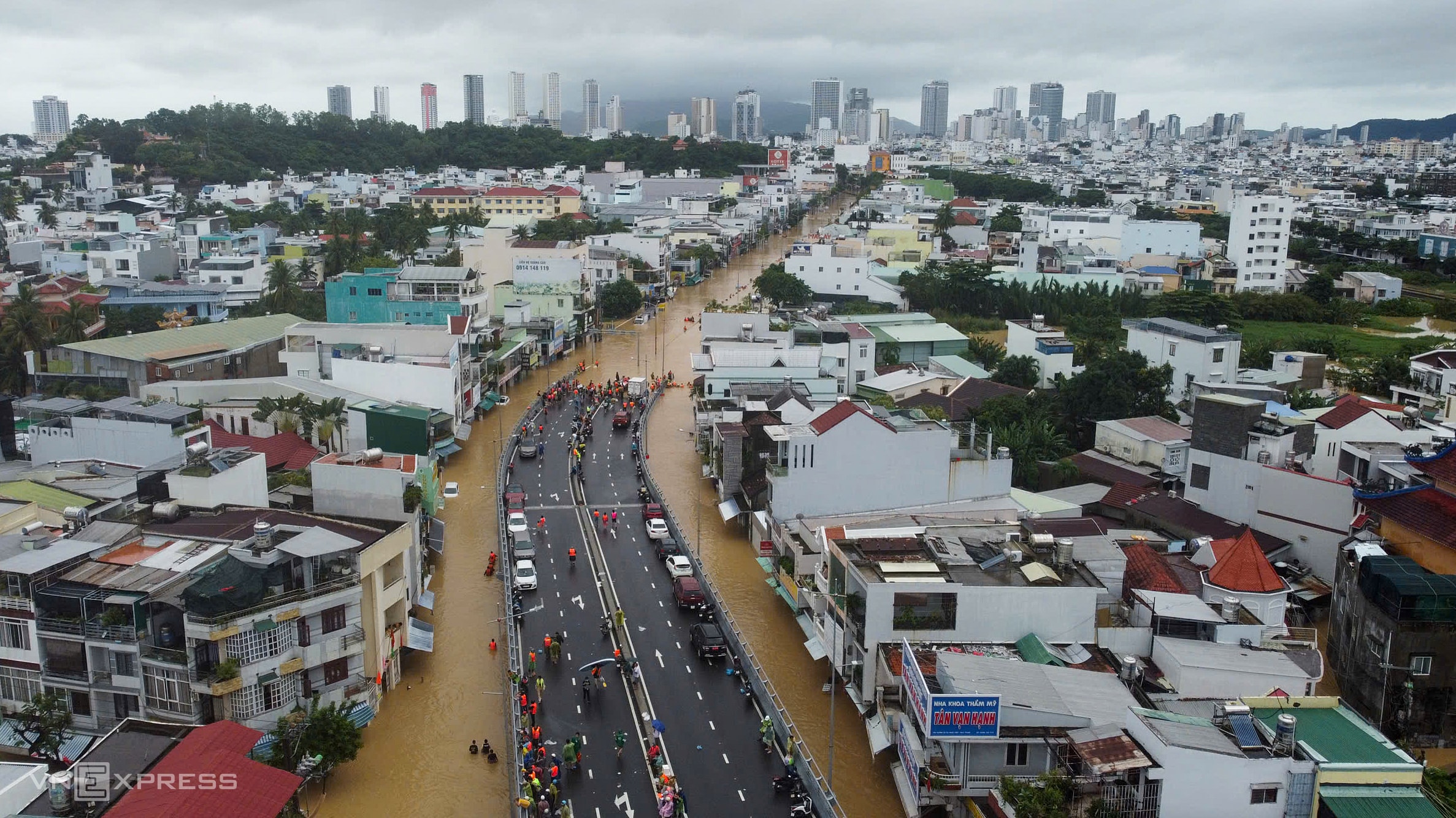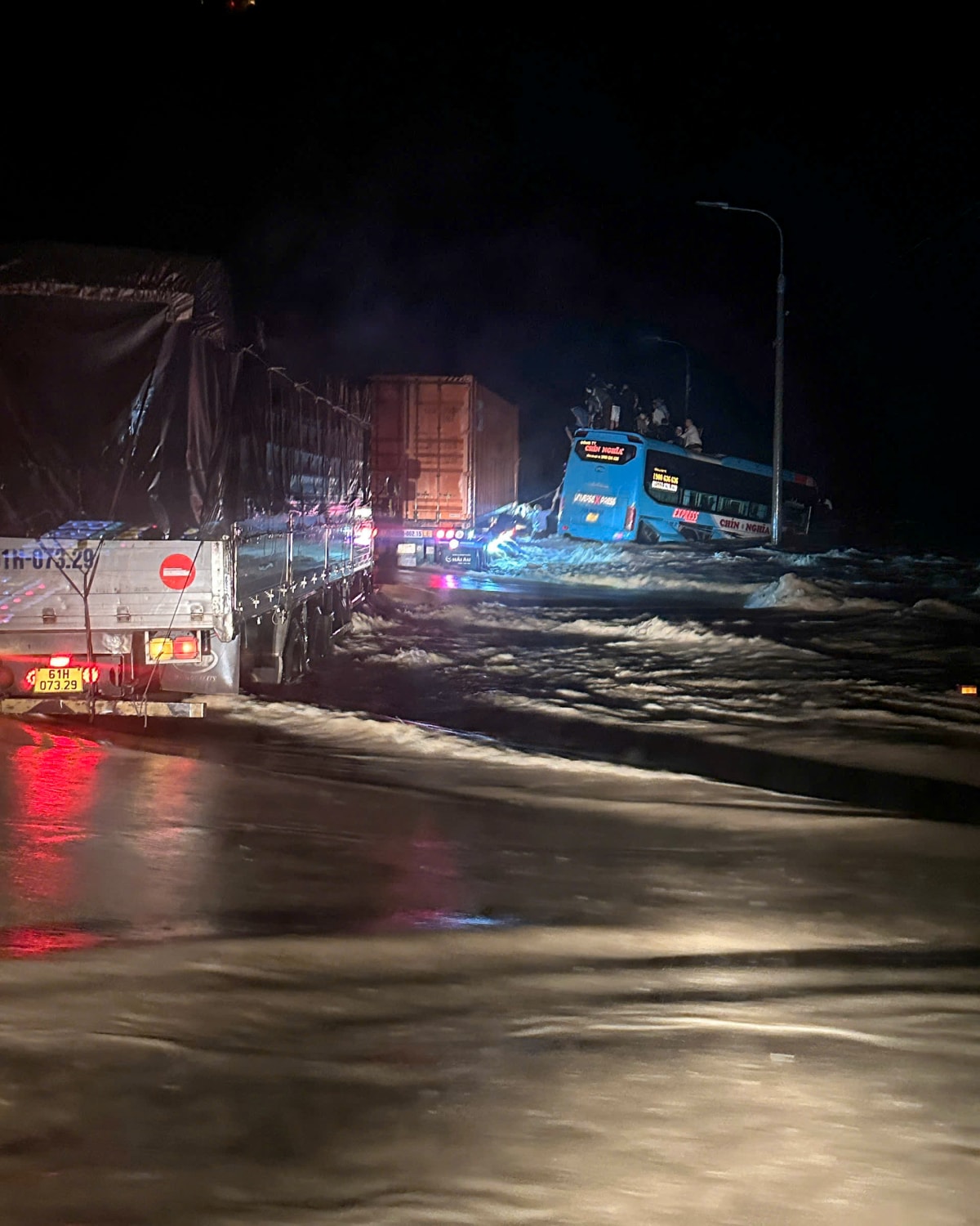 Nhiều đoạn quốc lộ 1A qua Gia Lai, Đăk Lăk, Khánh Hòa ngập sâu, giao thông tê liệt, ở Diên Khánh cảnh sát phải ứng cứu một xe khách mắc kẹt trong dòng nước chảy xiết.