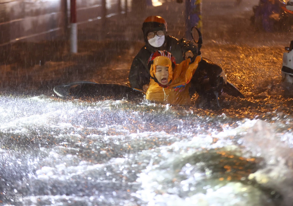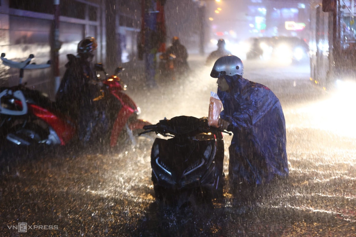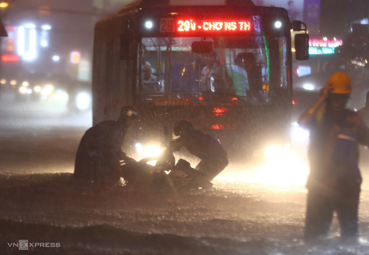 Mưa lớn cùng lúc giờ tan tầm khiến nhiều tuyến đường ở TP HCM ùn tắc nghiêm trọng, có nơi sóng nước đánh ngã người đi xe máy, tối 8/10.