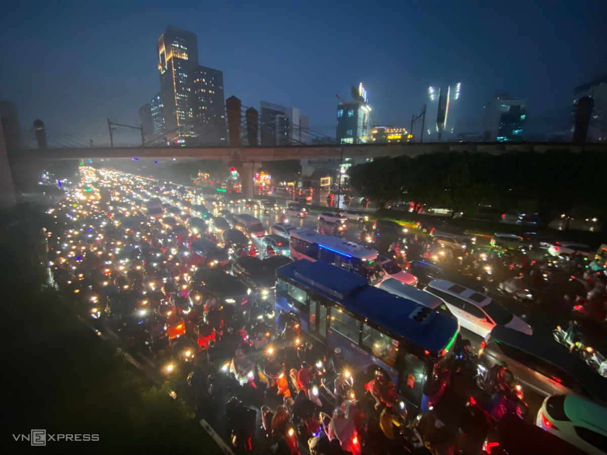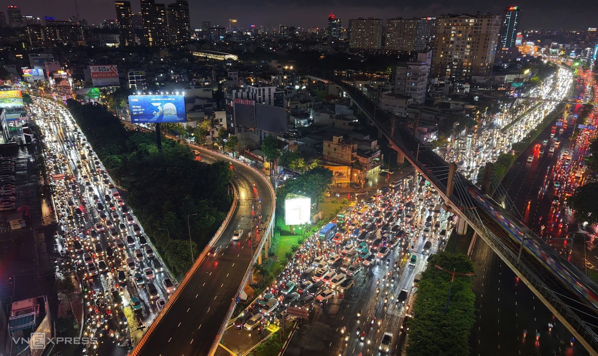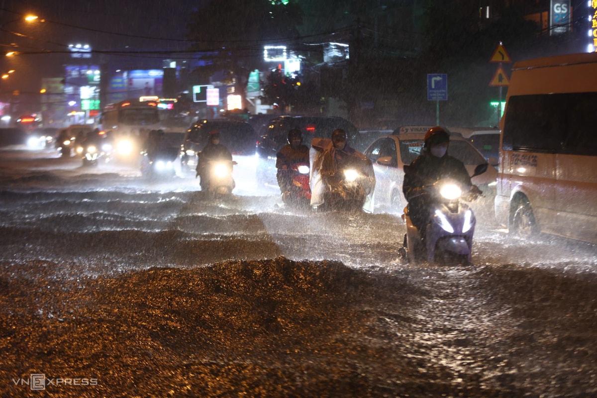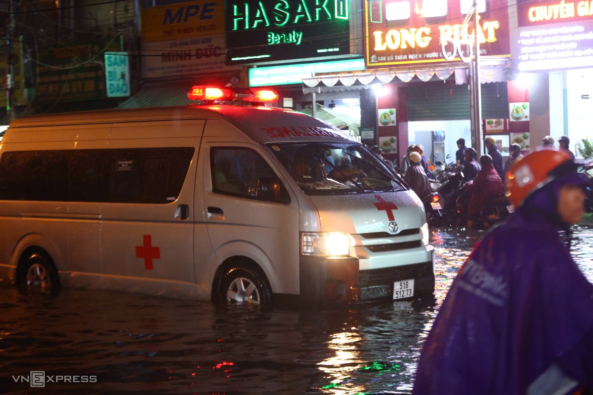 Mưa lớn cùng lúc giờ tan tầm khiến nhiều tuyến đường ở TP HCM ùn tắc nghiêm trọng, có nơi sóng nước đánh ngã người đi xe máy, tối 8/10.