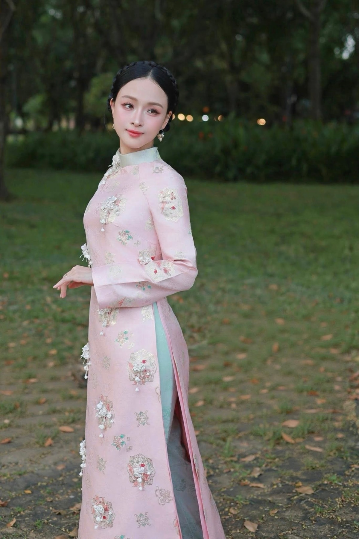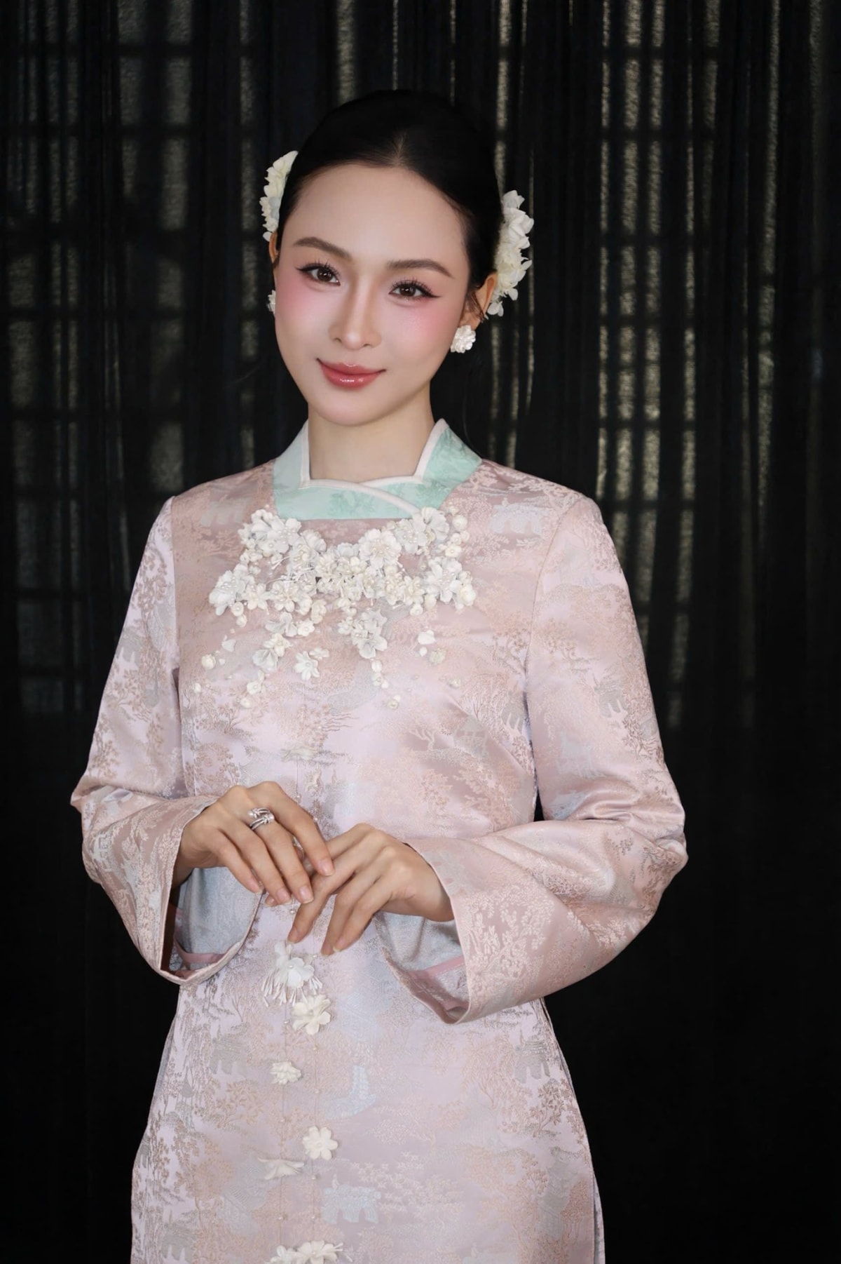 Cô mặc áo dài gấm, họa tiết cổ điển của nhà thiết kế Hà Thanh Việt tại sự kiện hồi tháng 12/2025. Phương Nga kết hợp trang phục với phụ kiện bông tai, hoa cài đầu đồng điệu.