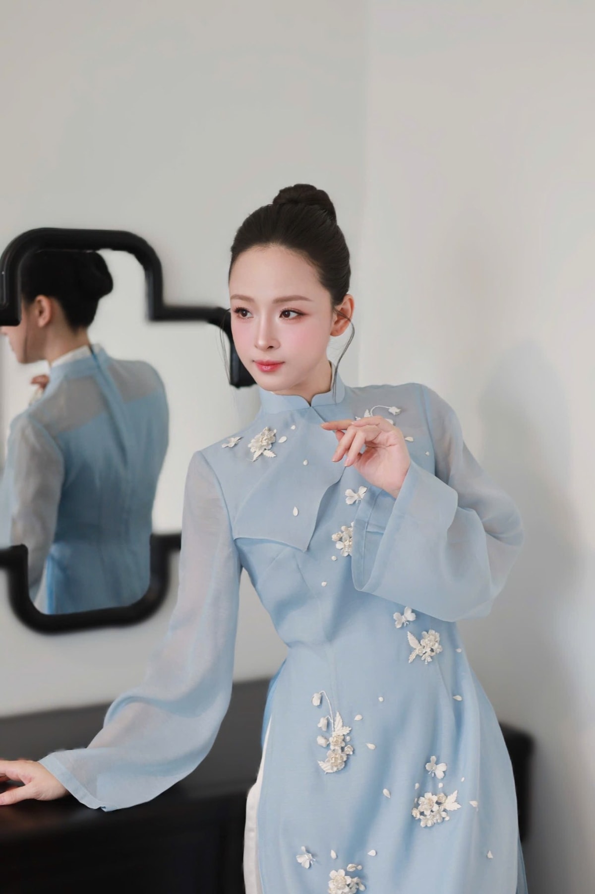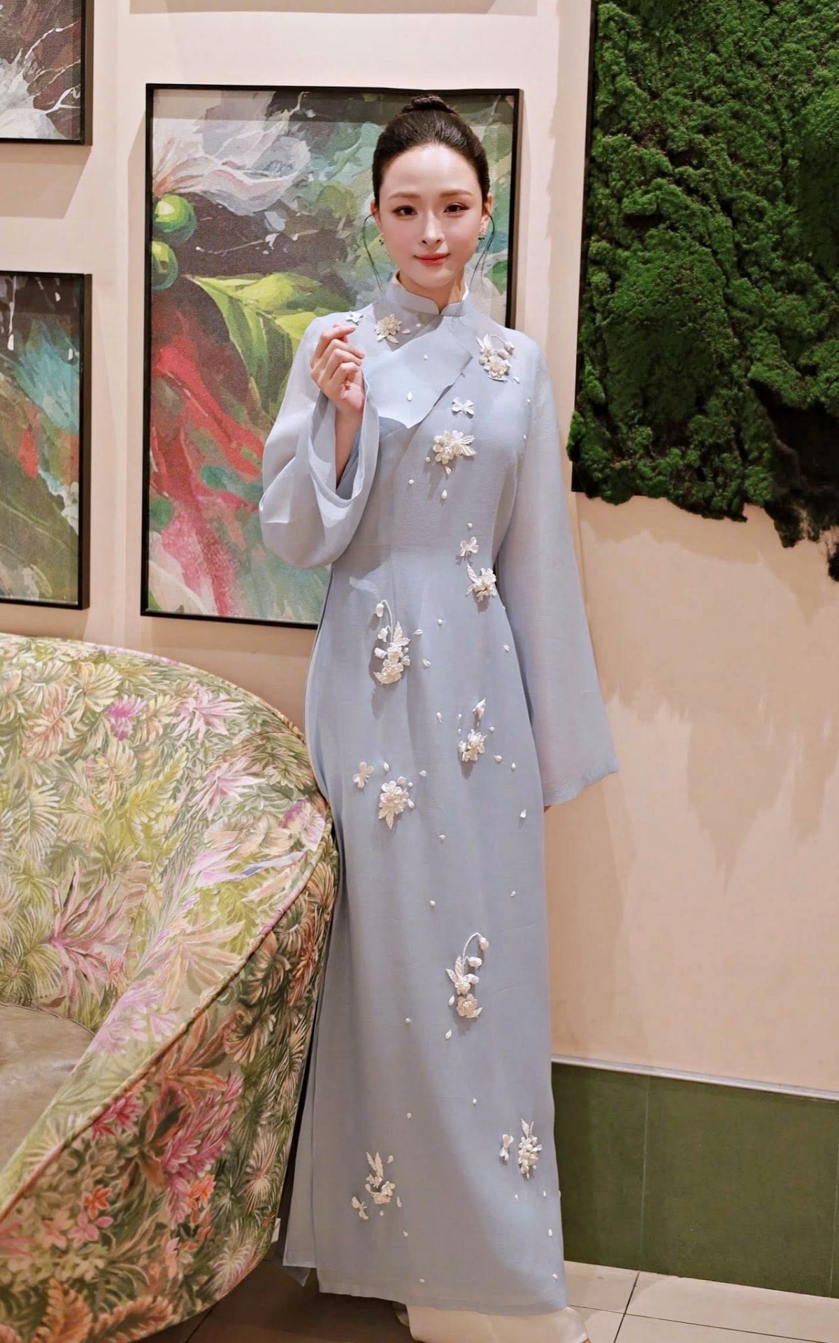 Tại hoạt động khác thuộc khuôn khổ chương trình, Phương Nga ghi điểm với áo dài đính hoa trên nền lụa cao cấp.