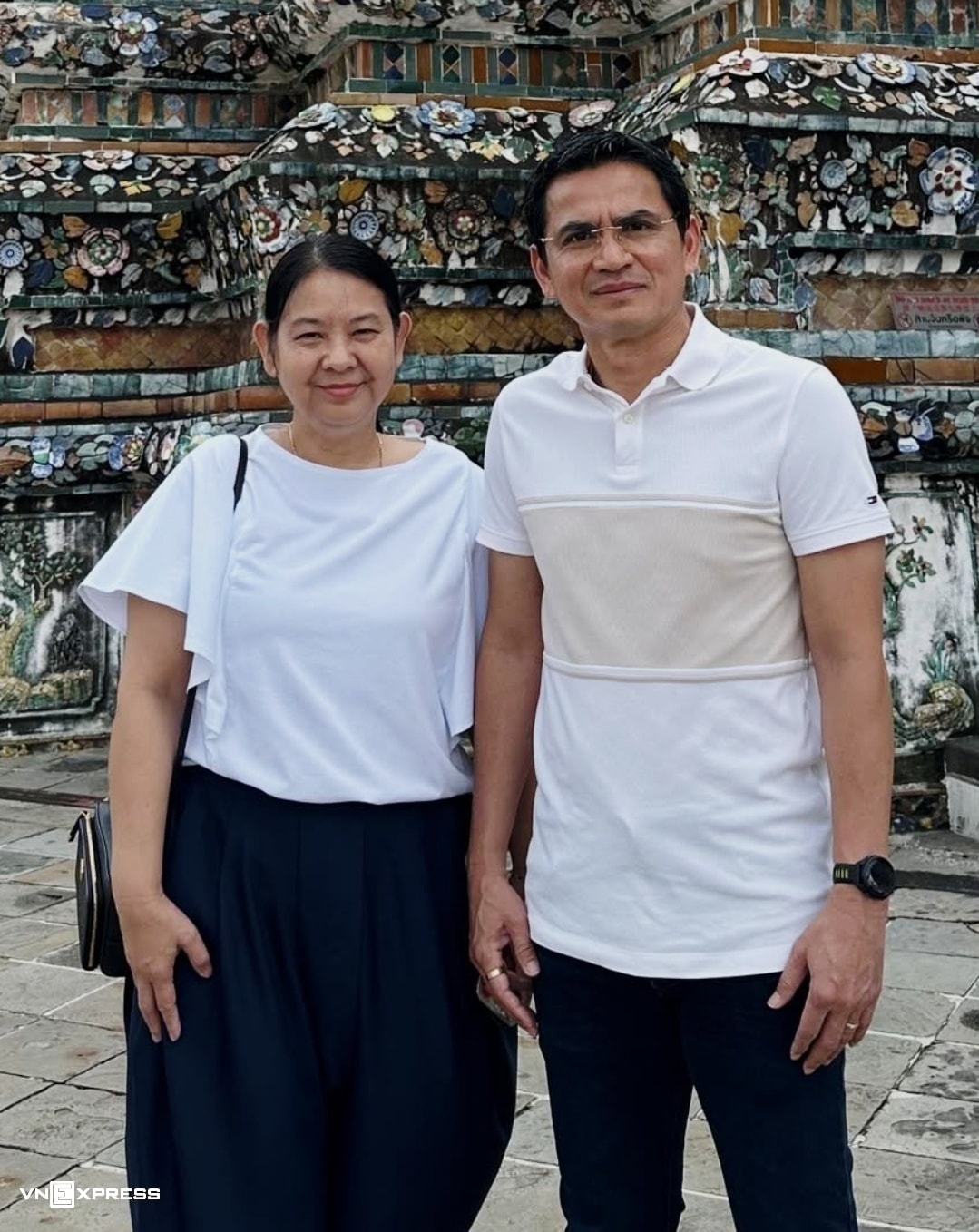 Kiatisuk và bạn đời diện giản dị đi uống cà phê với cầu thủ Minh Vương (phải) khi anh qua Thái Lan du lịch. Kiatisuk từng dẫn dắt Minh Vương thời ông làm huấn luyện viên câu lạc bộ Hoàng Anh Gia Lai.
