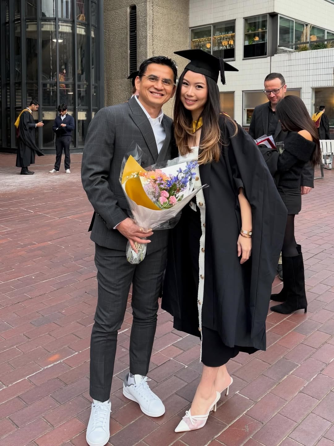 Kiatisuk phối trang phục phong cách lịch lãm với giày thể thao trong lễ tốt nghiệp Đại học Surrey (Anh) của con gái thứ hai - Proud, hồi cuối tháng 1. Ông cho biết tự hào khi con vượt nhiều khó khăn trong sáu năm du học Anh và sắp tới học thạc sĩ.